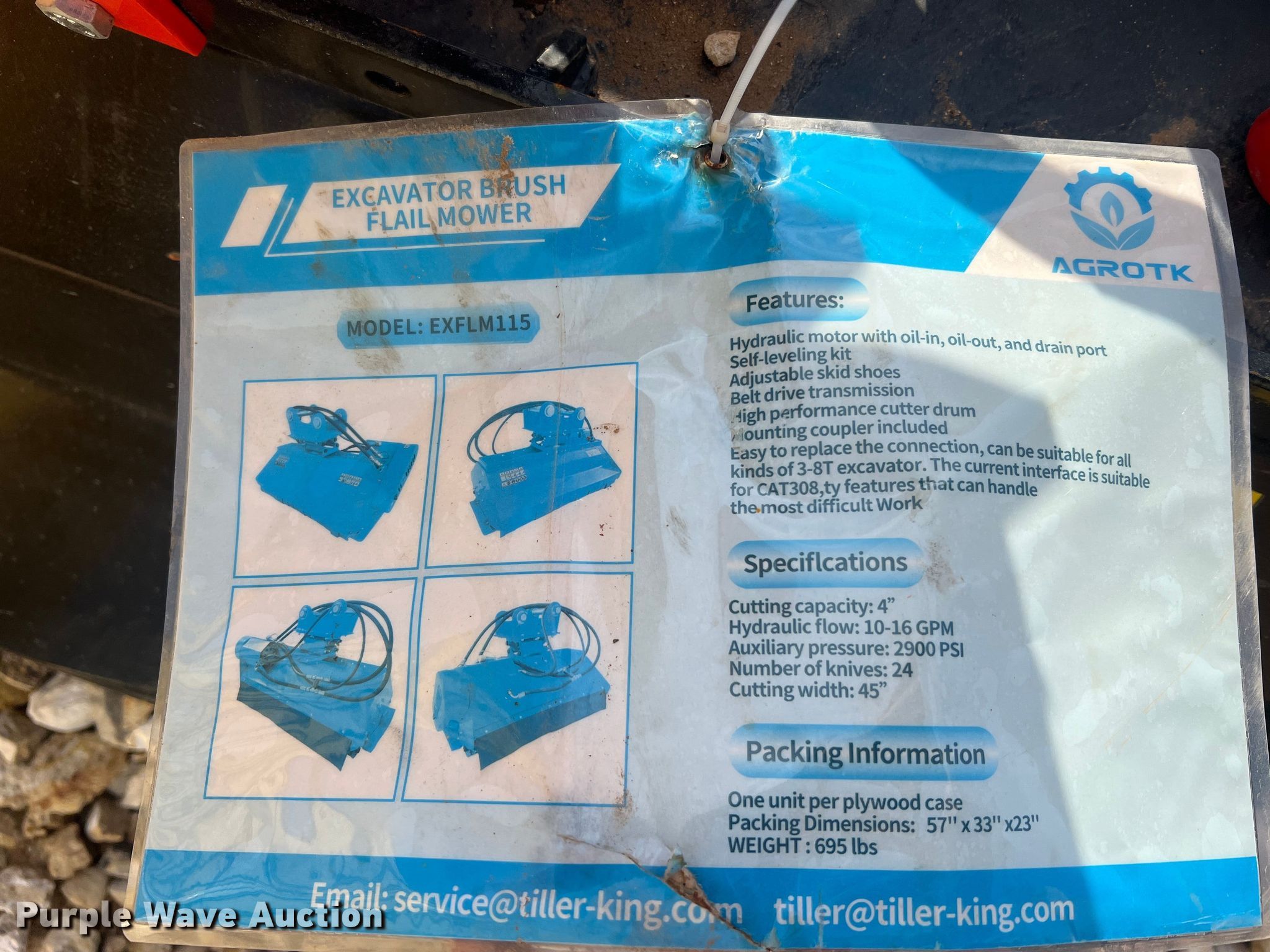 2022 Agrotk EXFLM115 excavator flail mower. Serial: EXFLM11522082002. Features Width: 45", Hydraulic lift. 1174 North Eastview Street. Eldon, MO 65026