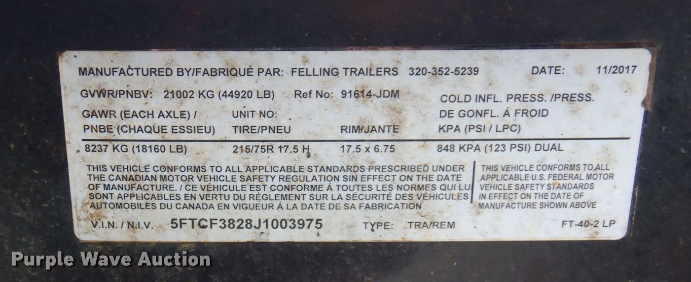 Purple Wave is selling a used Equip. Trailer in Minnesota. This item is a 2018 Felling FT-40-2LP equipment trailer with the following: VIN: 5FTCF3828J1003975
