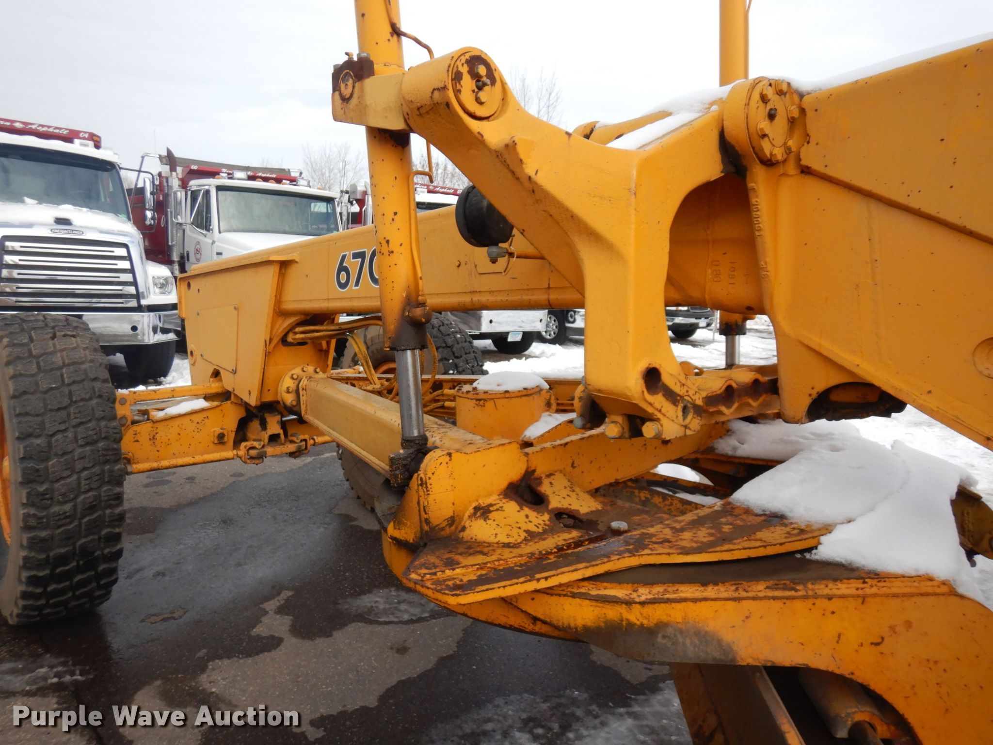1983 John Deere 670A motor grader. Hours: 2,101 on meter, Serial: DW670AX406680. Engine John Deere 6414TT, Serial: 607901T, Cylinders: 6, Fuel type: Diesel. Transmission Powershift, 8F - 4R. Chassis Differential lock. Operators station EROPS, Heat, Hydraulic control valves: 9. Features Moldboard: Tip control, Side shift, Moldboard total length: 12' 2". Tires Size: 14.00-24. Northern Asphalt Inc. Retirement Auction - Open inspection Mar. 25 and Mar. 27. 18533 Buchanan St. NE. East Bethel, MN 55011
