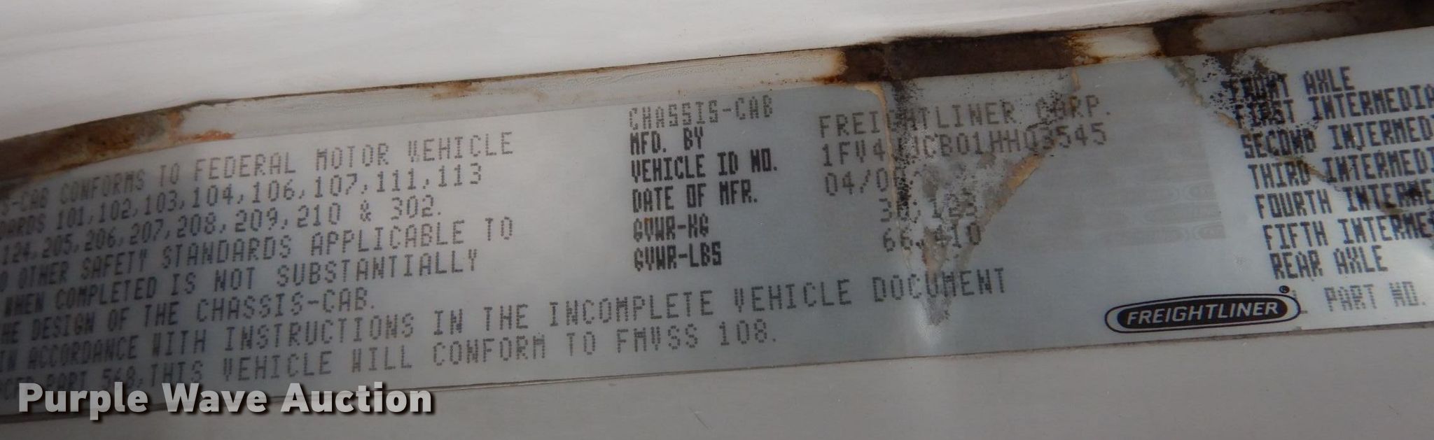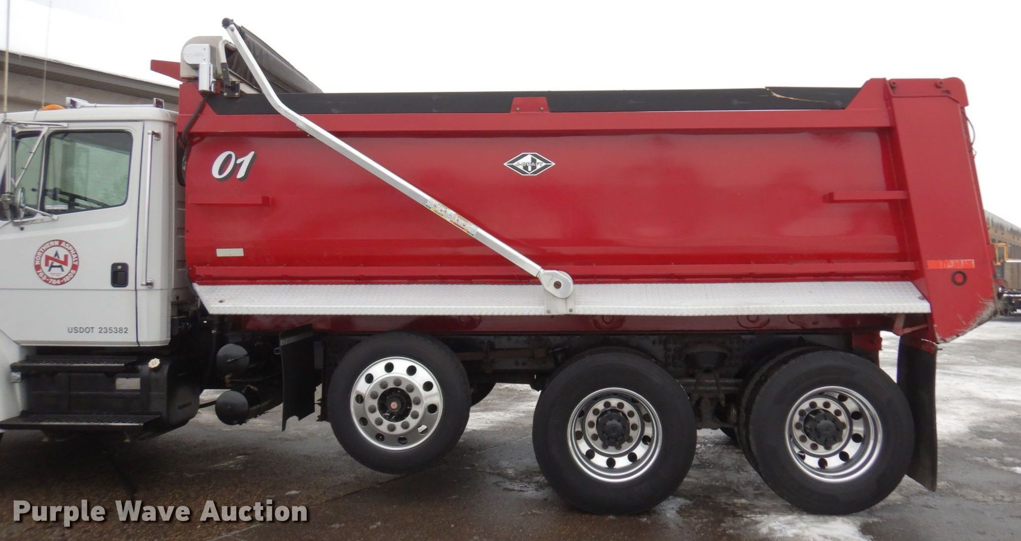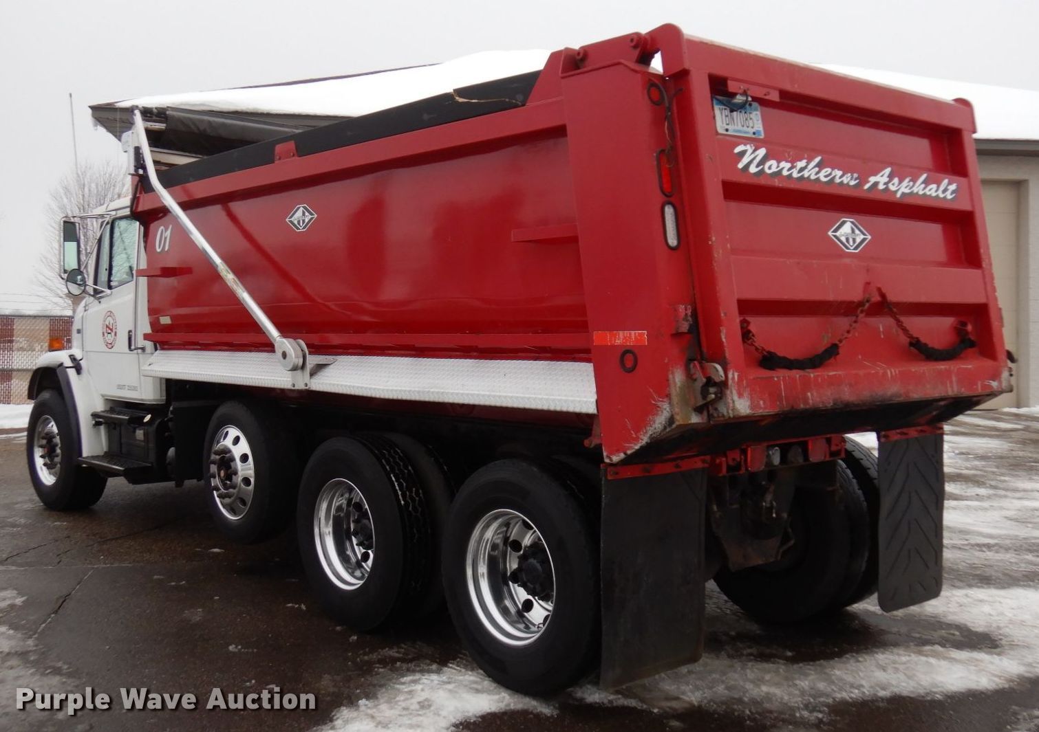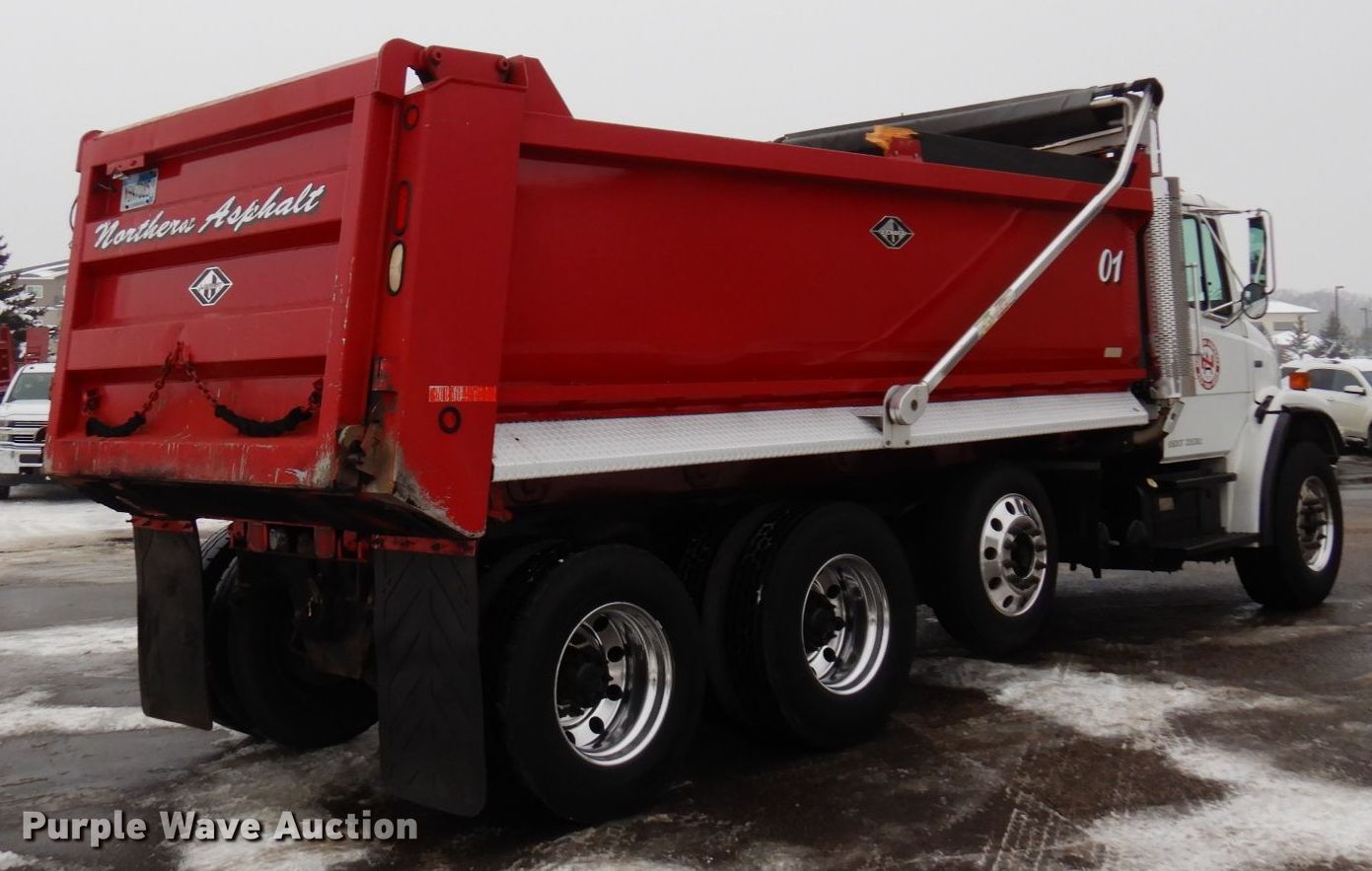 2001 Freightliner FL80 dump truck. Miles: 48,604 on odometer Approximately 200,000 total miles, Hours: 8,366 on meter, VIN: 1FV4JJCB01HH03545, Unit #: 01. Engine Caterpillar 3126, Cylinders: 6, Fuel type: Diesel. Transmission Eaton Fuller 8LL, Manual, Speed: 10. Chassis Axles: Triple, Pusher axle Steerable, Differential lock: Full, Suspension: Spring over walking beam, Brakes: Air, PTO, GVWR: 66,410 lbs FAWR: 16,000 lbs, IAWR: 20,000 lbs, RAWR: 20,000 lbs, Lift axle GAWR: 10,410 lbs. Interior AC, Heat, Heated mirrors, Cruise control, Brake controller. Features Dump bed 17' L x 8' 6" W, Side height: 42", Side board height: 5", Bed type: Steel, Bed vibrator, Roll tarp, Ram: Single , End gate: Air operated. Tires Front: 385/65R22.5, Rear: 11R22.5, Lift axle: 255/70R22.5. Notes Dash replaced at approx. 160,000 miles. View repairs. Minnesota title. Title distribution may be delayed up to 14 days from verification of funds. Northern Asphalt Inc. Retirement Auction - Open inspection Mar. 25 and Mar. 27. 18533 Buchanan St. NE. East Bethel, MN 55011