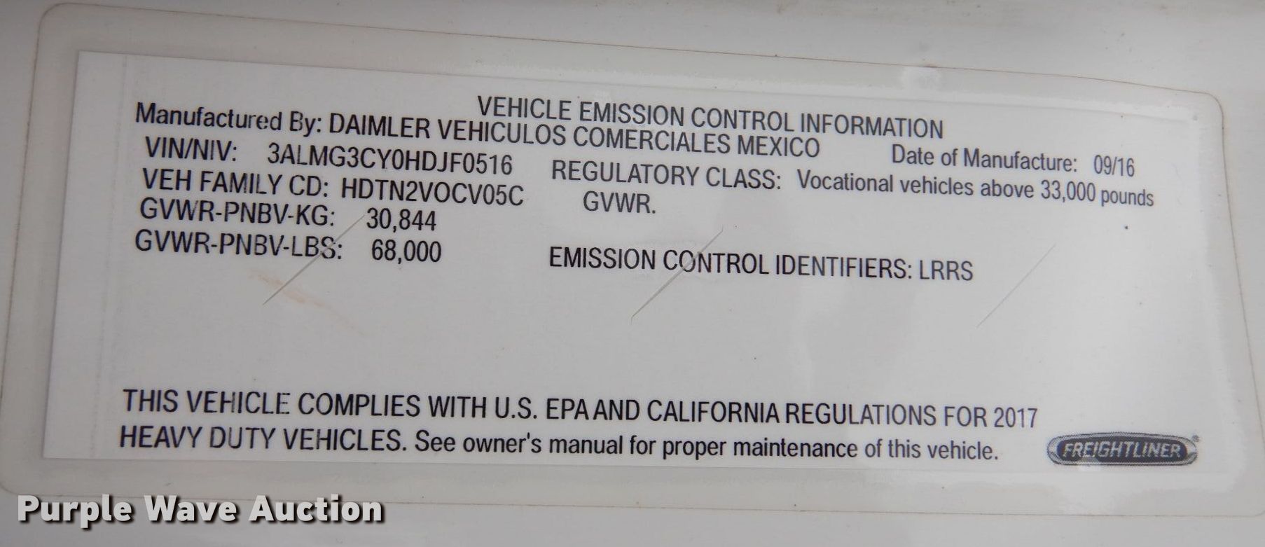 2017 Freightliner 114SD dump truck. Miles: 109,856 on odometer, Hours: 4,785 on meter, VIN: 3ALMG3CY0HDJF0516, Unit #: 06. Engine Cummins ISL9, Displacement: 8.9L, Cylinders: 6, Fuel type: Diesel. Transmission Allison, Automatic. Chassis Axles: Triple, Pusher axle Steerable, Differential lock: Full, Suspension: Spring over walking beam, Brakes: Air, PTO, GVWR: 68,000 lbs FAWR: 18,000 lbs, IAWR: 20,000 lbs, RAWR: 20,000 lbs, Lift axle GAWR: 11,020 lbs. Interior AC, Heat, Heated mirrors, Power windows, Cruise control. Features Dump bed J Craft, 16' L x 8' W, Side height: 42", Side board height: 10", Bed type: Steel, Bed vibrator, Roll tarp, Ram: Single , End gate: Air operated. Tires Front: 385/65R22.5, Rear: 11R22.5, Lift axle: 255/70R22.5. Minnesota title. Title distribution may be delayed up to 14 days from verification of funds. Northern Asphalt Inc. Retirement Auction - Open inspection Mar. 25 and Mar. 27. 18533 Buchanan St. NE. East Bethel, MN 55011