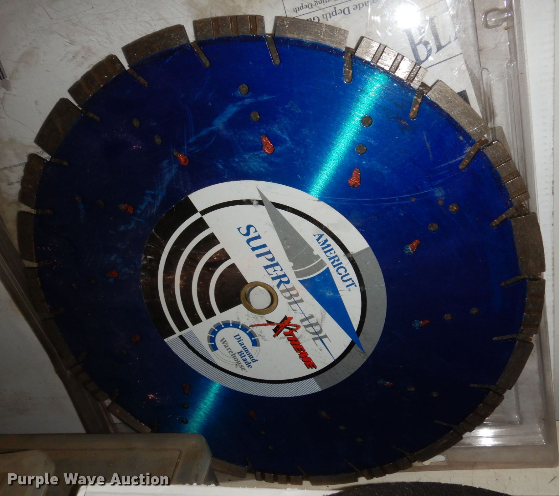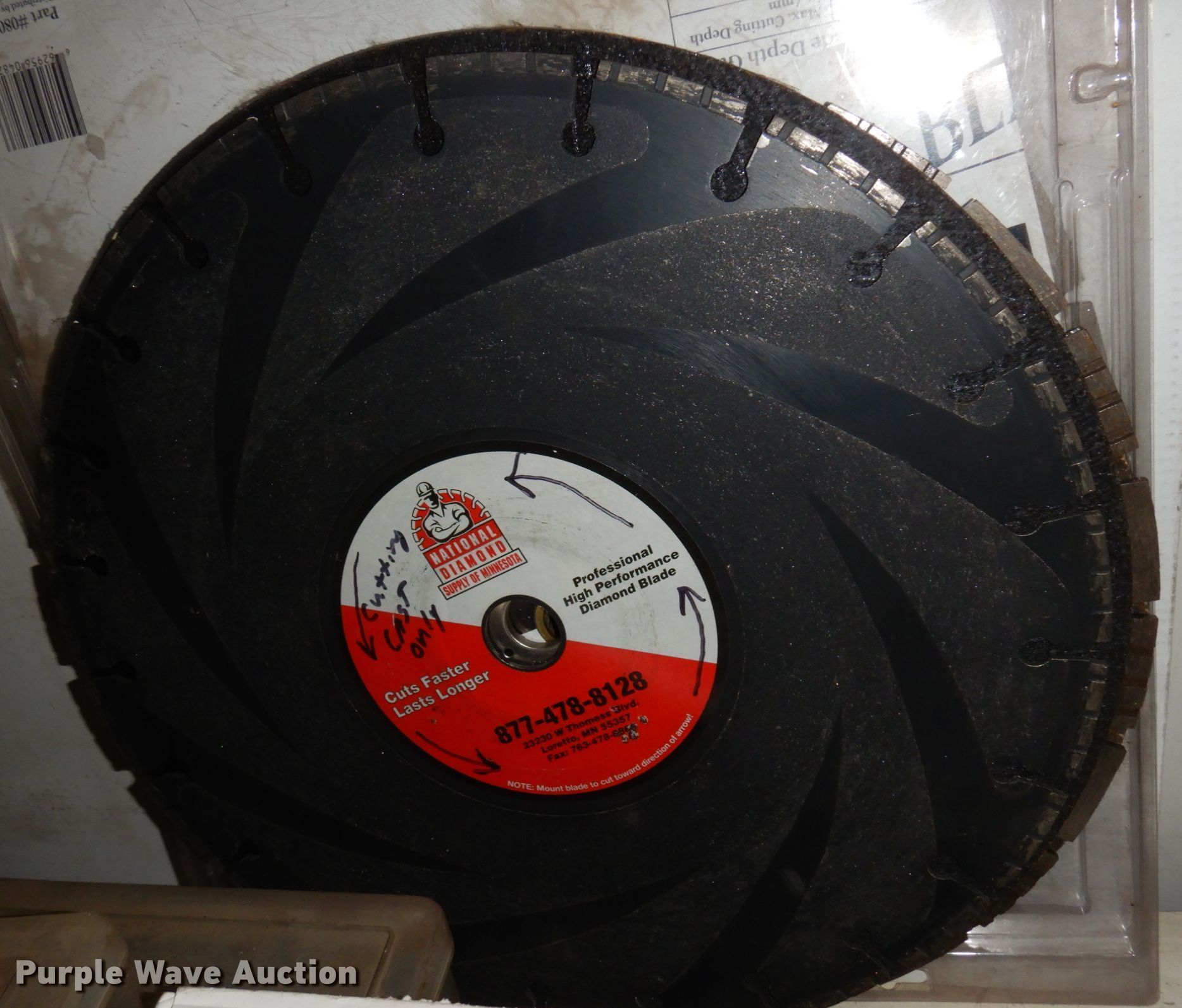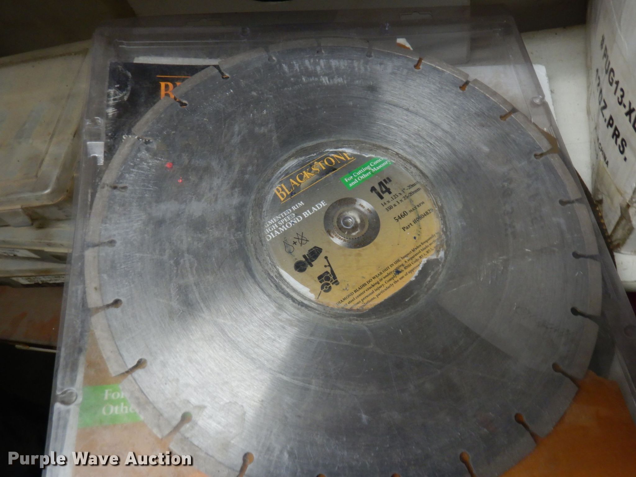 Tools. 14" diamond blades Unused, Safety gear, Light bulbs, Fuses relays, Battery charger, Parts bins, Hose clamps, Tools, Belts, Filters, Chains links, Vacuum pump, Springs, Striping paint, Tire patch repair. Northern Asphalt Inc. Retirement Auction - Open inspection Mar. 25 and Mar. 27. 18533 Buchanan St. NE. East Bethel, MN 55011