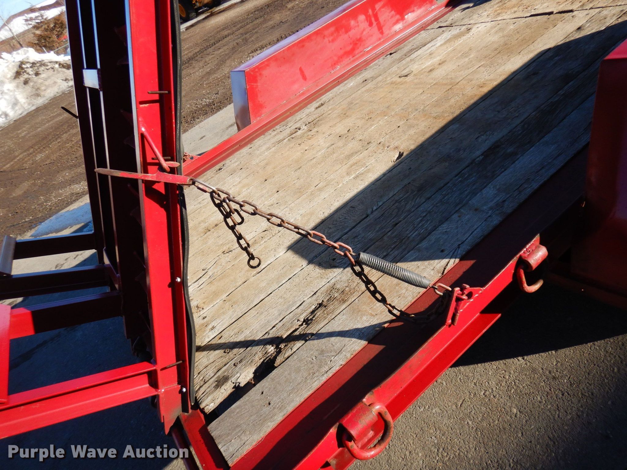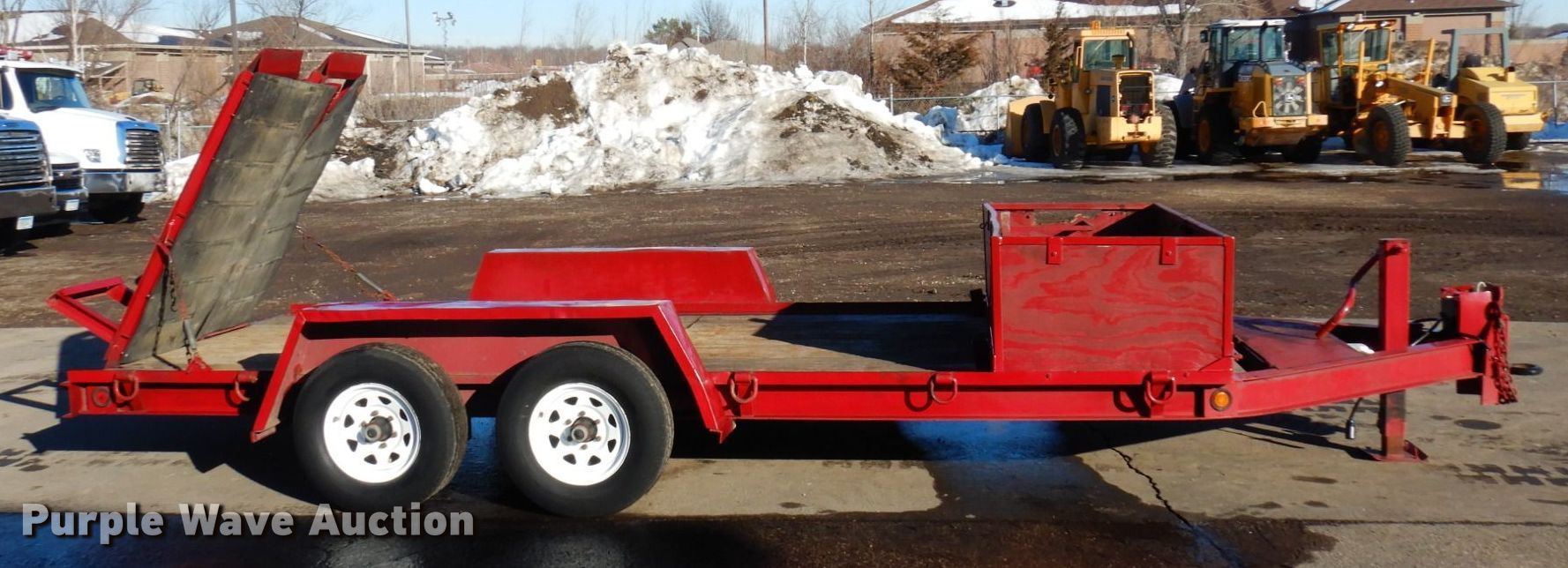 1997 Towmaster equipment trailer. VIN: 4KNUZ16Z5VL161365. Dimensions Overall: 22' 6" L x 101" W, Deck: 16' L x 82" W, Deck height: 1' 10", Ramps: Manual Length: 5' 4". Features Deck type: Wood. Chassis Hitch: Pintle, Landing gear: Single, Suspension: Spring, Brakes: Electric, Axles: Tandem. Tires Steel wheels, Size: ST225/75R15. Northern Asphalt Inc. Retirement Auction - Open inspection Mar. 25 and Mar. 27. 18533 Buchanan St. NE. East Bethel, MN 55011