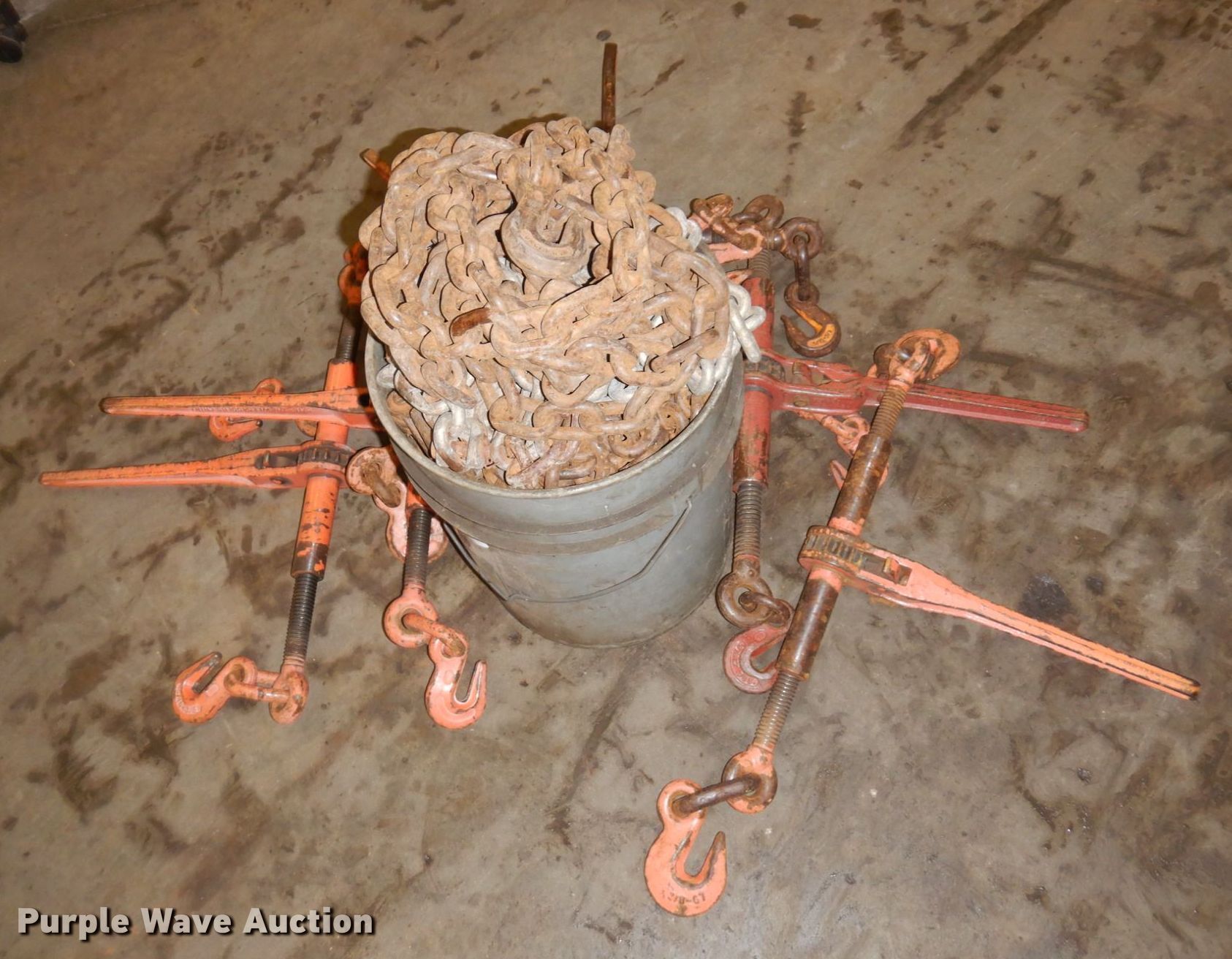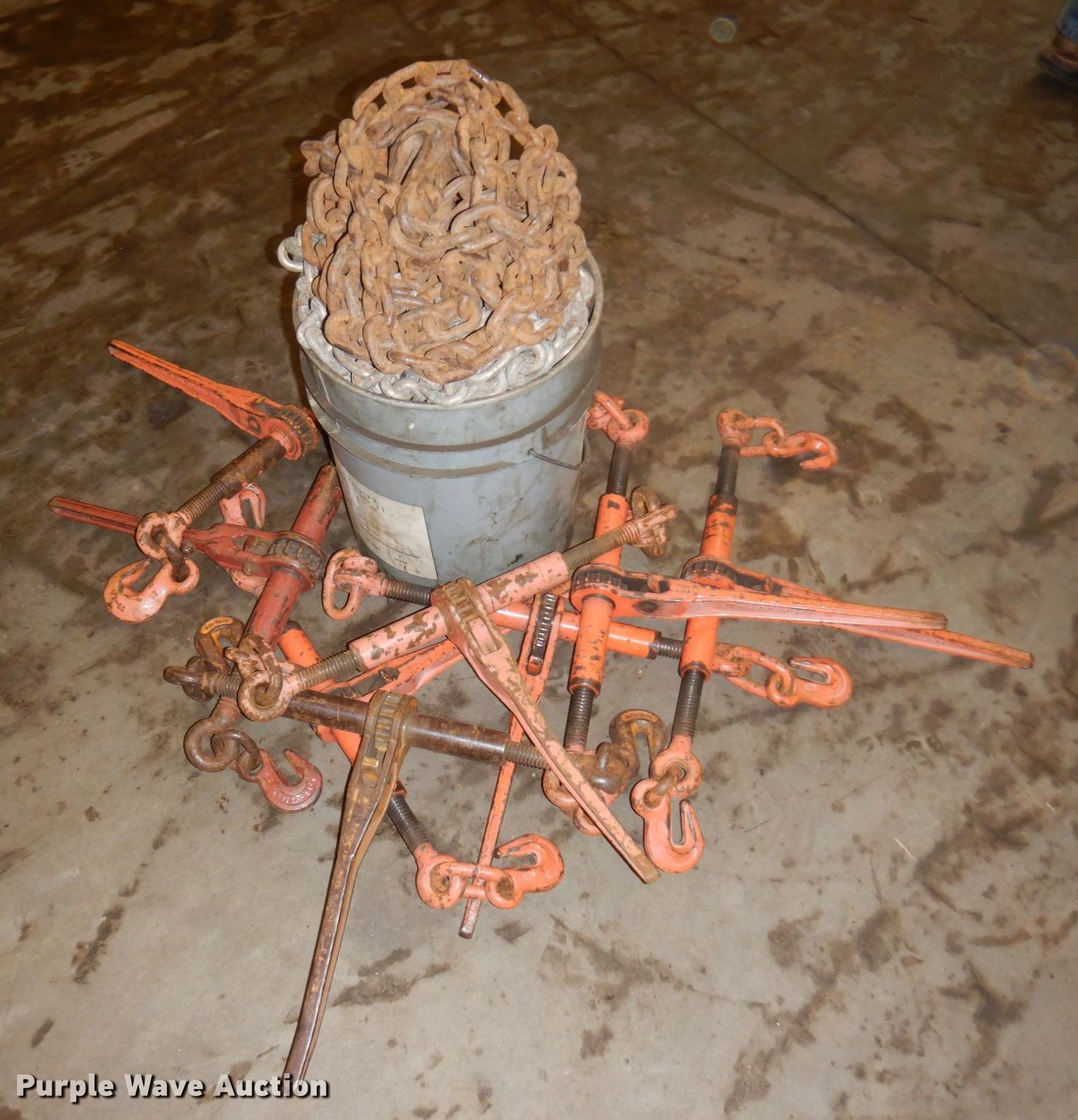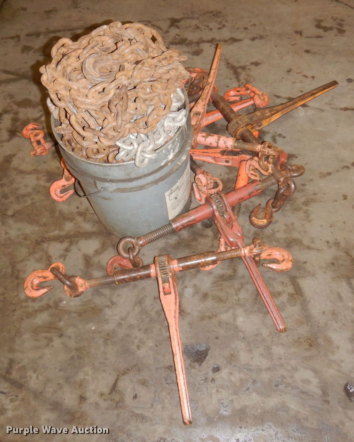 Purple Wave is selling a used Tools in Minnesota. This item is a Tools with the following: (8) chains, Approx. 14' L, (8) binders