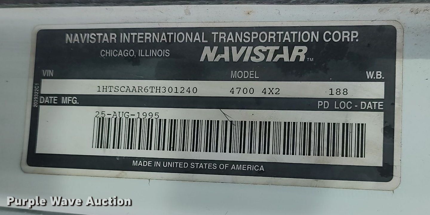 Purple Wave is selling a used Truck Chassis in Kansas. This item is a 1996 International 4700 truck cab and chassis with the following: Miles: 97,201 on odometer, Hours: 6,904 on meter, VIN: 1HTSCAAR6TH301240, Unit #: 0073