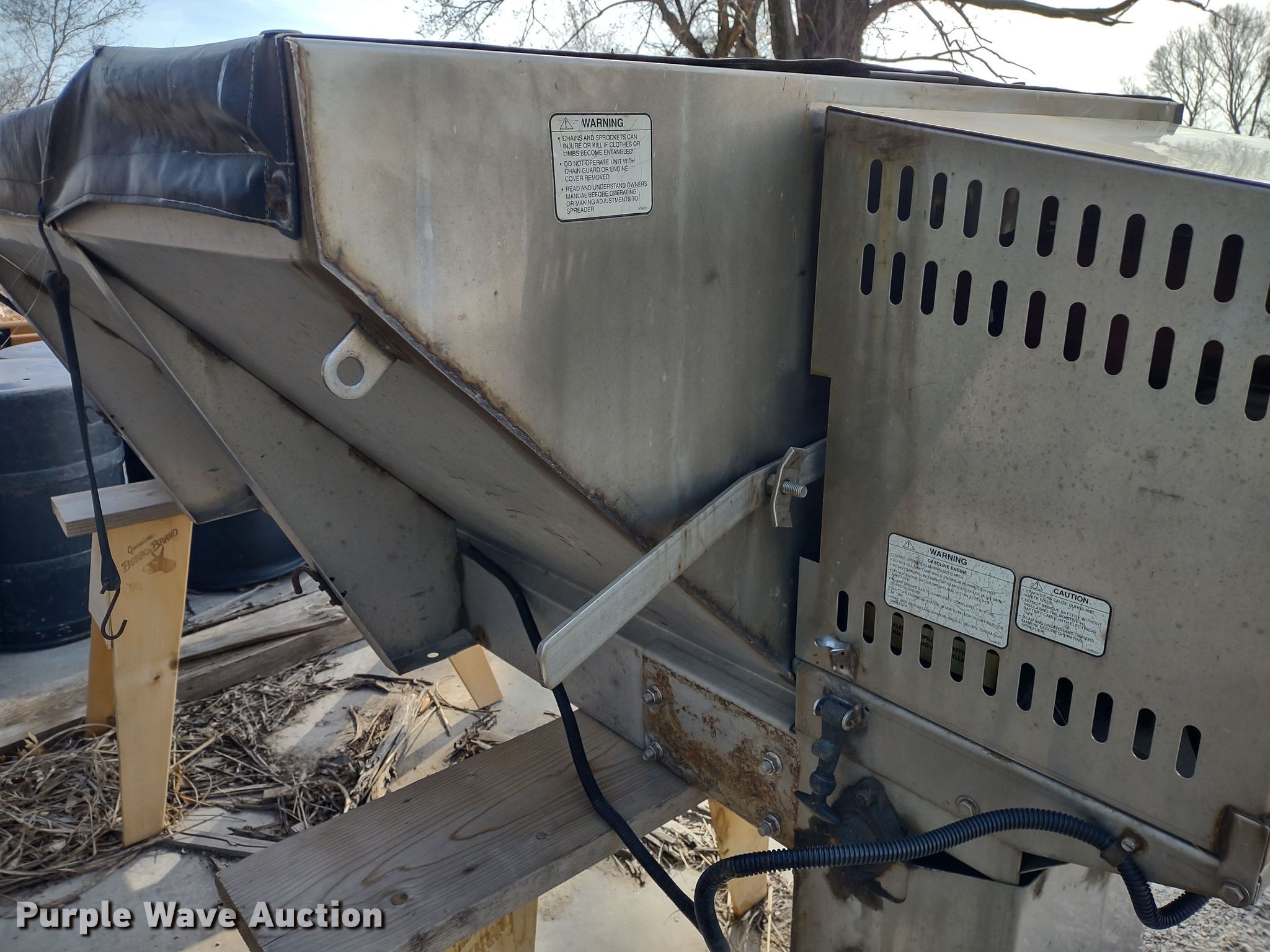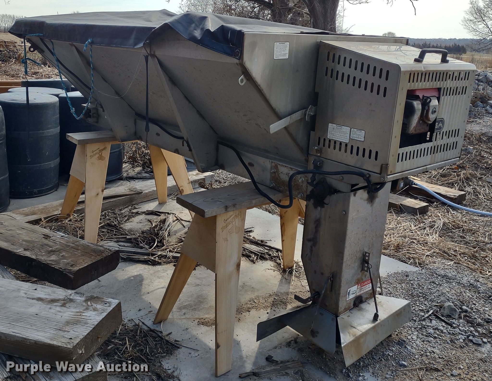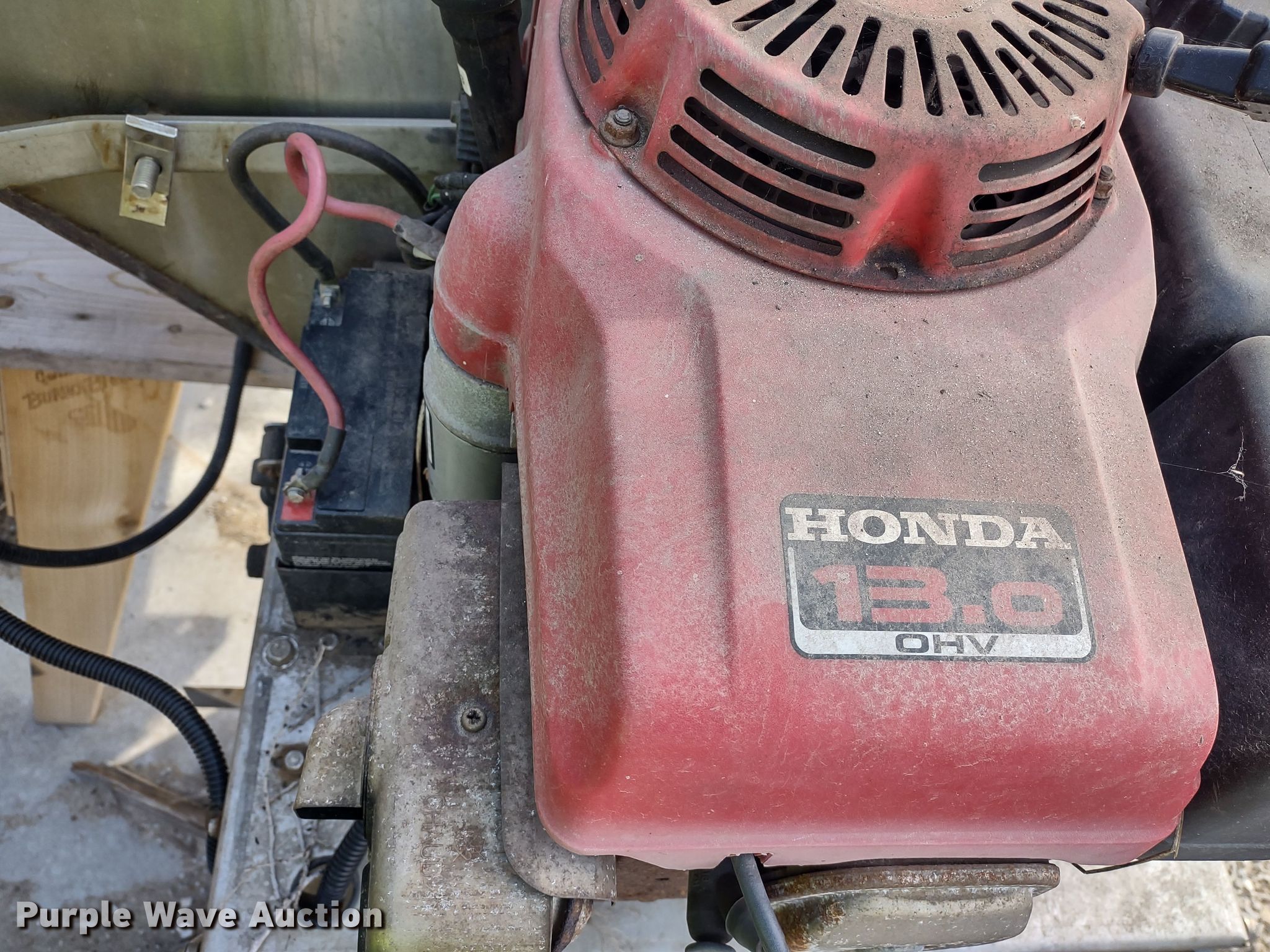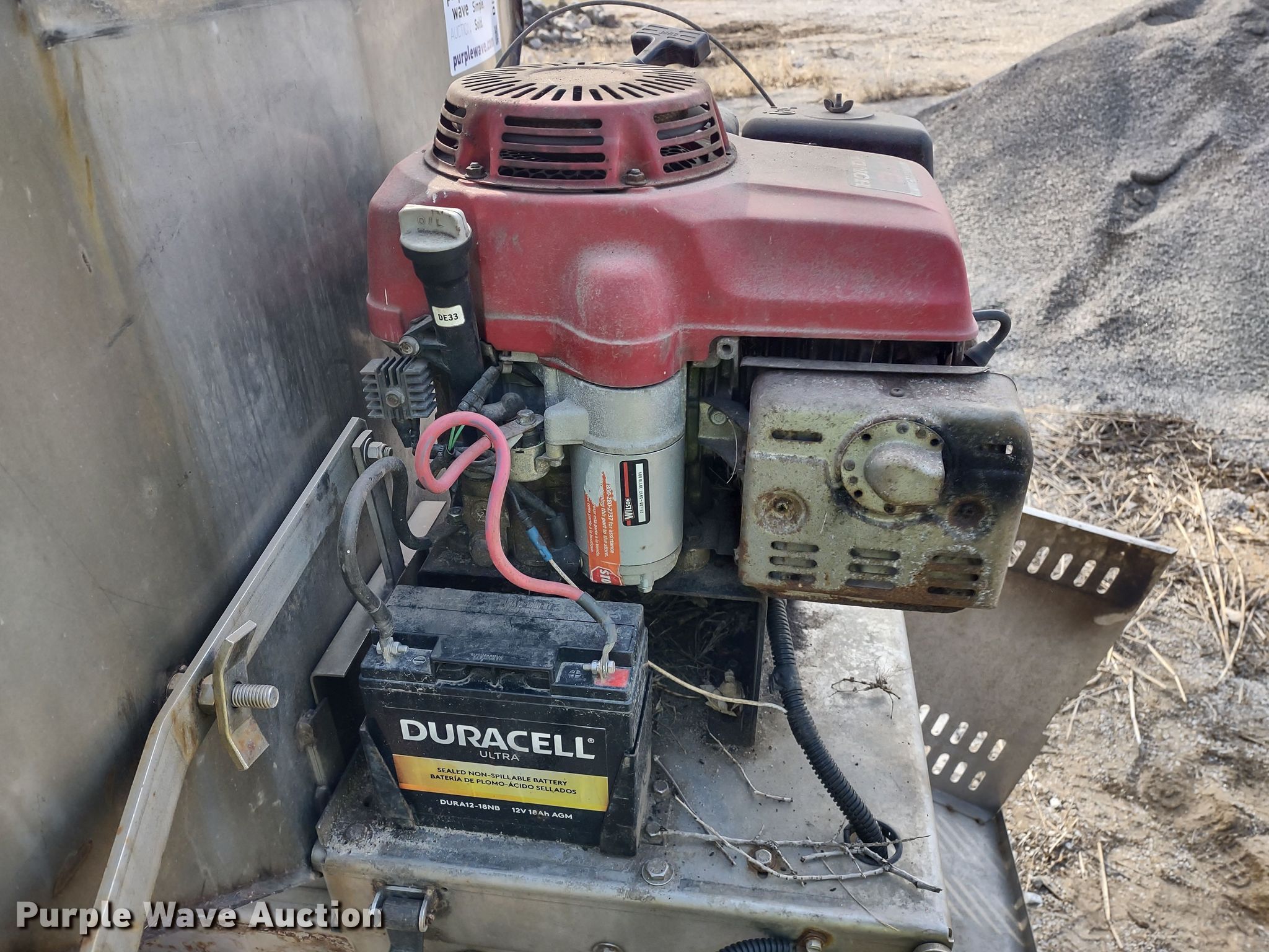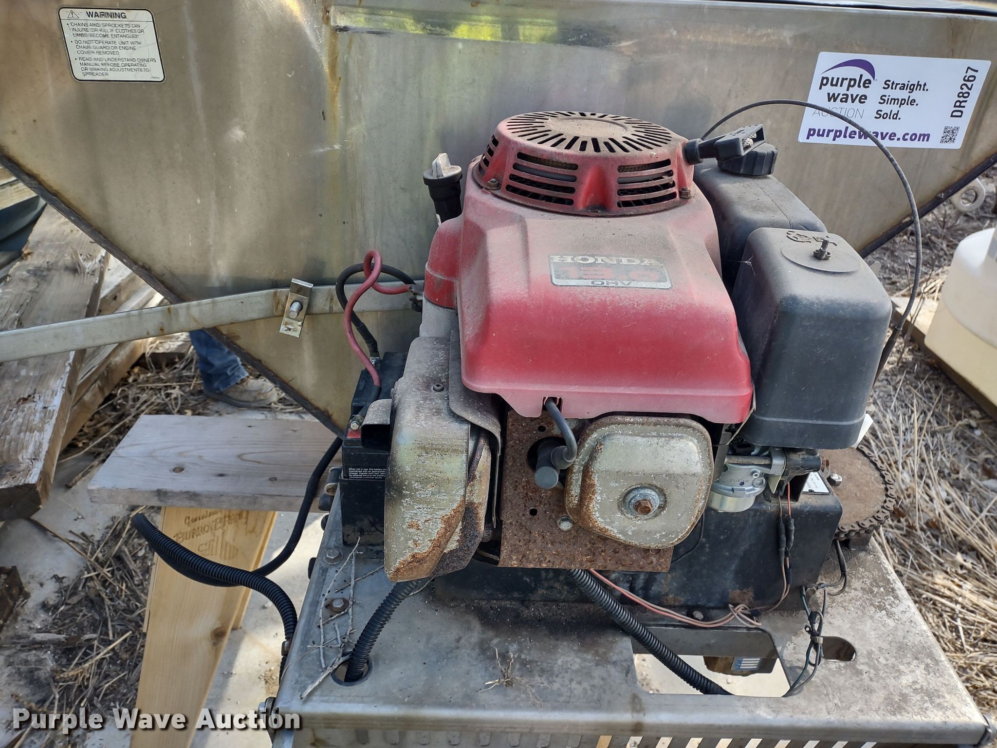 Buyers SCH096C spreader. Serial: 3121. Engine Honda, Cylinders: 2, Fuel type: Gas, HP: 13. Features 9' 6" L x 4' W x 3" W, Side height: 27", Chain driven floor. Olathe, KS 66061