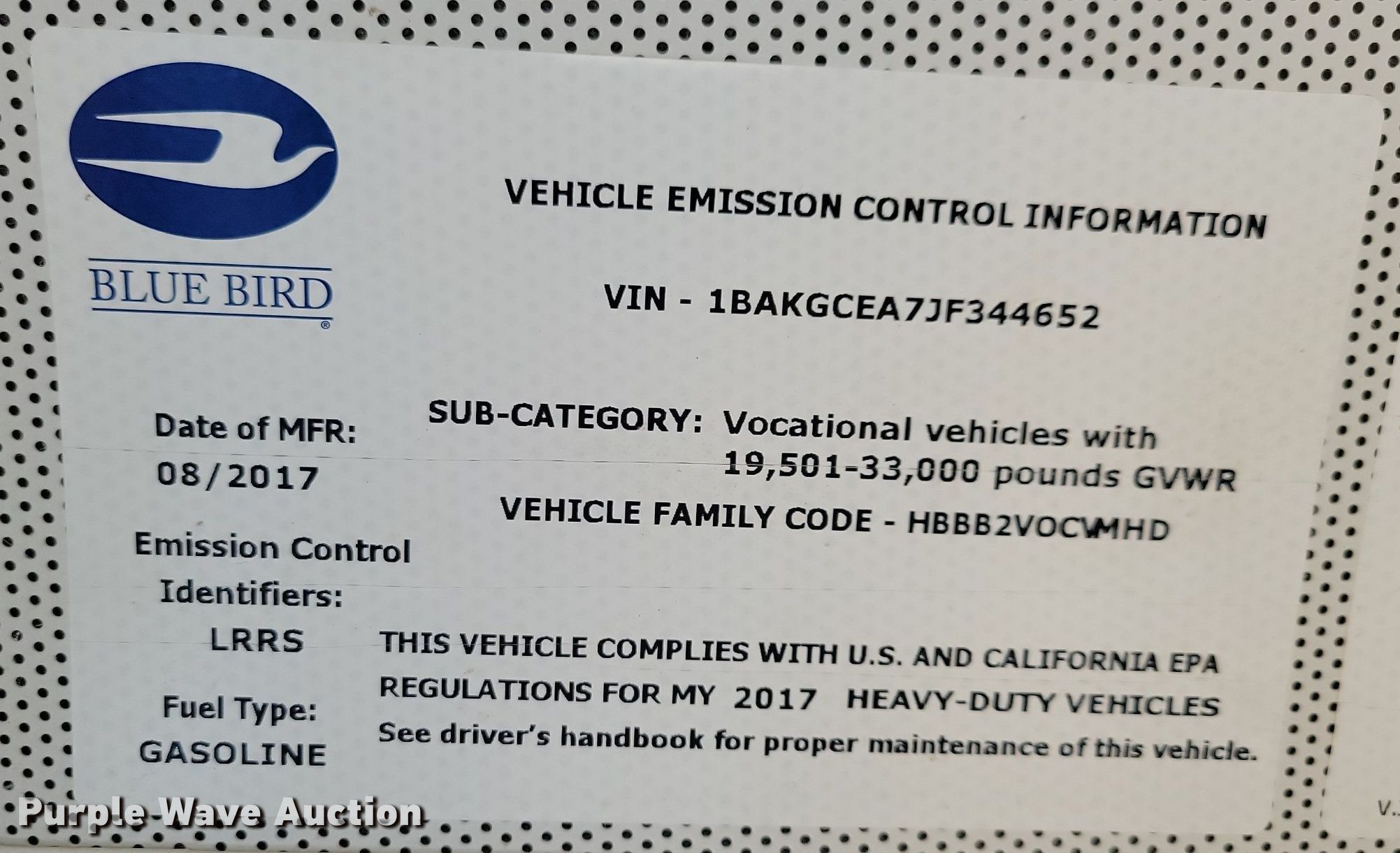 2018 Blue Bird school bus. Miles: 72,916 on odometer, VIN: 1BAKGCEA7JF344652, Unit #: 16. Engine Rousch, Serial: 10850, Displacement: 6.8L, Cylinders: 10, Fuel type: Gas. Transmission Automatic. Chassis Axles: Single, Suspension: Air, Brakes: Air, GVWR: 29,500 lbs. Interior AC, Heat, Heated mirrors, Cruise control, Passengers: 72, Child safety seats: 4, Adult seats: 20. Tires Size: 11R22.5. Notes Pedestrian safety devices will be removed or disconnected if purchased by a non-government entity. Iowa title. Seller is a government entity who will be assigning and distributing the title. Please contact the seller for distribution questions. Cam Community School District. 508 Cedar Street. Massena , IA 50853