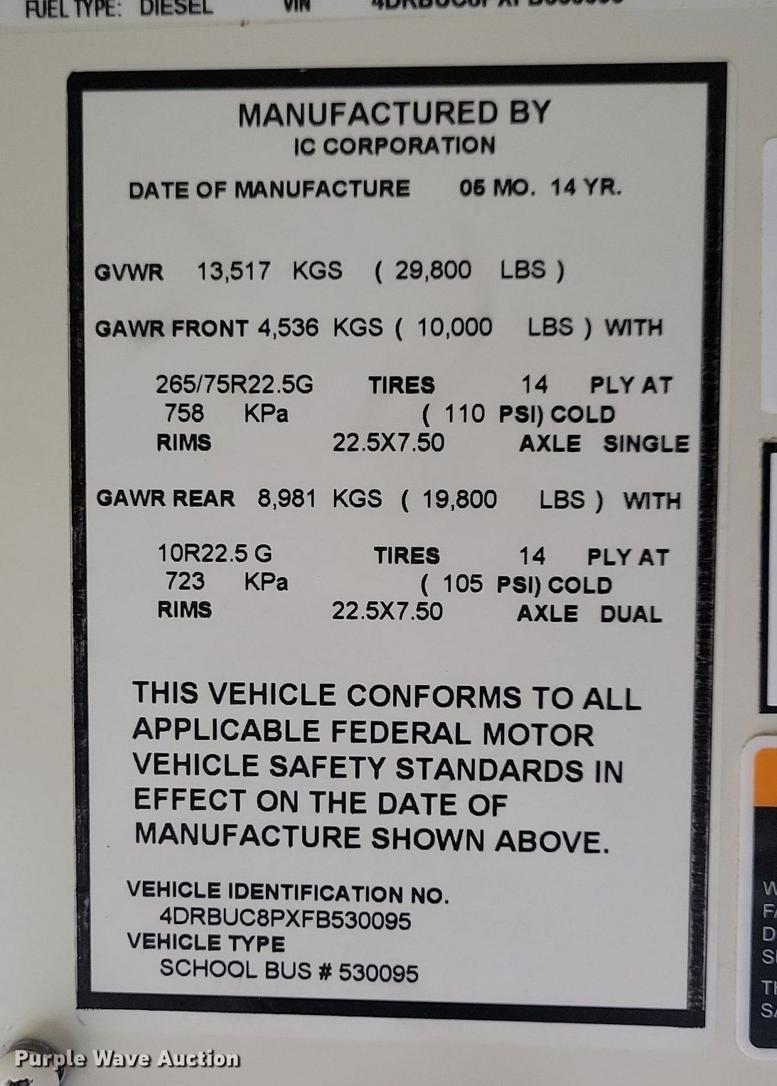 Purple Wave is selling a used Bus in Iowa. This item is a 2015 IC Corp school bus with the following: Miles: 95,313 on odometer, Hours: 4,066 on meter, VIN: 4DRBUC8PXFB530095, Unit #: 12