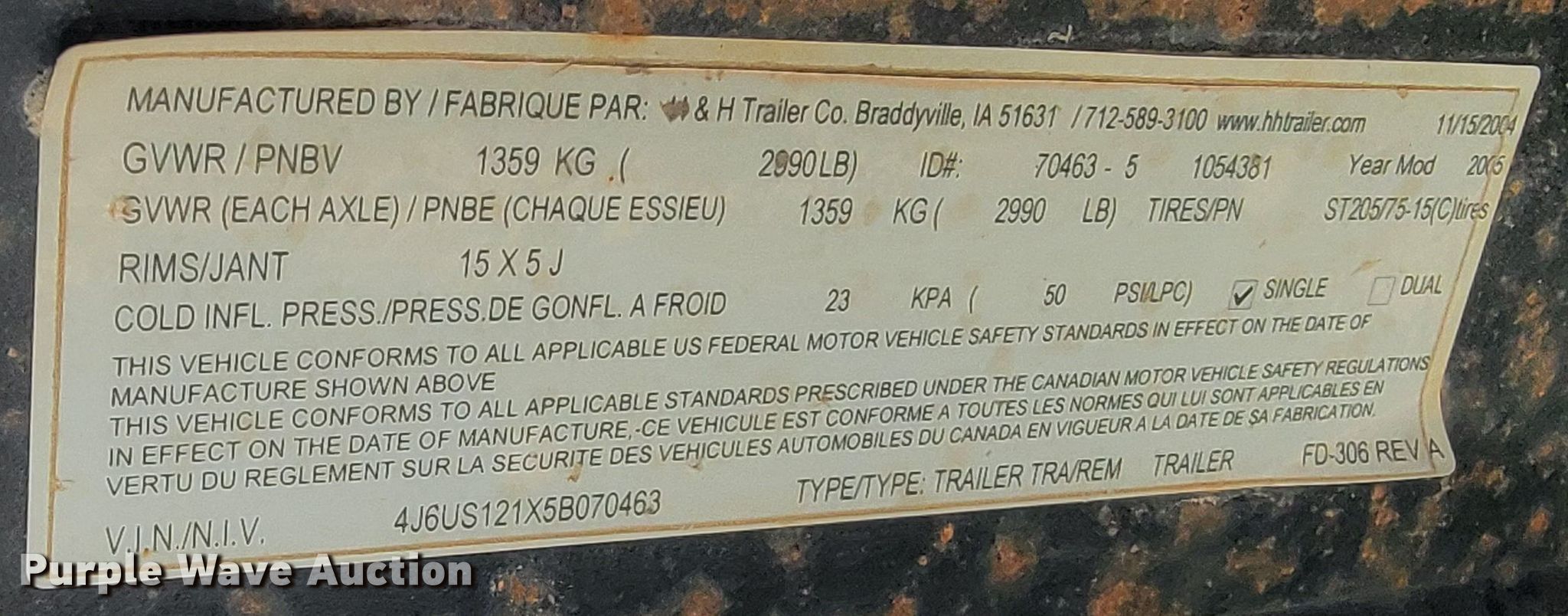 Purple Wave is selling a used Car or Utility Trailer in South Dakota. This item is a 2005 H&H utility trailer with the following: VIN: 4J6US121X5B070463, Unit #: 2525TR