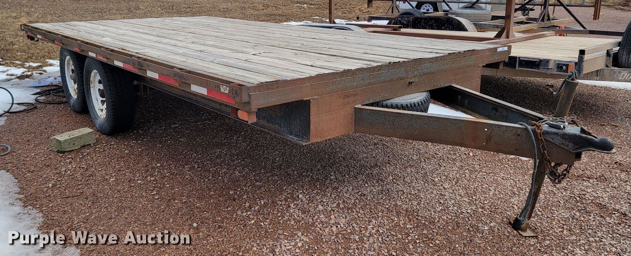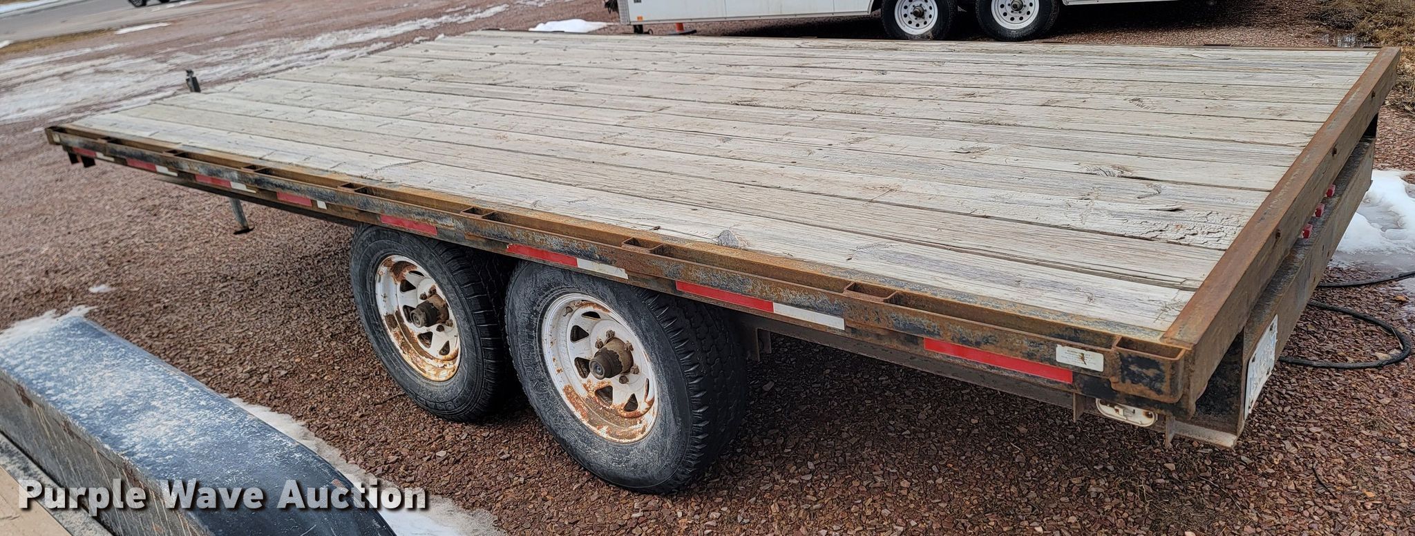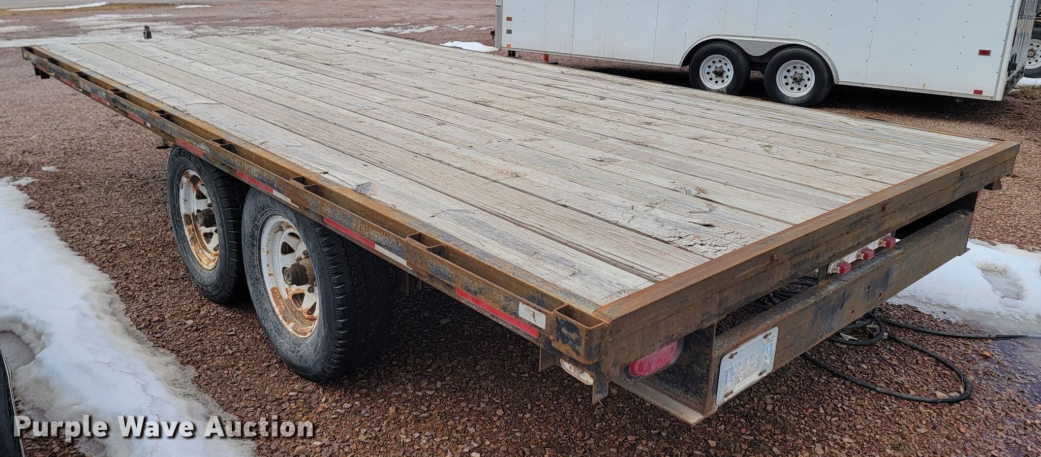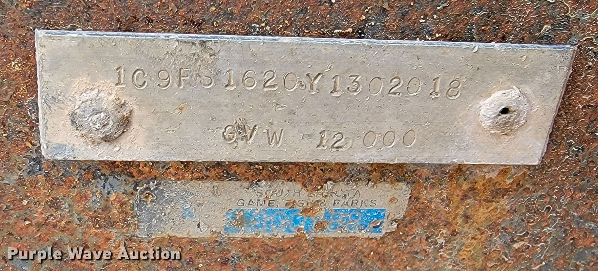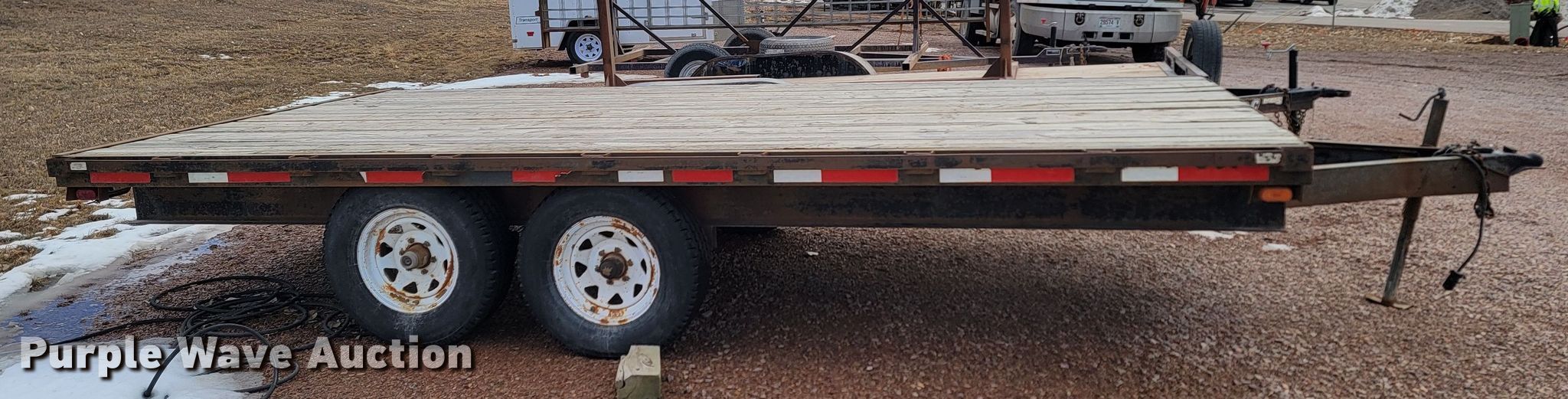 2000 Crab Point equipment trailer. VIN: 1C9FS1620Y1302018, Unit #: 2442TR. Dimensions Overall: 20' L x 101" W, Deck: 16' L x 101" W. Features Deck type: Wood. Chassis Ball hitch: 2 5/16", Landing gear: Single, Suspension: Spring, Brakes: Electric, Axles: Tandem. Tires Steel wheels, Size: LT245/75R16. Notes Non-operational brake lights, Non-operational brakes. South Dakota title. State of South Dakota Property Management. 4130 Adventure Trail. Rapid City, SD 57702