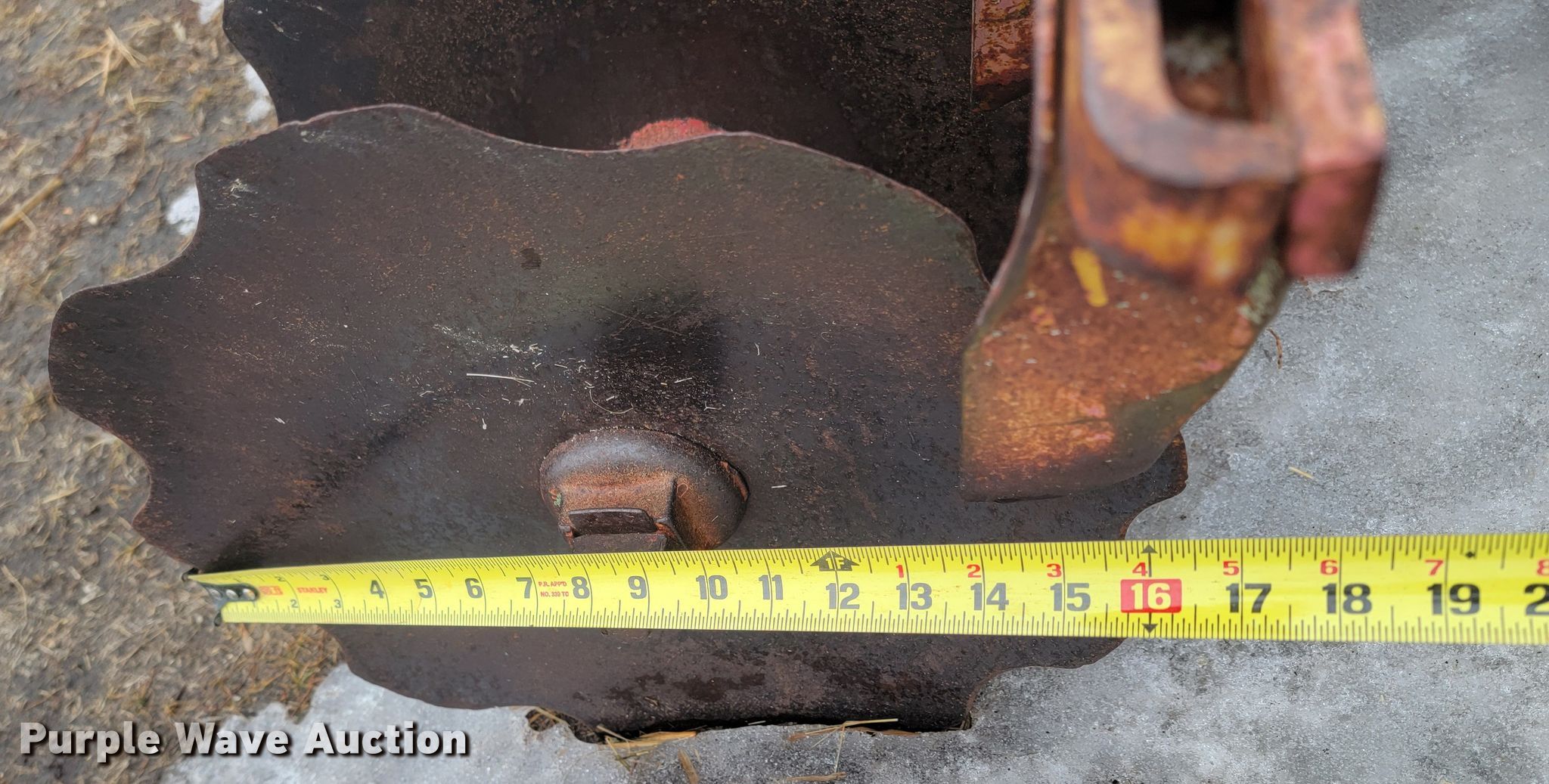 Ford Series G disk. Overall width: 7' 6", Serial: 7829, Unit #: SDSU03. Features Front blades Diameter: 16", Spacing: 8", Rear blades Diameter: 18", Spacing: 7.5", Disk scrapers, Attachments Hitch: Three point. State of South Dakota Property Management. 29974 University Road. Beresford, SD 57004