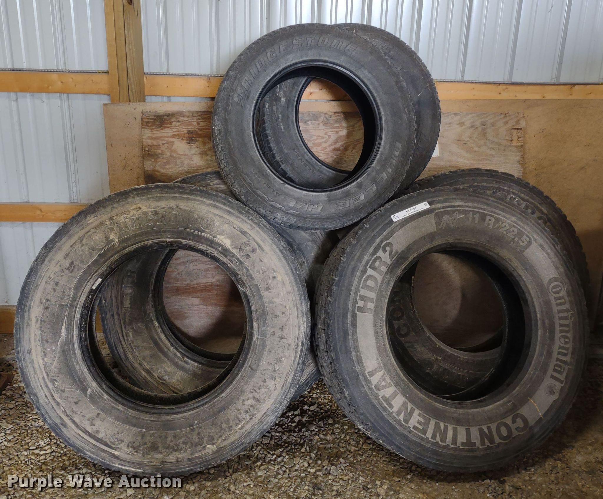 Purple Wave is selling a used Fleet Tires in Kansas. This item is a (6) tires with the following: (4) Continental HDR2 11R22.5, (2) Bridgestone Dueler 255/65R18
