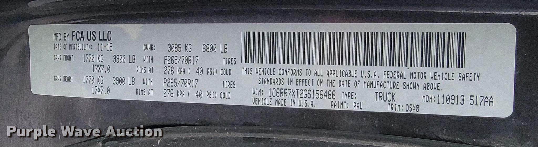 Purple Wave is selling a used 1/2 Ton Pickup or Van in South Dakota. This item is a 2016 Dodge Ram 1500 Crew Cab pickup truck with the following: Miles: 165,531 on odometer, VIN: 1C6RR7XT2GS156486, Unit #: CH317