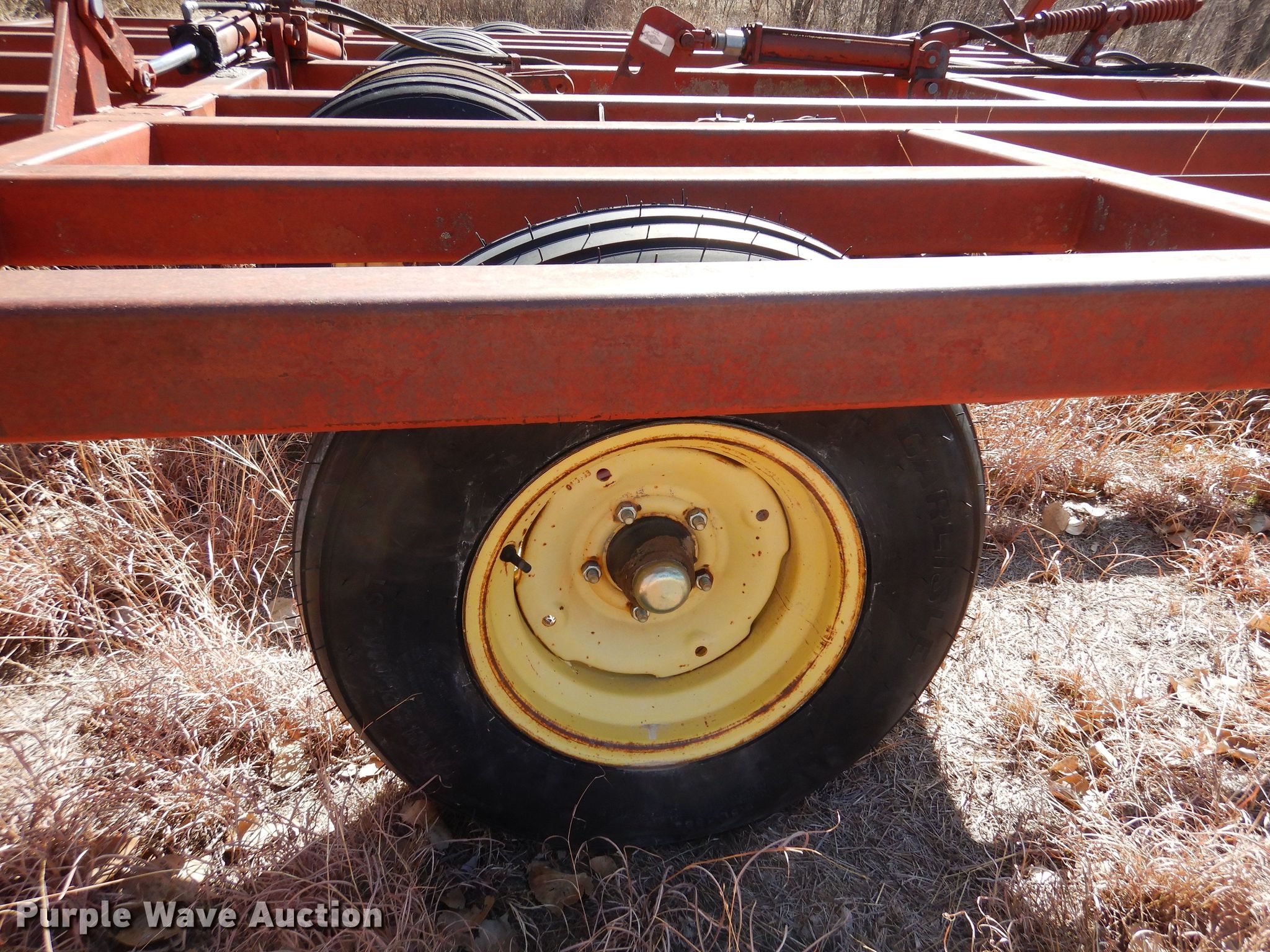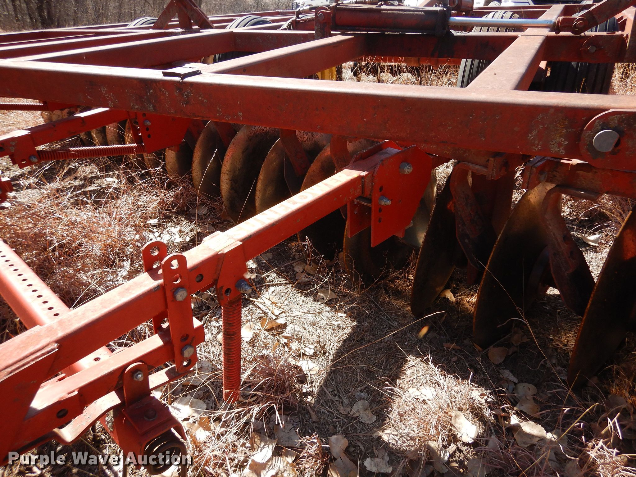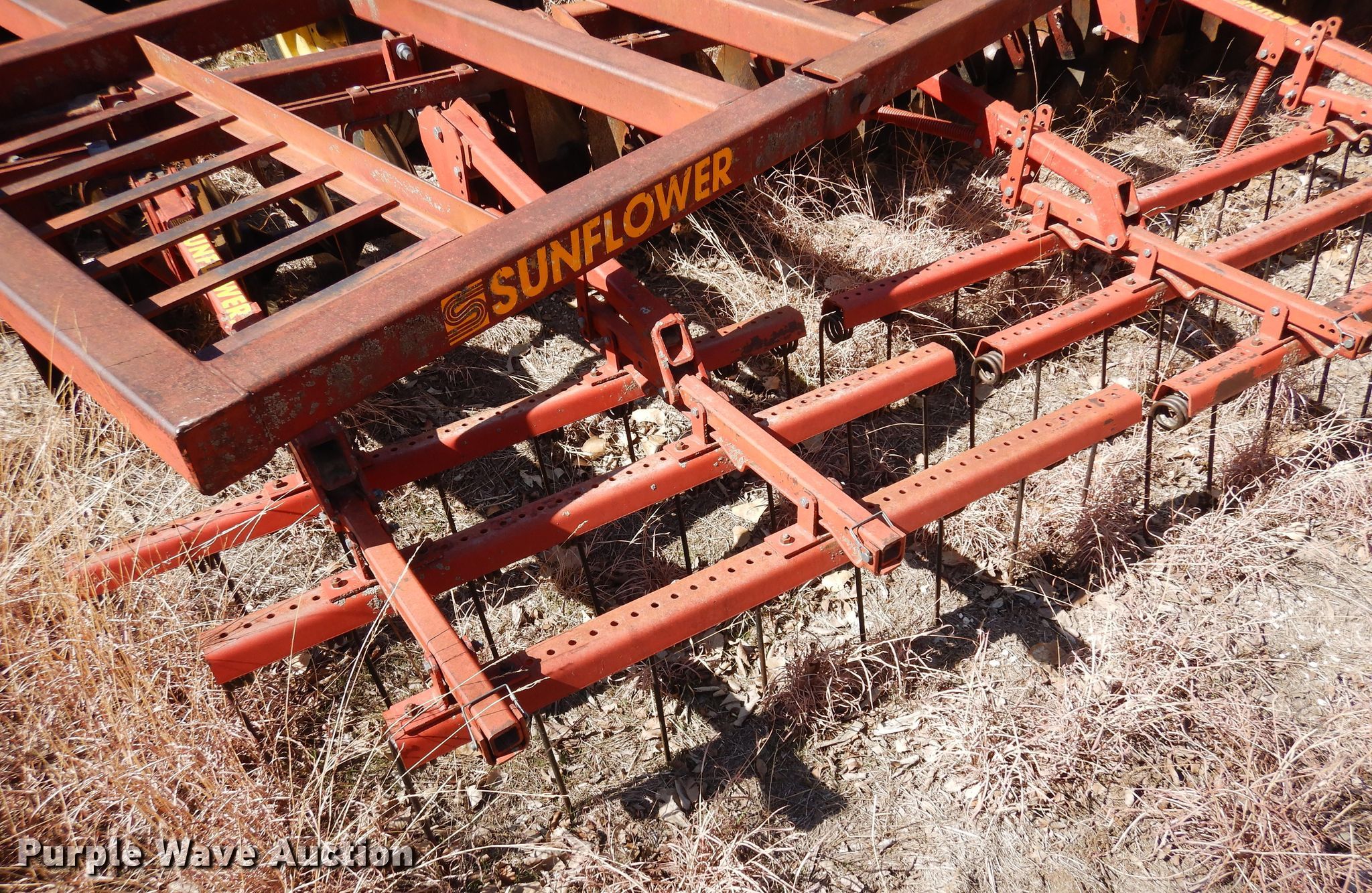 Sunflower 5-18 off-set disk. Overall width: 18', Serial: 73035. Features Front blades Diameter: 20", Spacing: 8", Rear blades Diameter: 20", Spacing: 8", Disk scrapers, Operation Hydraulic lift, Hydraulic fold, Leveler: Manual, Walking tandem axle, Attachments Tine harrow. Tires Tire size: 9.5L-15SL, Gauge wheels. Notes Left wing cylinder disconnected. Sweetwater Ranch. 2398 Codell Ave. Victoria, KS 67671