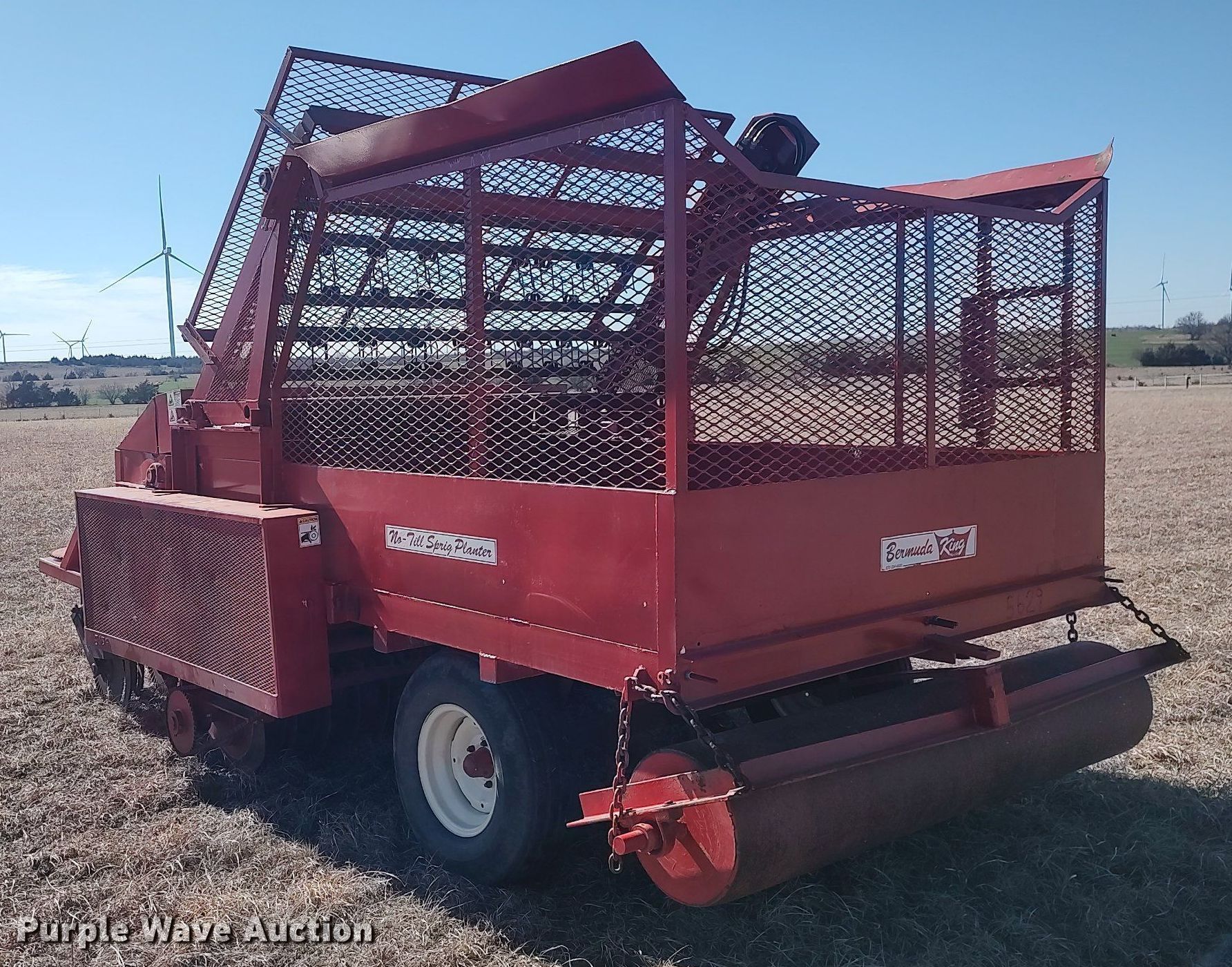 Bermuda King 8/96/N C-TILL no-till planter. Width: 8', Row units: 14, Row spacing: 6", Serial: 5629. Features Seed delivery Bulk fill system, Capacity: 220 bushels, Row units Meter drive: Ground, No-till coulters, Disk openers: Single , Closing system: Single, Hydraulic lift. Tires Transport tire size: 11L-15. Deep Roots Bermuda Spreading. Newkirk, OK 74647