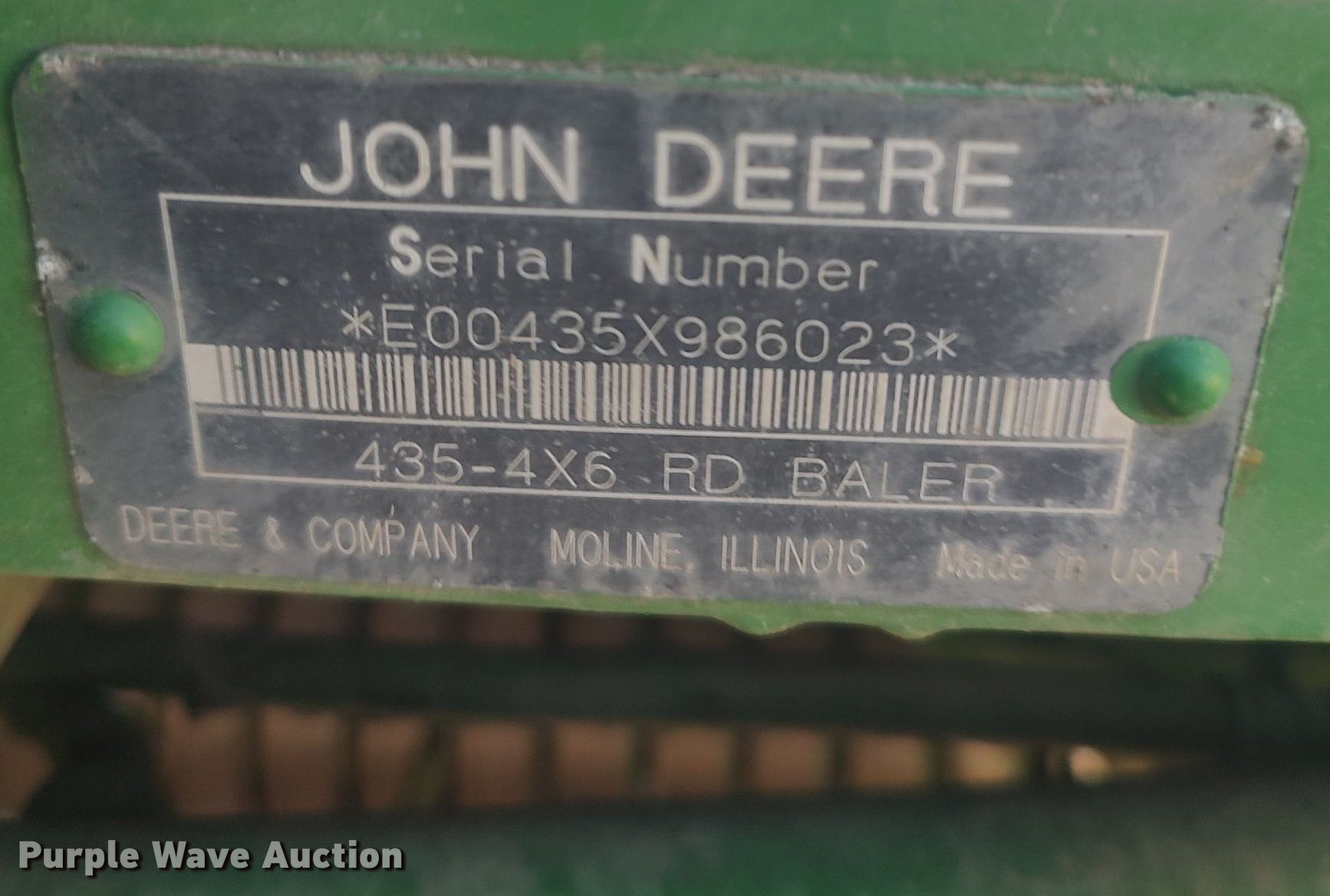 Purple Wave is selling a used Round Baler in Kansas. This item is a John Deere 435 round baler with the following: Bale count: 57, Serial: E00435X986023