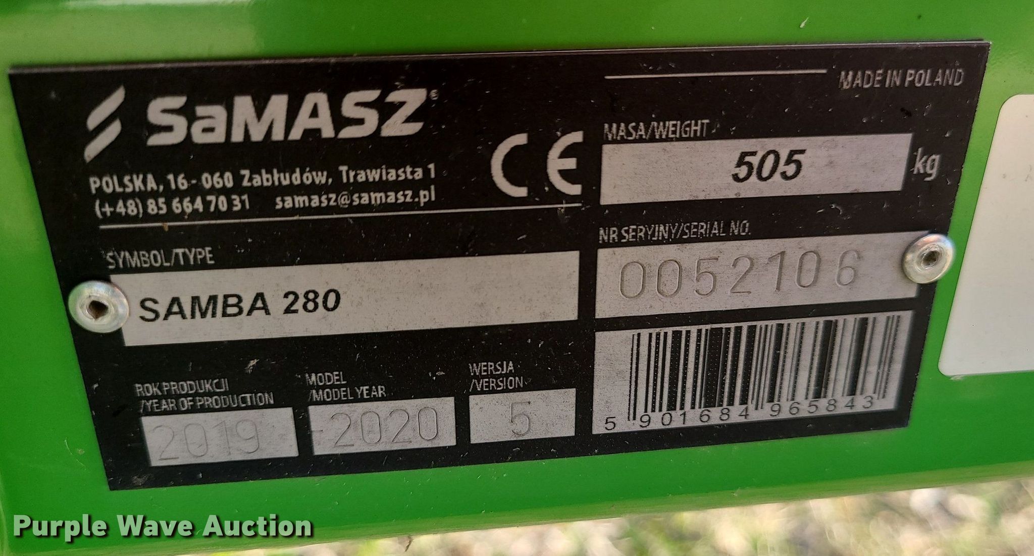 2020 Samasz Samba 280 disc mower. Serial: 0052106. Features Width: 9', Hydraulic lift, PTO: 540. Notes Unused, Tarp included but not installed. Ag Solutions Group. 702 East 1st Street. Concordia, MO 64020