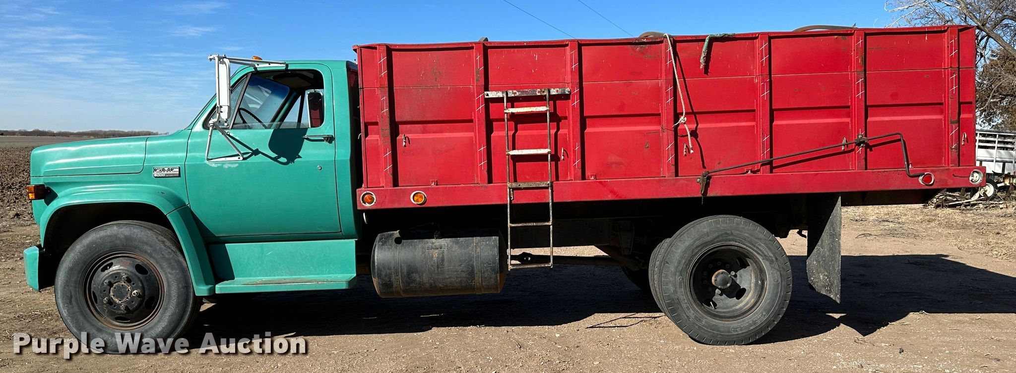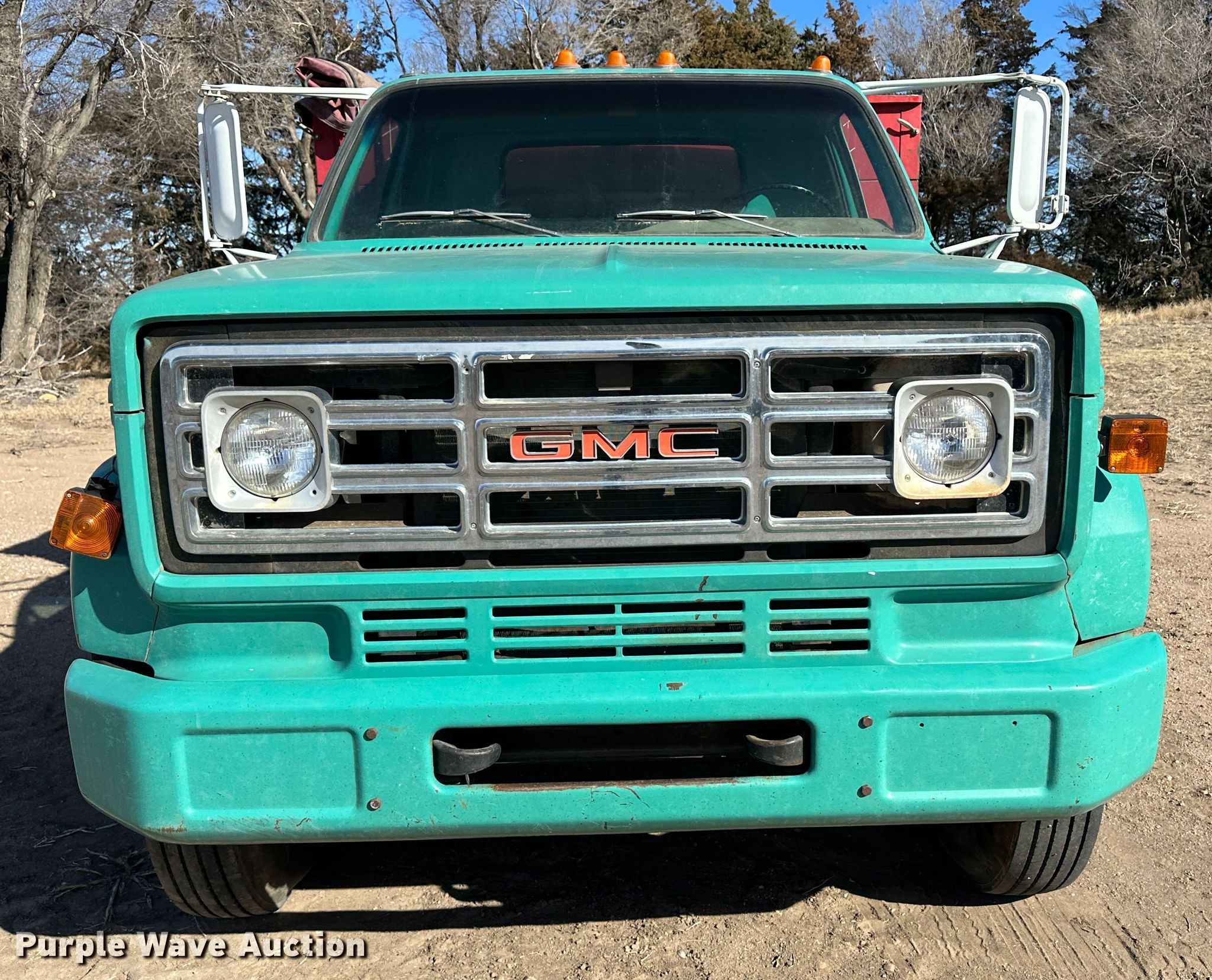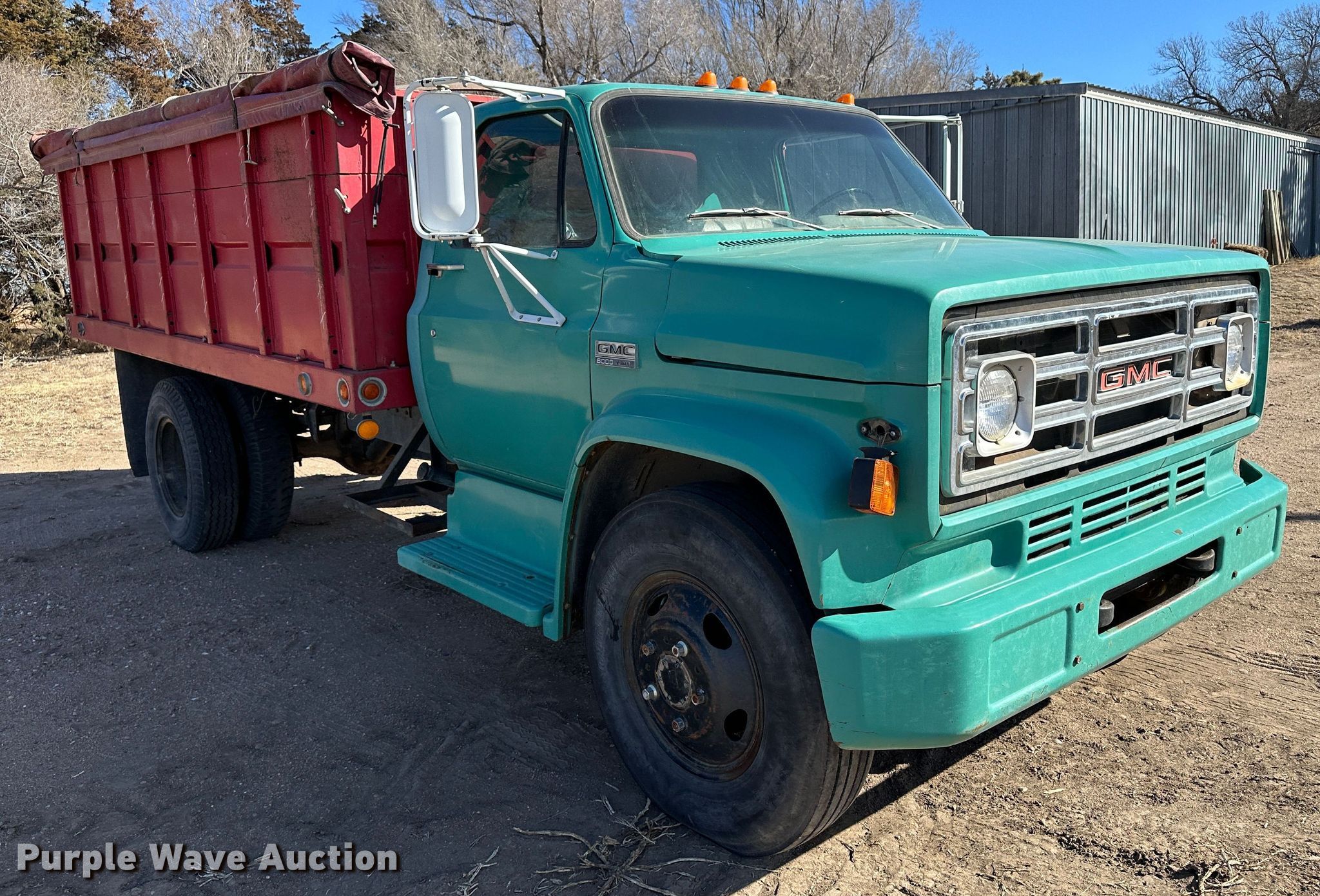 1974 GMC 6000 grain truck. Miles: 35,666 on odometer, VIN: TCE624V596189. Engine Cylinders: 8, Fuel type: Gas. Transmission Manual, Speed: 5, plus 2. Chassis Axles: Single, Suspension: Spring, Brakes: Hydraulic, PTO. Interior Heat. Features Dump bed 15' L x 94" W, Side height: 40", Ram: Dual, End gate: Manual. Tires Front: 9.00R20, Rear: 9.00-20. Kansas antique title. Title distribution may be delayed up to 14 days from verification of funds. Spearville, KS 67876