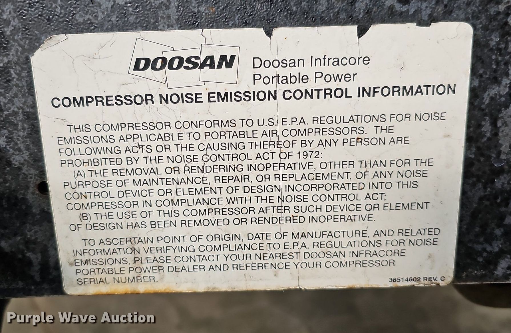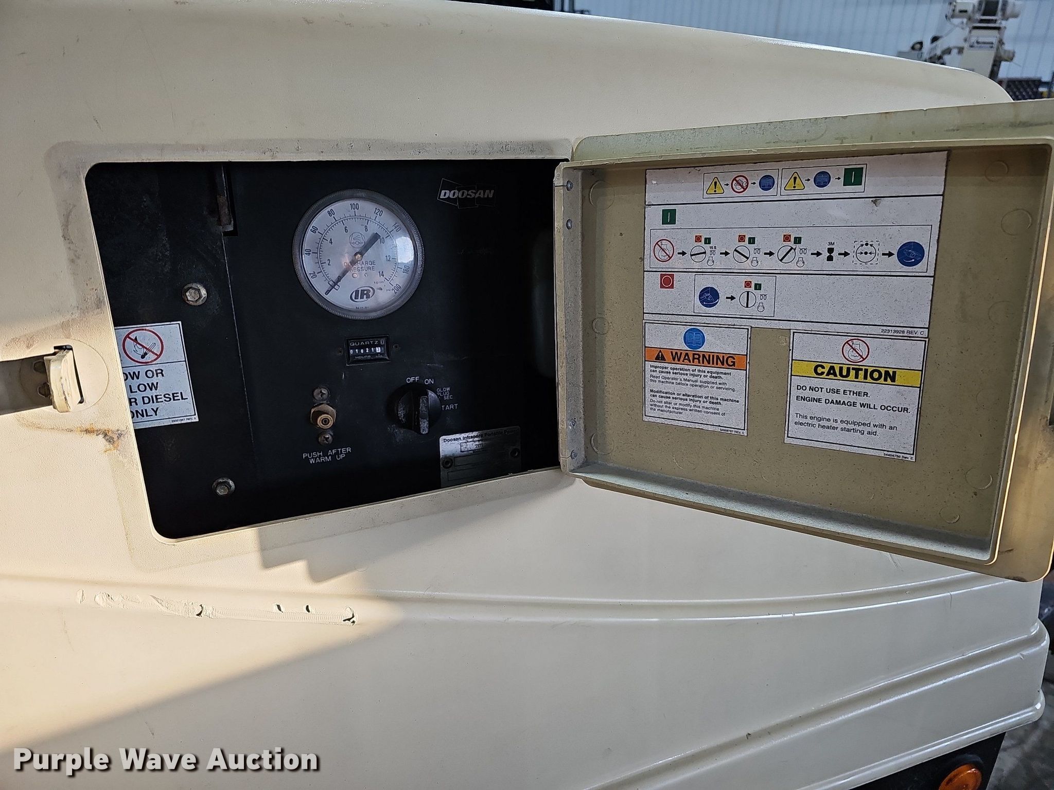 Purple Wave is selling a used Air Compressor in Nebraska. This item is a 2012 Doosan C185WKUB-T4I air compressor with the following: Hours: 1,621 on meter, Serial: 439624UDWD95
