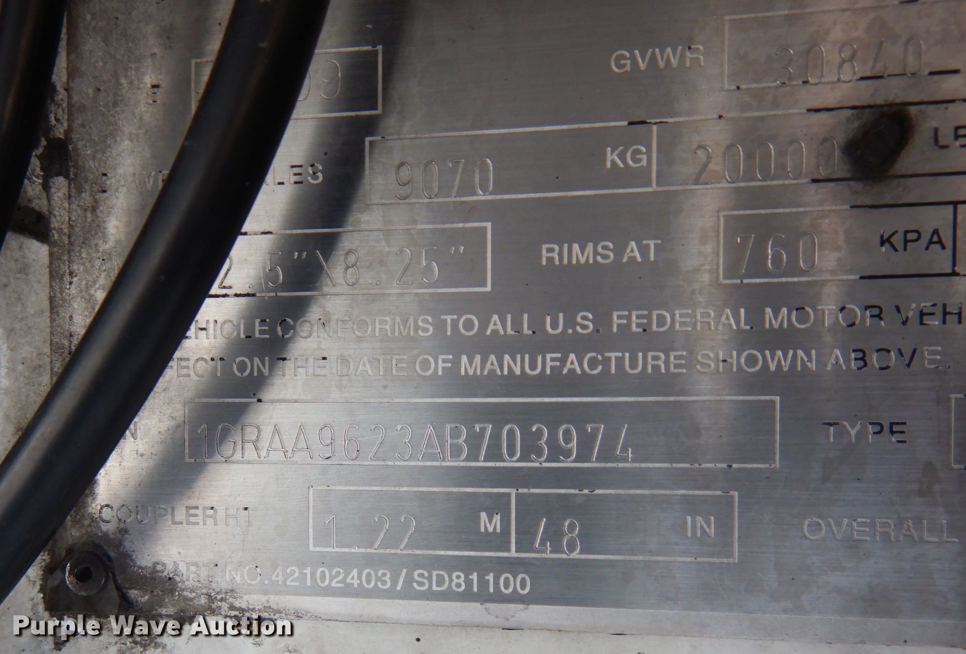 2010 Great Dane refrigerated van trailer. VIN: 1GRAA9623AB703974, Unit #: 20000. Dimensions Overall: 45' L x 96" W. Features Deck type: Aluminum, E-track rail system, Refrigeration unit Thermo King, Hours: 12,517. Chassis Landing gear: Dual, Suspension: Air, Brakes: Air, Axles: Tandem, Sliding, GVWR: 68,000 lbs, GAWR: 20,000 lbs. Tires Steel wheels, Size: 11R22.5. Notes Contents not included, Unknown operating condition of side lift gate. Illinois title. Titles will be distributed after confirmation of payment and removal. NDSM Holdings. 6303 Maxon Rd. Chemung, IL 60033