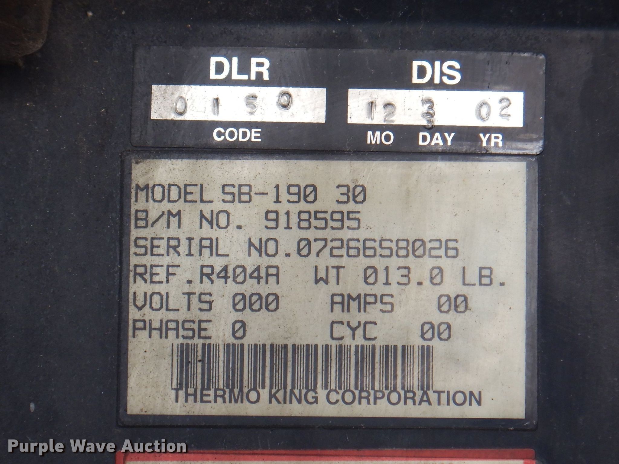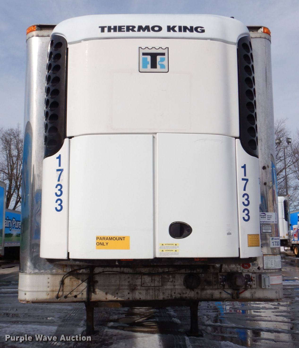 2002 Great Dane refrigerated van trailer. VIN: 1GRAA90272B041004, Unit #: 1733. Dimensions Overall: 45' L x 96" W. Features Deck type: Aluminum, E-track rail system, Refrigeration unit Thermo King, Hours: 22,584, Serial: 07266S8026. Chassis Landing gear: Dual, Two speed, Suspension: Spring, Brakes: Air, Axles: Tandem, Sliding. Tires Steel wheels, Size: 11R22.5. Notes Contents not included, Rear doors damaged. Illinois title. Titles will be distributed after confirmation of payment and removal. NDSM Holdings. 6303 Maxon Rd. Chemung, IL 60033