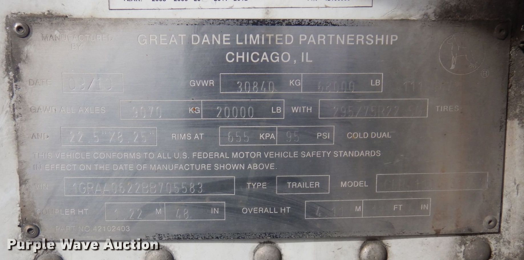 Purple Wave is selling a used Refrigerated Van Trailer in Illinois. This item is a 2011 Great Dane refrigerated van trailer with the following: VIN: 1GRAA0622BB705583, Unit #: 21110