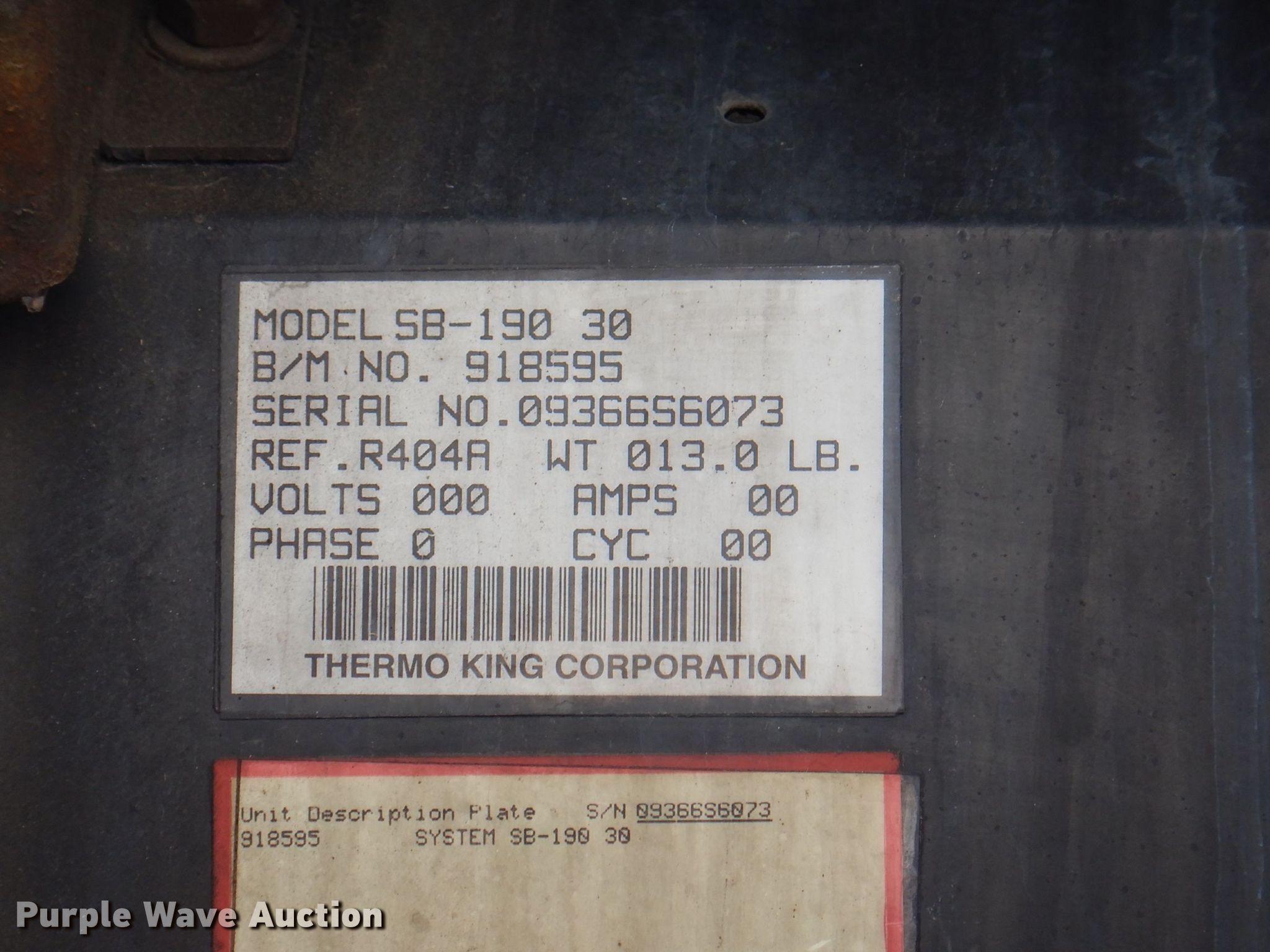 2004 Great Dane refrigerated van trailer. VIN: 1GRAA90224B705390, Unit #: 6684. Dimensions Overall: 45' L x 96" W. Features Deck type: Aluminum, E-track rail system, Refrigeration unit Thermo King SB-190, Hours: 19,302, Serial: 09366S6073. Chassis Landing gear: Dual, Suspension: Spring, Brakes: Air, Axles: Tandem, Sliding. Tires Steel wheels, Size: 11R22.5. Notes Contents not included, Rear doors damaged. Illinois title. Titles will be distributed after confirmation of payment and removal. NDSM Holdings. 6303 Maxon Rd. Chemung, IL 60033