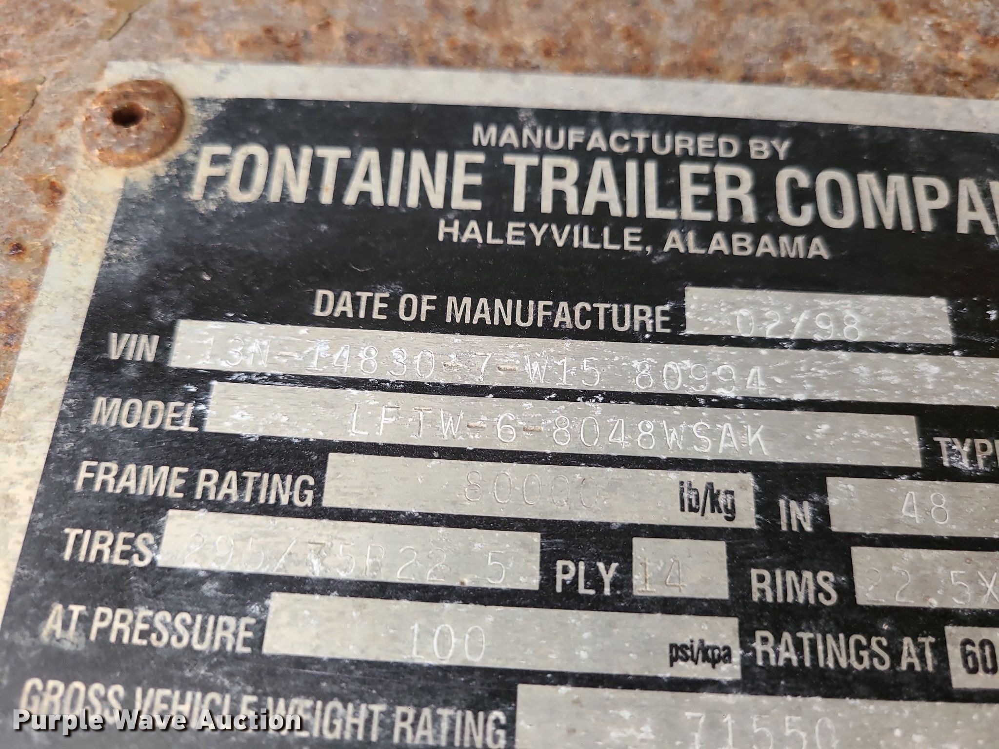 Purple Wave is selling a used Flat or Drop Deck Trailer in Missouri. This item is a 1998 Fontaine LFTW-6-8048WSAK flatbed trailer with the following: VIN: 13N148307W1580994, Unit #: 480994