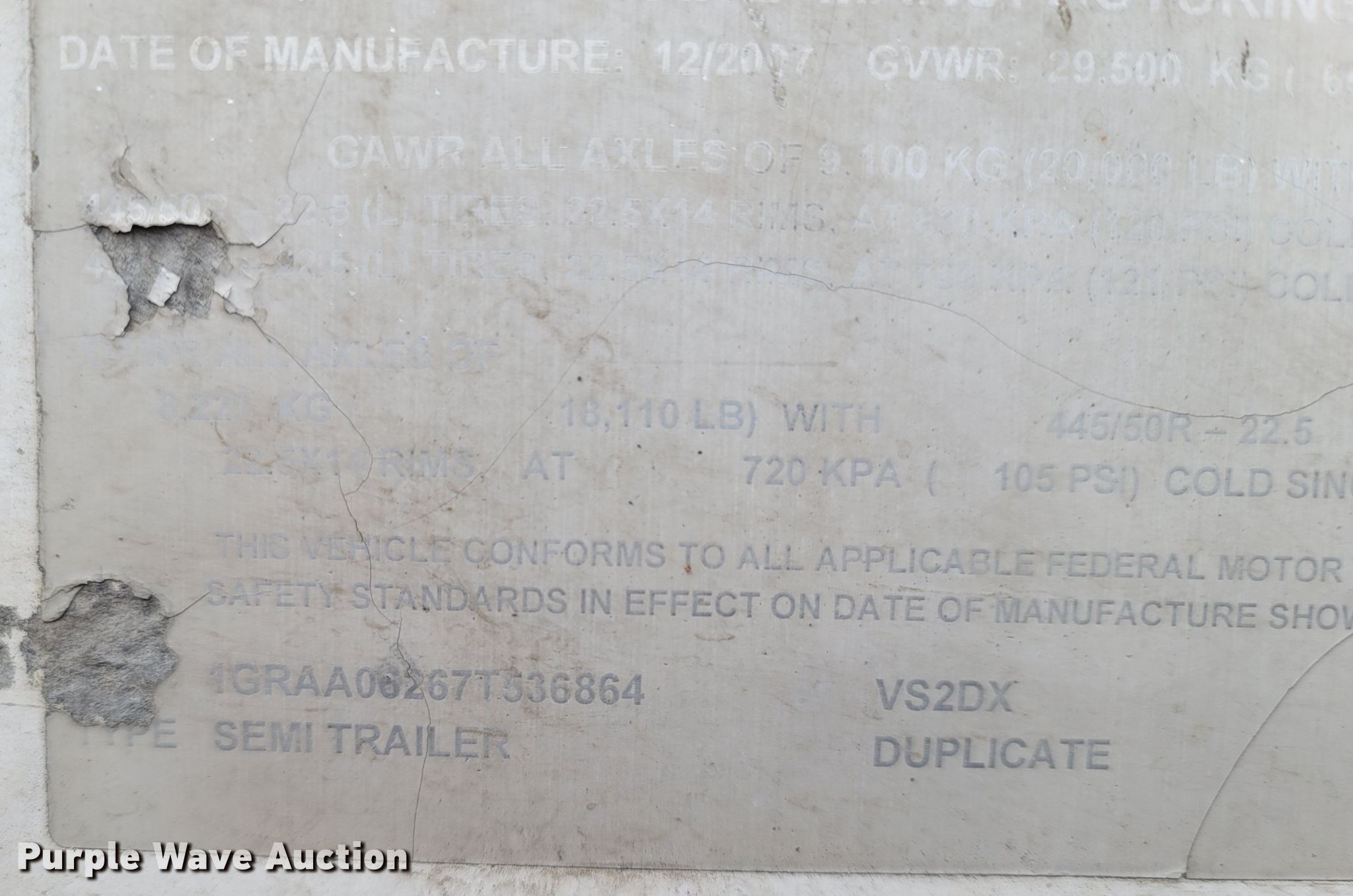 2007 Great Dane VS2DX dry van trailer. VIN: 1GRAA06267T536864. Dimensions Overall: 53' L x 102" W. Features Deck type: Wood. Chassis Landing gear: Dual, Suspension: Air, Brakes: Air, Axles: Tandem, Sliding, GVWR: 65,000 lbs. Tires Steel wheels, Size: 295/75R22.5. Notes Unknown operating condition. Arkansas title. Title has a lien that will be released following the close of the auction. Title distribution may be delayed up to 30 days from verification of funds. Bellson Logistics. 2111 South 8th Street. Rogers, AR 72758