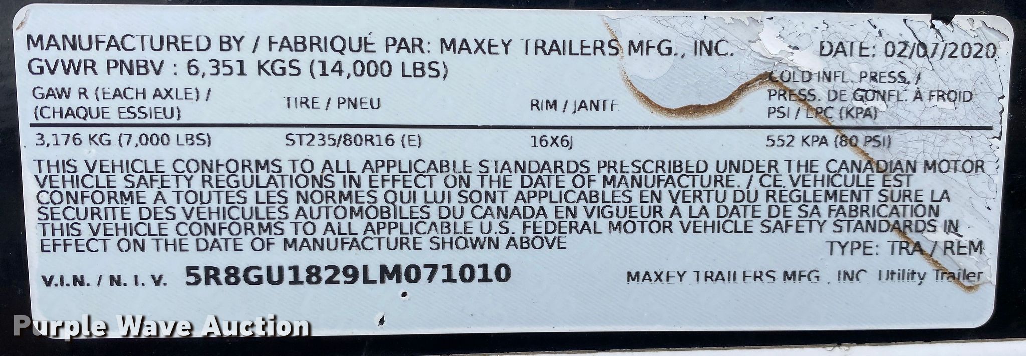 Purple Wave is selling a used Equip. Trailer in Oklahoma. This item is a 2020 Maxey Trailers equipment trailer with the following: VIN: 5R8GU1829LM071010