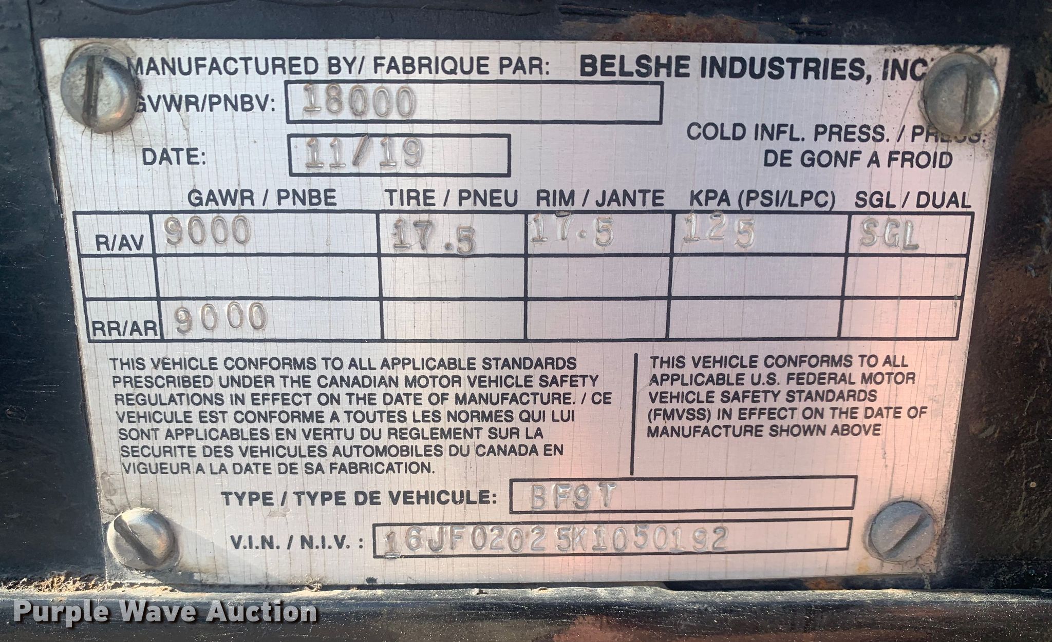 Purple Wave is selling a used Equip. Trailer in Texas. This item is a 2019 Belshe BF9T equipment trailer with the following: VIN: 16JF02025K1050192, Unit #: 127