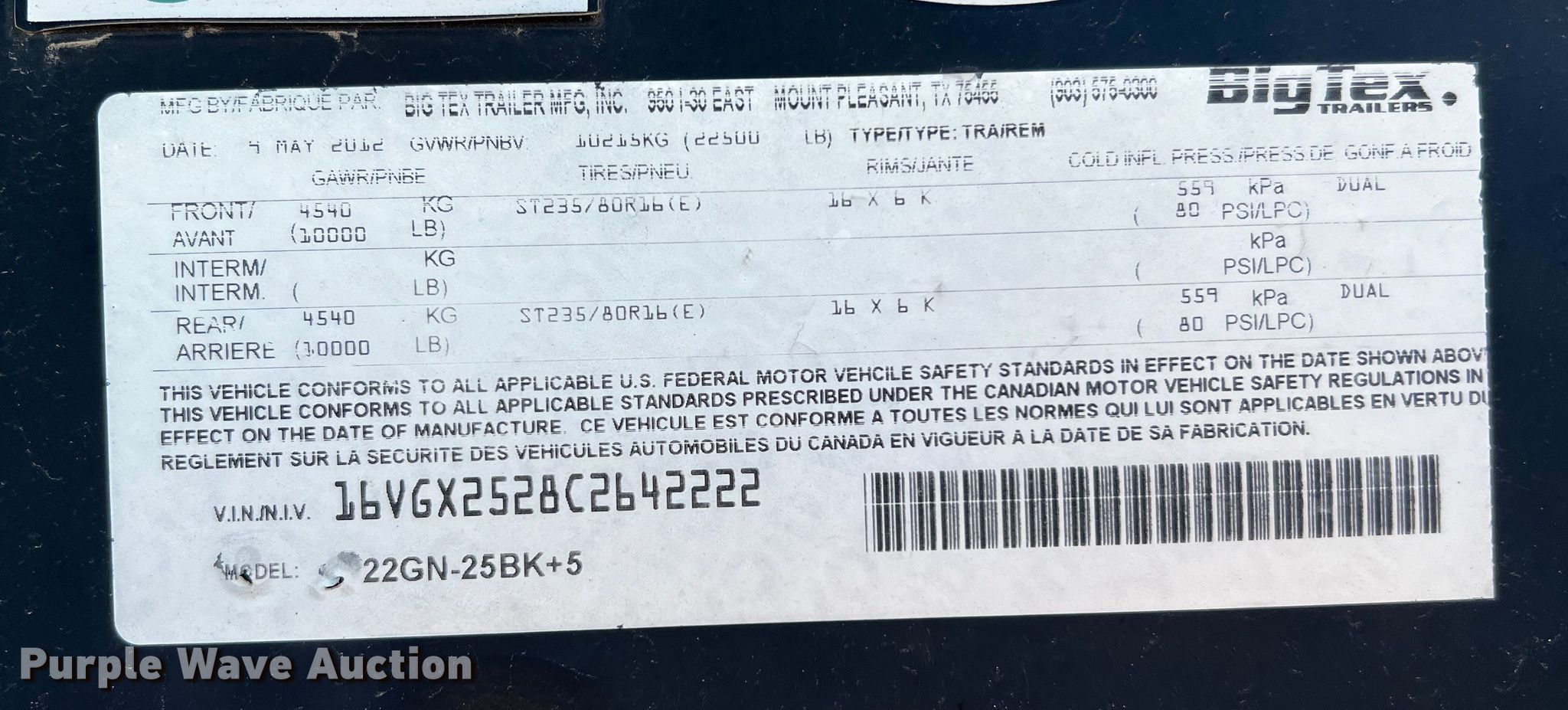 Purple Wave is selling a used Equip. Trailer in Texas. This item is a 2012 Big Tex 22GN-25BK+5 equipment trailer with the following: VIN: 16VGX2528C2642222