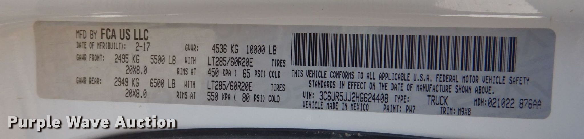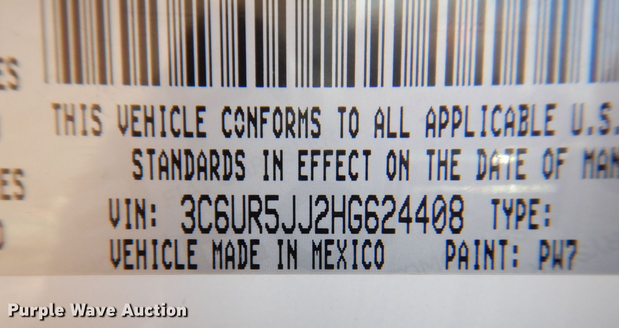 Purple Wave is selling a used 3/4 or 1 Ton Pickup or Van in Iowa. This item is a 2017 Dodge Ram 2500HD Big Horn Crew Cab pickup truck with the following: Miles: 175,764 on odometer, VIN: 3C6UR5JJ2HG624408