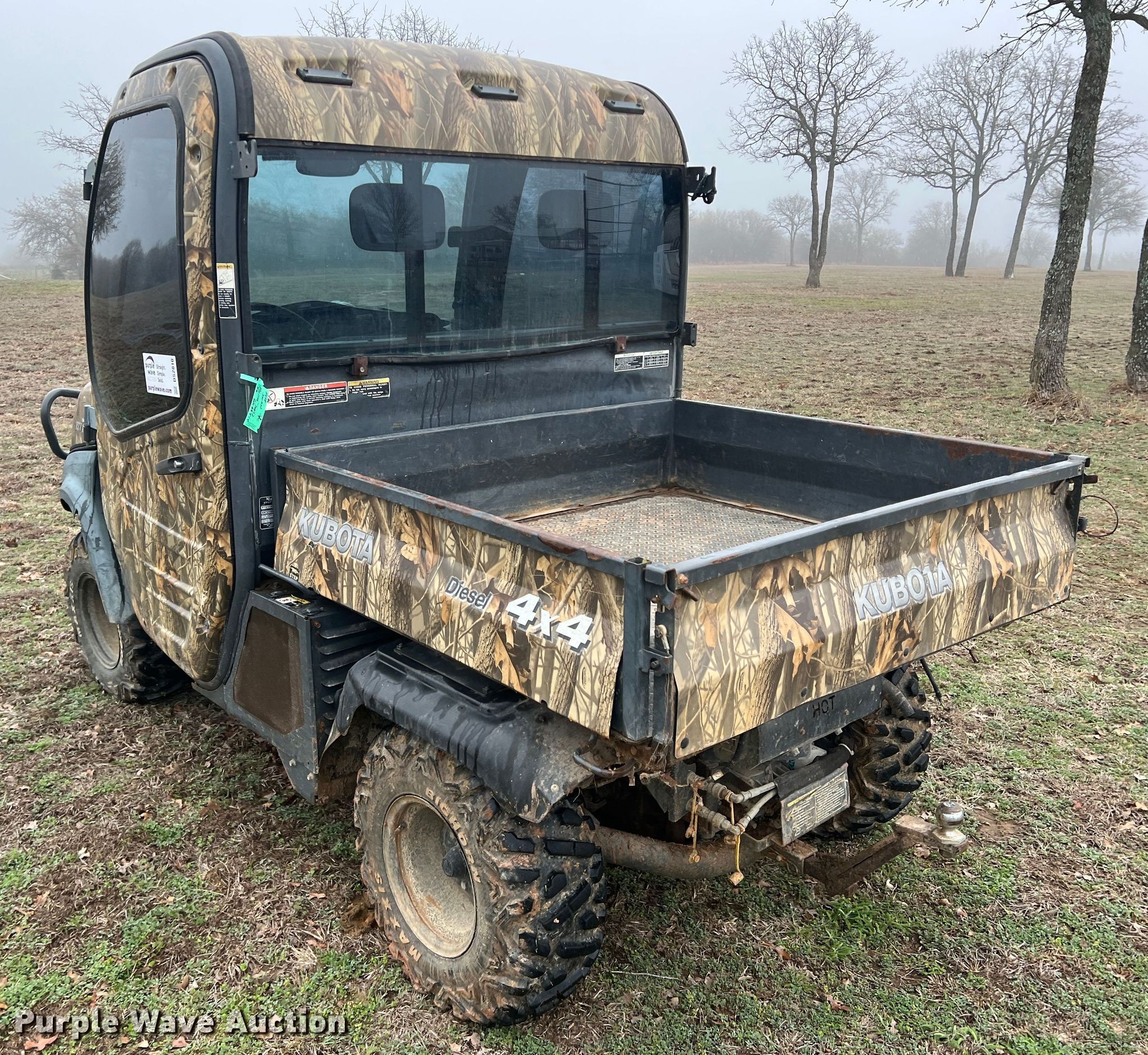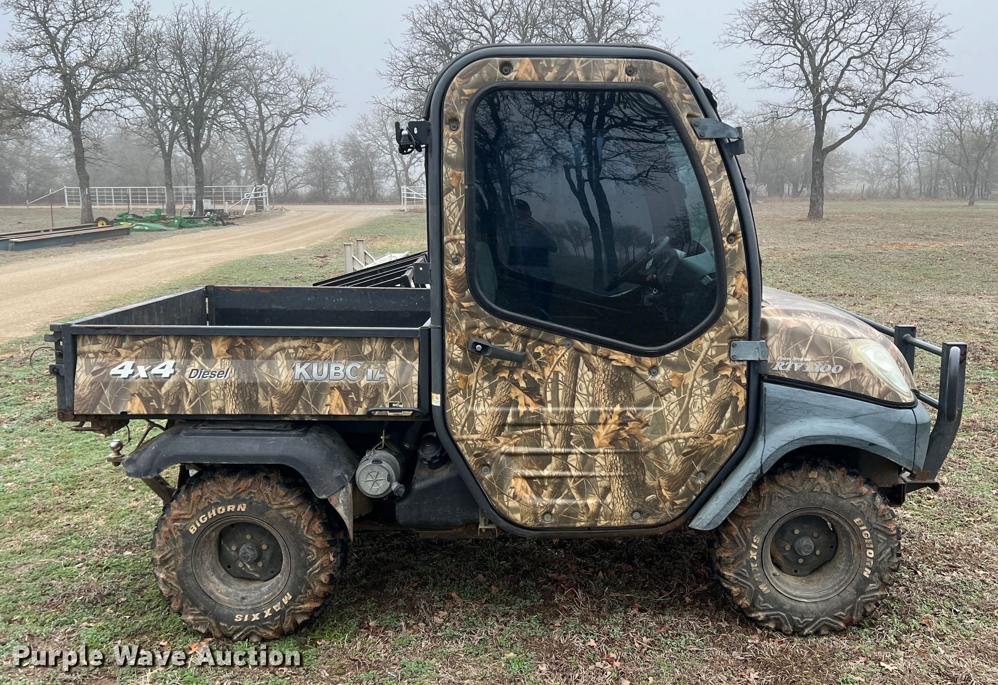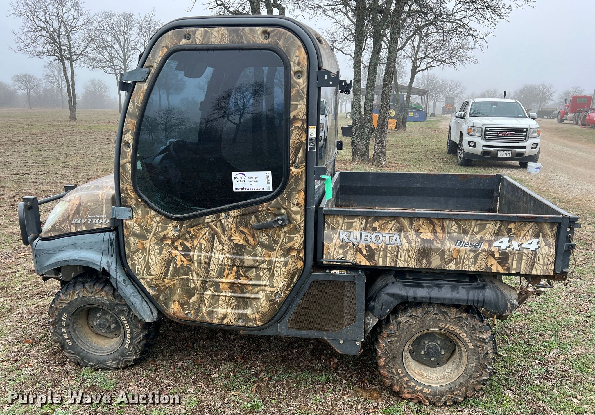 2001 Kubota RTV1100 utility vehicle. Miles: 838 on odometer, VIN: KRTV110071016073, Serial: 16073. Engine Kubota D1105, Displacement: 1.1L, Cylinders: 3, Fuel type: Diesel, Electric start. Transmission CVT. Chassis Four wheel drive. Operators station Enclosed cab, AC, Heat, Passengers: 2. Features Grill guard, Receiver hitch, Dump bed 49" L x 54" W, Dump bed type: Electric/ Hydraulic. Tires Size: 25x10R12. Notes Possible engine issues, smokes. Transfer of ownership documentation will be a bill of sale. 9301 Farm To Market Rd 4. Jacksboro, TX 76458