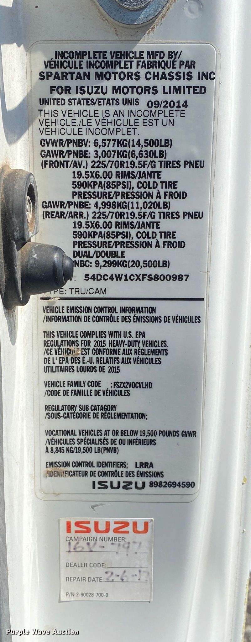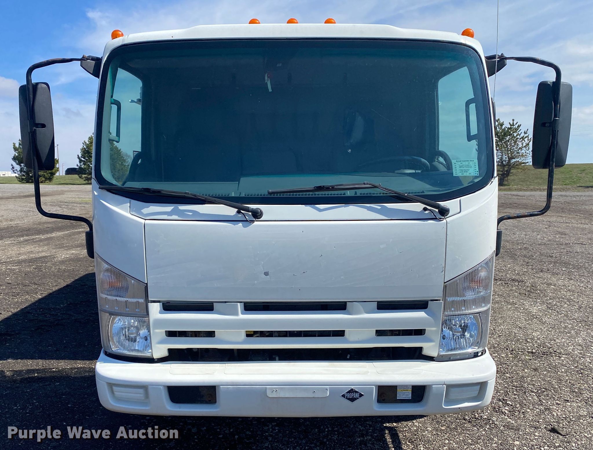 2015 Isuzu NPR delivery truck. Miles: 210,899 on odometer, VIN: 54DC4W1CXFS800987. Engine Displacement: 6.0L, Cylinders: 8, Fuel type: Propane. Transmission Automatic. Chassis Axles: Single, Suspension: Spring, Brakes: Hydraulic, GVWR: 14,500 lbs. Interior AC, Power windows, Power locks, Cruise control. Features Box bed 13' L x 90" W x 56" H, Floor: Aluminum, Refrigeration unit. Tires Size: 225/70R19.5. Oklahoma title. 15107 North 137th East Avenue. Collinsville, OK 74021