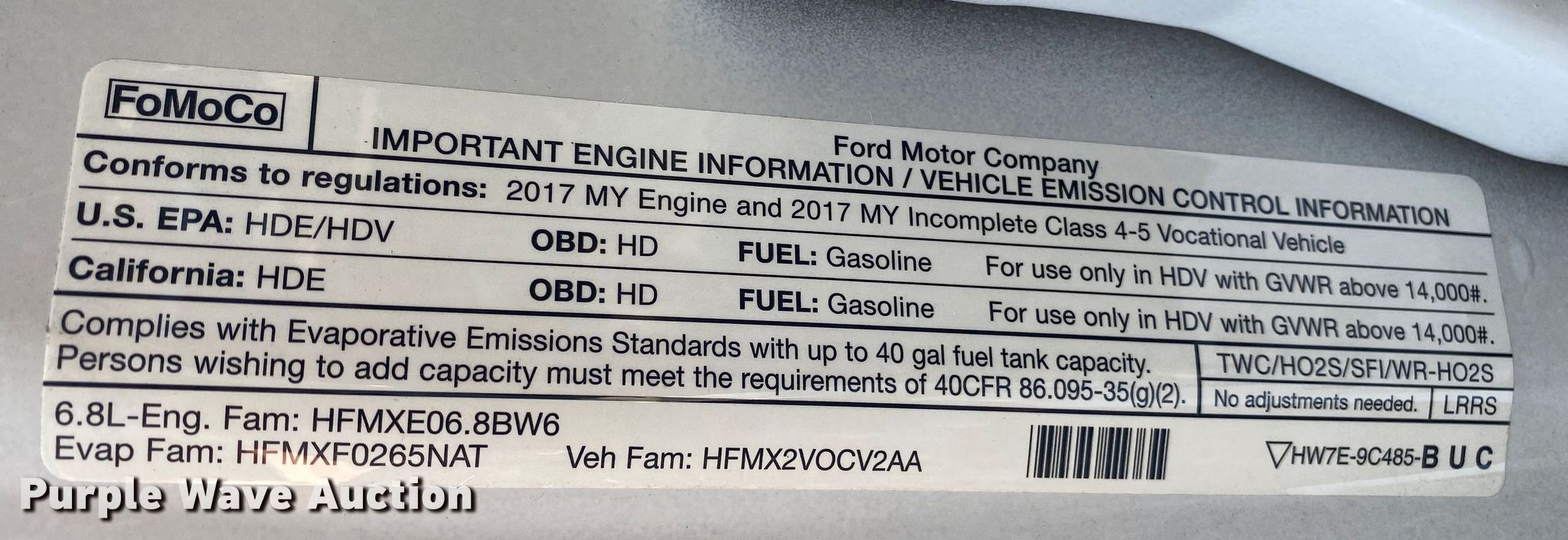 2017 Ford F550 XL truck cab and chassis. Miles: 63,223 on odometer, VIN: 1FDUF5HY8HEE22308. Engine Displacement: 6.8L, Cylinders: 10, Fuel type: Gas. Transmission Automatic. Chassis Four wheel drive, Axles: Single, Suspension: Spring, Brakes: Hydraulic, Truck chassis: 11'. Interior AC, Heat, Heated mirrors, Power windows, Power locks, Cruise control. Tires Size: 225/70R19.5. Oklahoma title. 15107 North 137th East Avenue. Collinsville, OK 74021