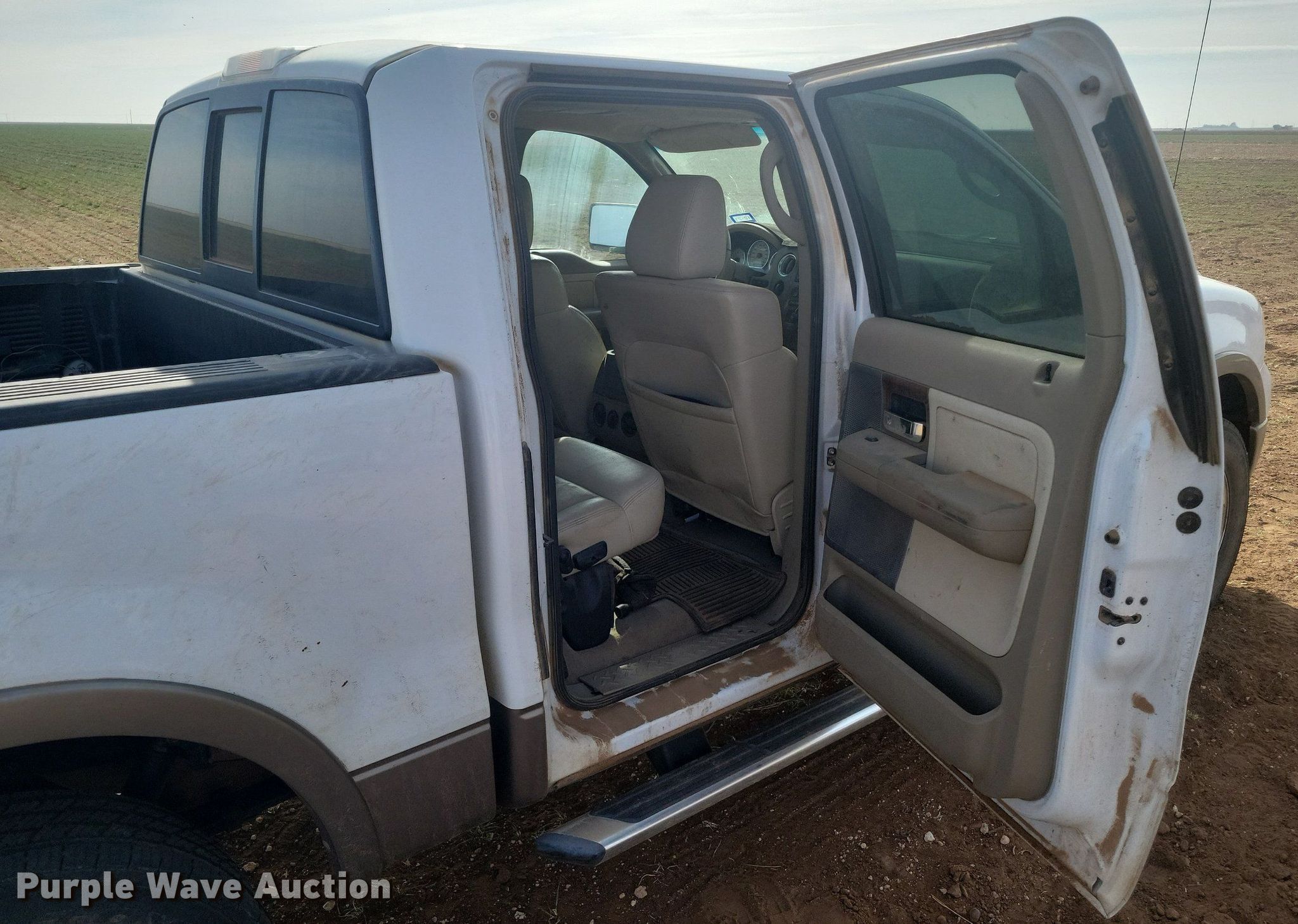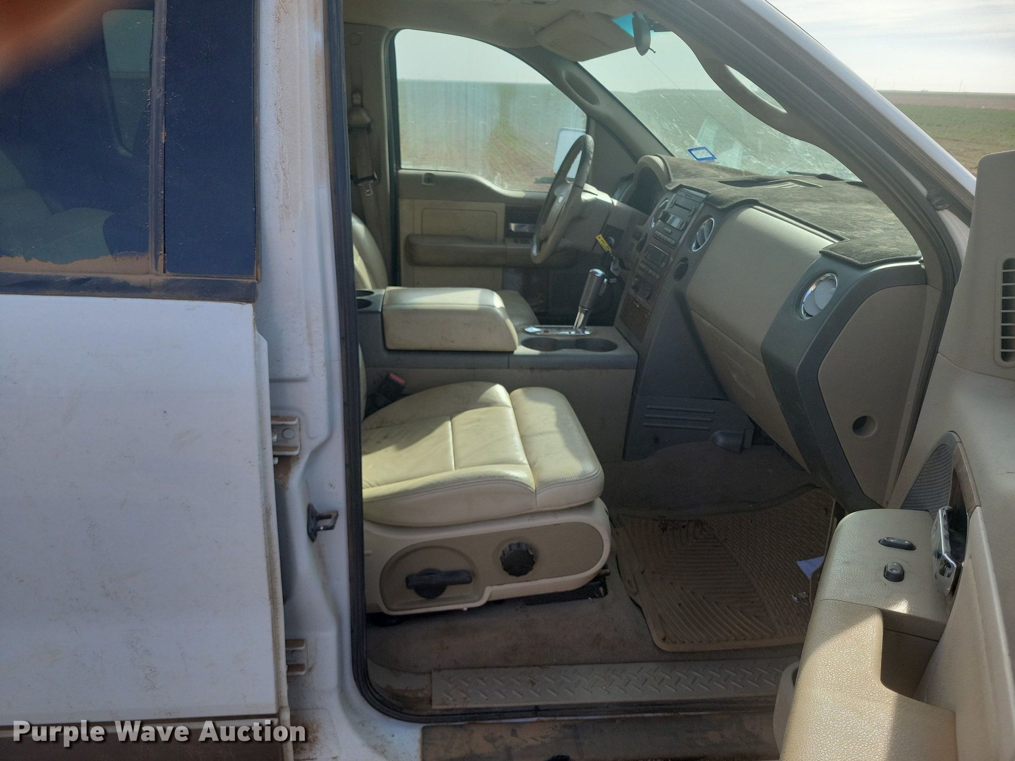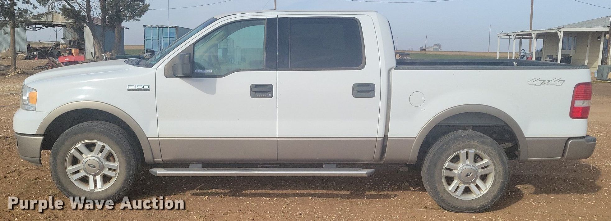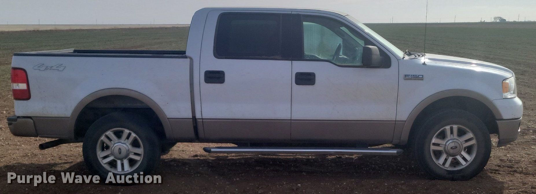 2004 Ford F150 SuperCrew pickup truck. Miles: Unknown, VIN: 1FTPW14524KD64858. Engine Displacement: 5.4L V8 SOHC, Cylinders: 8, Fuel type: Gas. Transmission Automatic, Four wheel drive. Interior AC, Heat, Seat: Power driver, Power windows, Power locks, Cruise control. Tires Size: LT275/65R18. Notes Battery missing, Windshield chipped or cracked, Unknown operating condition. Texas title. Dutton farms. 6428 County Road R. Tulia, TX 79088