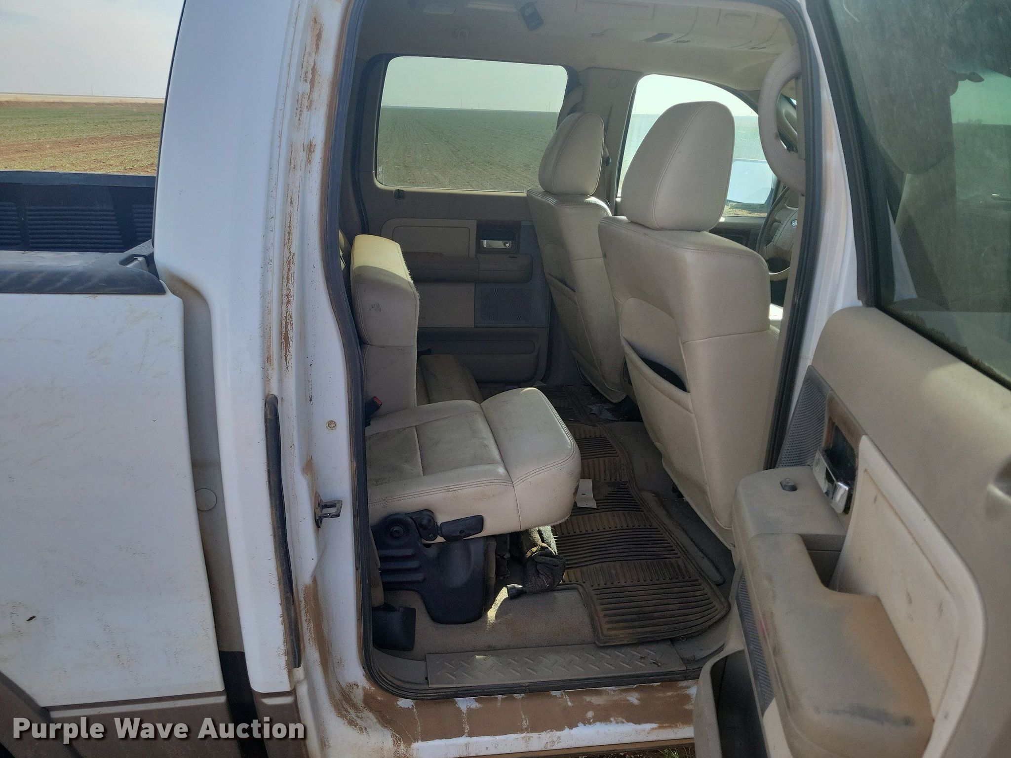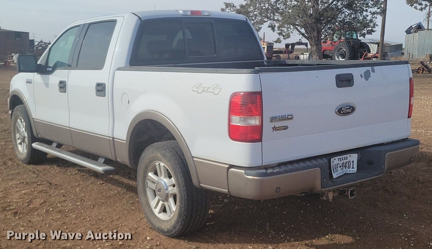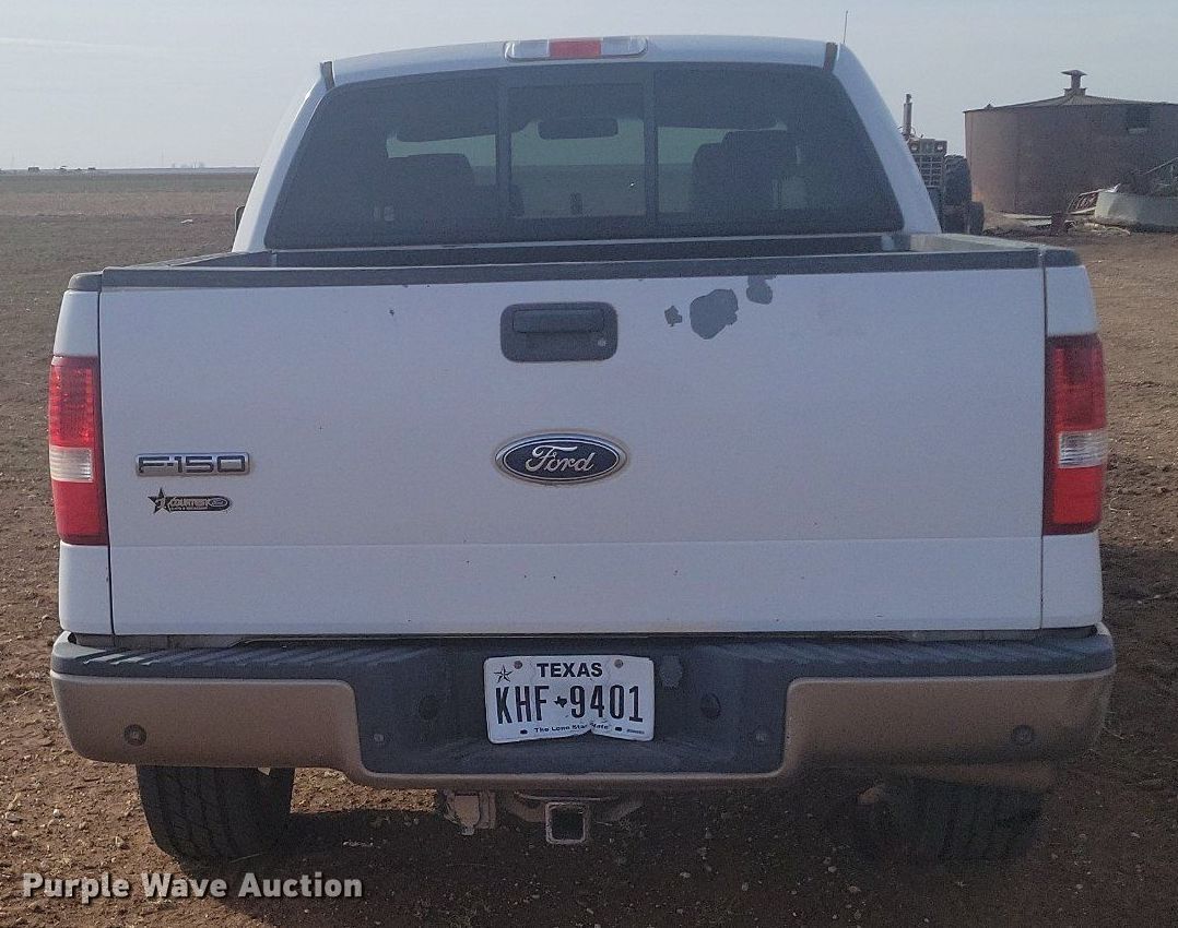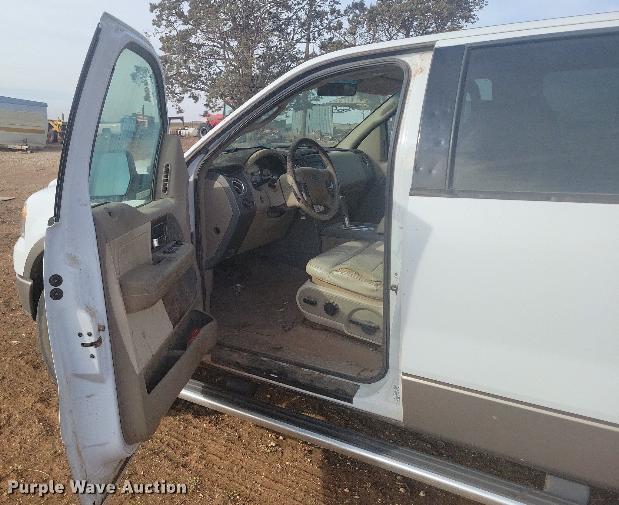 2004 Ford F150 SuperCrew pickup truck. Miles: Unknown, VIN: 1FTPW14524KD64858. Engine Displacement: 5.4L V8 SOHC, Cylinders: 8, Fuel type: Gas. Transmission Automatic, Four wheel drive. Interior AC, Heat, Seat: Power driver, Power windows, Power locks, Cruise control. Tires Size: LT275/65R18. Notes Battery missing, Windshield chipped or cracked, Unknown operating condition. Texas title. Dutton farms. 6428 County Road R. Tulia, TX 79088