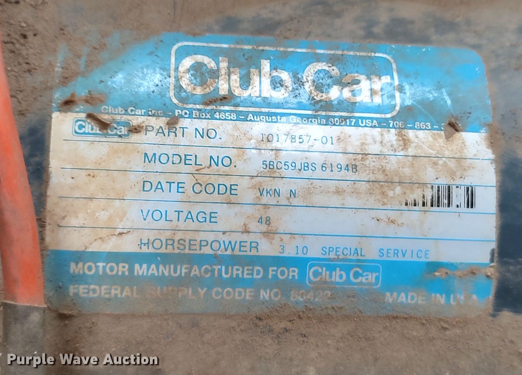 Club Car golf cart. Serial: A9605485464. Electric Motor Volts: 48. Transmission Automatic. Tires Front: 22x10.00-8. Notes Batteries missing, Flat tires, Unknown operating condition. 17100 S Air Depot Blvd. Norman, OK 73026