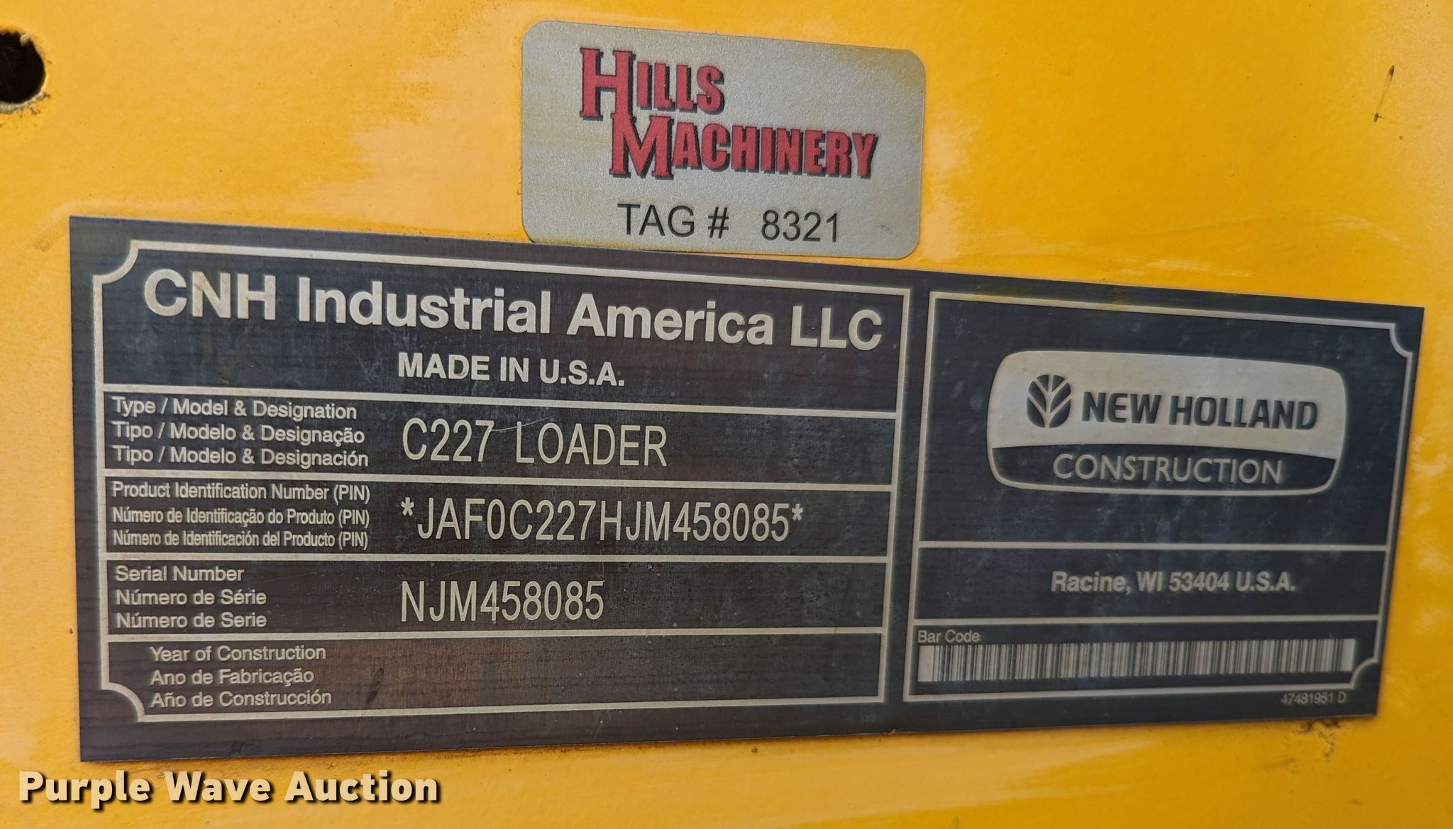 Purple Wave is selling a used Tracked Skid Steer Loader in Oklahoma. This item is a 2018 New Holland C227 tracked skid steer loader with the following: Hours: Unknown, Serial: NJM458085