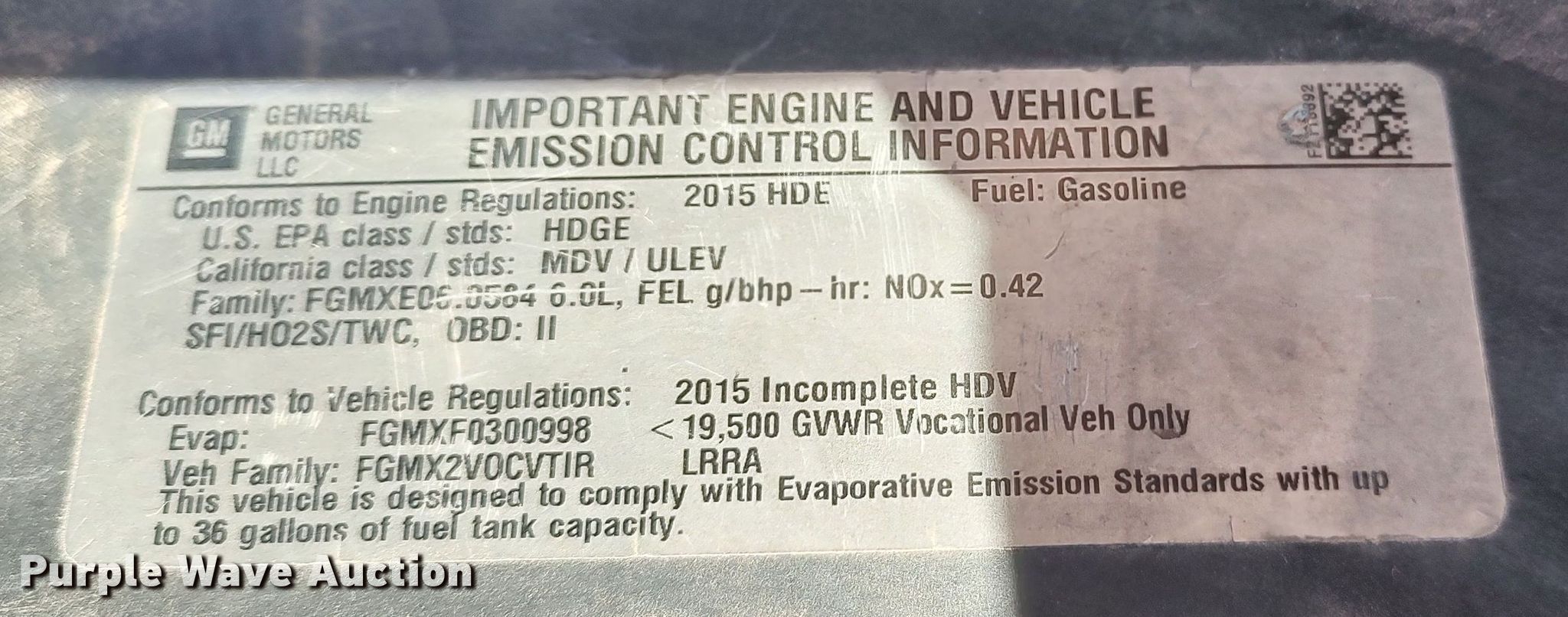 2015 Chevrolet Silverado 3500HD utility bed pickup truck. Miles: Unknown, VIN: 1GB3CYCG9FZ118892. Engine Displacement: 6.0L V8 OHV, Cylinders: 8, Fuel type: Gas. Transmission Automatic. Interior AC, Heat, Power locks, Cruise control. Features Utility bed 8' L x 82" W, Anthony end gate lift. Tires Size: 275/65R18. Notes Unknown operating condition. Oklahoma title. Mileage has not been verified. Odometer discrepancy will be marked on the title. Title distribution may be delayed up to 30 days from verification of funds. 10220 W Reno Ave. Oklahoma City, OK 73127