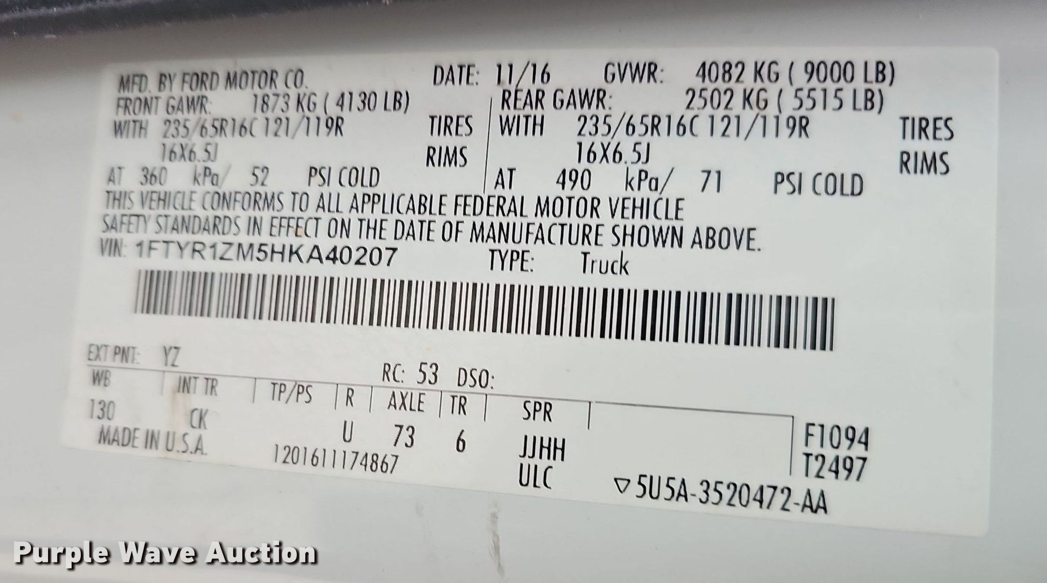 2017 Ford Transit 250 van. Miles: 132,093 on odometer, VIN: 1FTYR1ZM5HKA40207, Unit #: 93182. Engine Displacement: 3.7L V6 DOHC, Cylinders: 6, Fuel type: Gas. Transmission Automatic. Interior AC, Heat, Power windows, Power locks, Cruise control, Backup camera. Tires Size: 235/65R16. Notes Windshield chipped or cracked. Nebraska title. Title distribution may be delayed up to 14 days from verification of funds. The Waldinger Corporation. 8802 S 121st St. La Vista, NE 68128