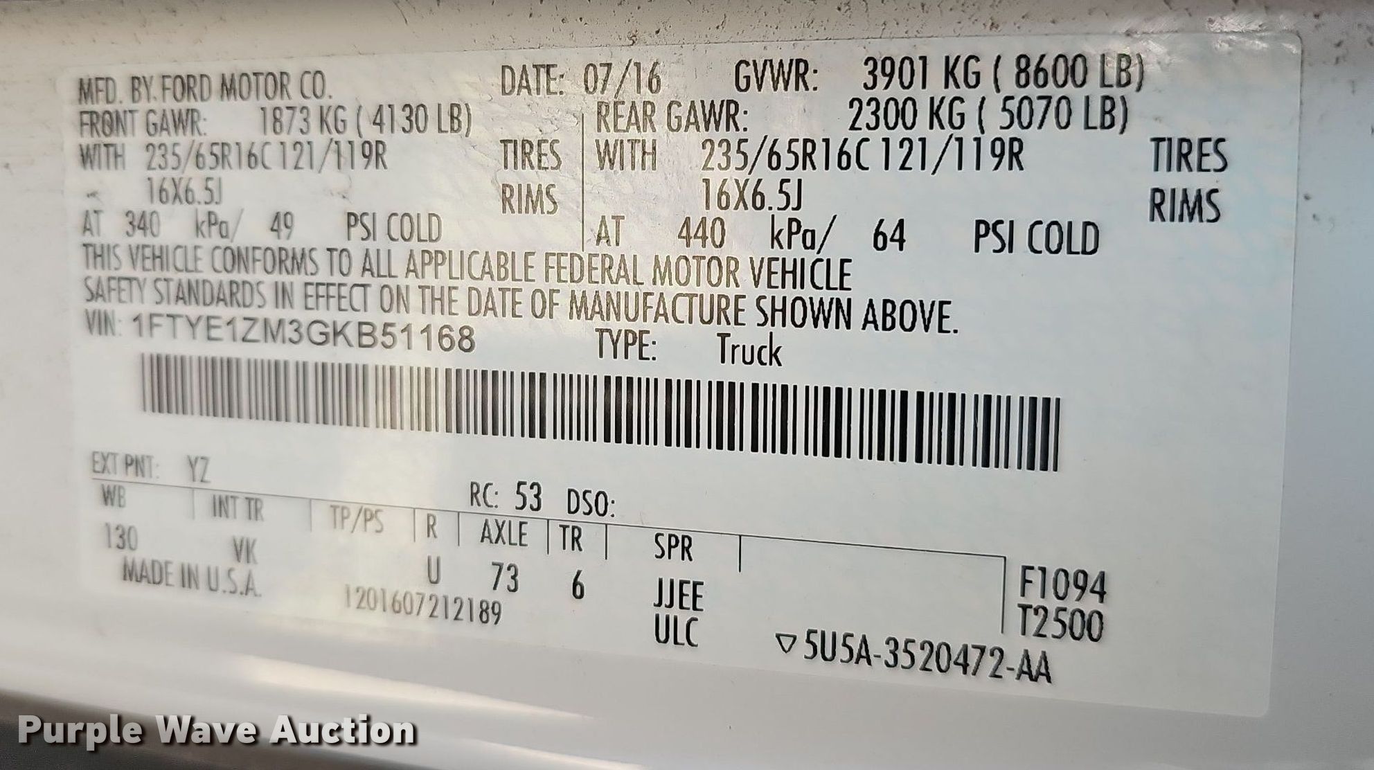 2016 Ford Transit 150 van. Miles: 133,604 on odometer, VIN: 1FTYE1ZM3GKB51168. Engine Displacement: 3.7L V6 DOHC, Cylinders: 6, Fuel type: Gas. Transmission Automatic. Interior AC, Heat, Power windows, Power locks, Cruise control, Backup camera. Tires Size: 235/65R16. Notes Windshield chipped or cracked. Nebraska title. Title distribution may be delayed up to 14 days from verification of funds. The Waldinger Corporation. 8802 S 121st St. La Vista, NE 68128