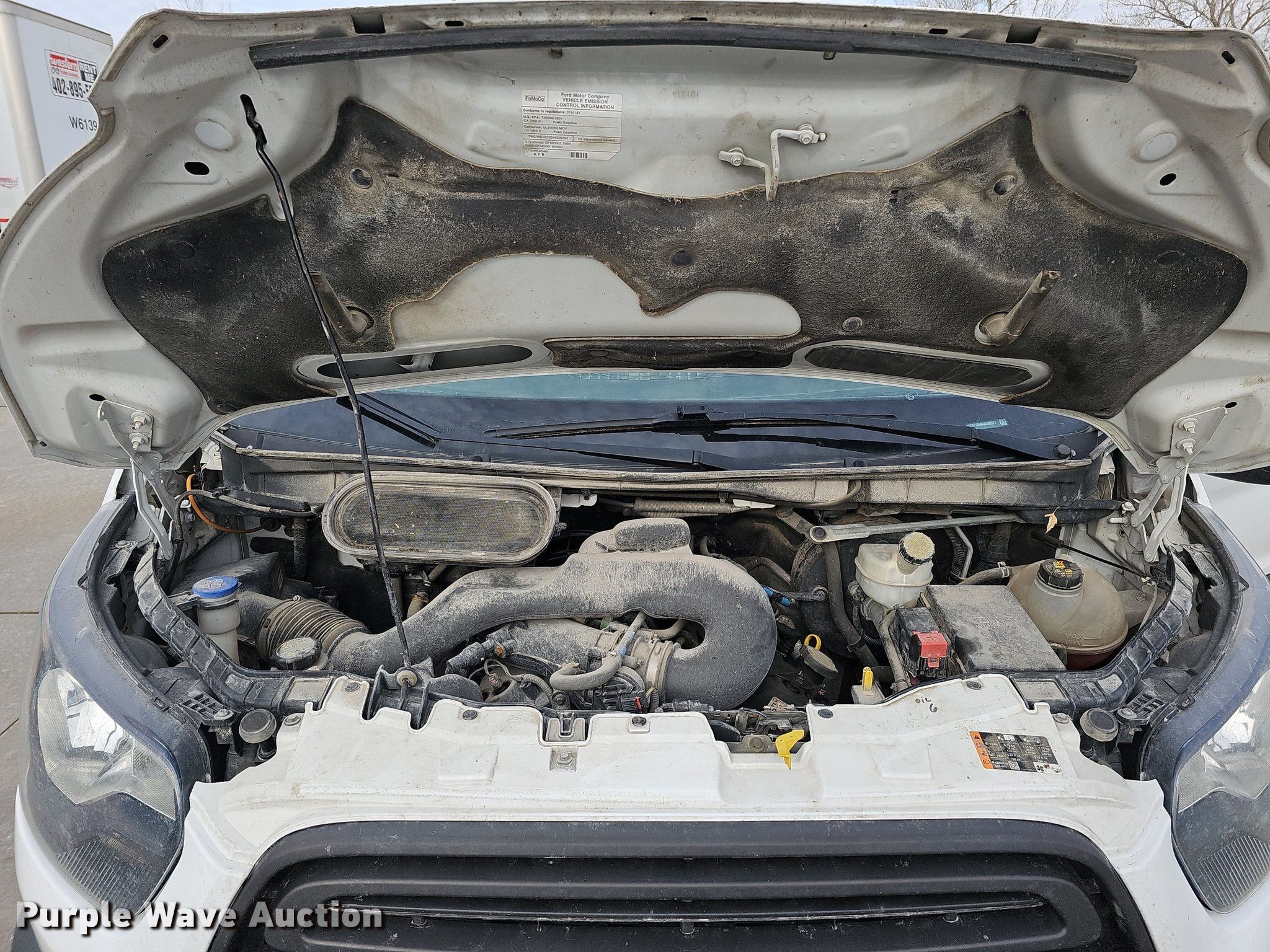 2016 Ford Transit 150 van. Miles: 165,960 on odometer, VIN: 1FTYE1ZM5GKA32277, Unit #: 92953. Engine Displacement: 3.7L V6 DOHC, Cylinders: 6, Fuel type: Gas. Transmission Automatic. Interior AC, Heat, Power windows, Power locks, Cruise control, Backup camera. Tires Size: 235/65R16. Notes Dash warning indicator: Check engine, TPMS, Windshield chipped or cracked, Dead battery, Non-operational hood latch. Nebraska title. Title distribution may be delayed up to 14 days from verification of funds. The Waldinger Corporation. 8802 S 121st St. La Vista, NE 68128