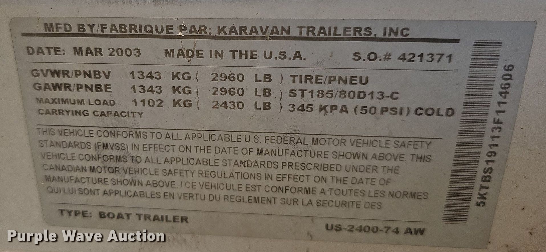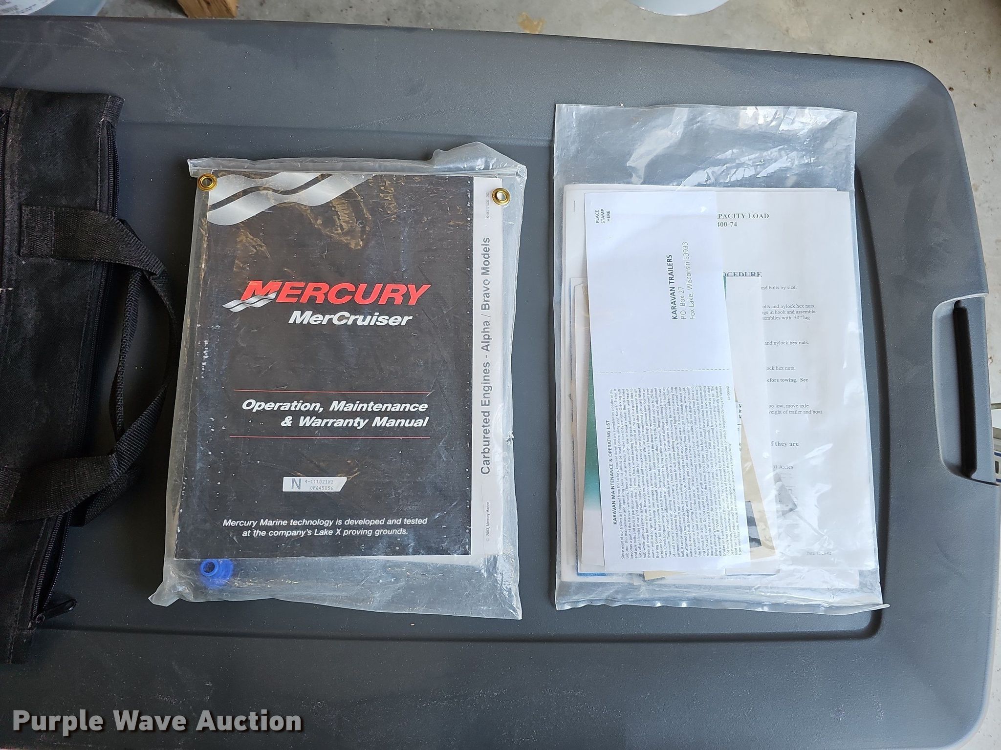 2003 Bayliner boat. Length: 18' 8", Hull ID: USHN81CLD303. Engine Engine type: Inboard, Mercury Mercruiser, Displacement: 181 CID, Cylinders: 4, Fuel type: Gas, Outdrive Make: MerCruiser, Model: Alpha One, Serial: OM588465, Propeller: Aluminum. Operators station Capacity Person: 7, 1,100 lbs. Features Bimini top. Trailer Karavan Trailer US-2400-74 AW, VIN: 5KTBS19113F114606, Overall length: 19', GVWR: 3,000 lbs, Ball hitch size: 2", Axles: Single, Tire size: 185/80R13. Notes Contents included, Owners manual. Nebraska title. Title distribution may be delayed up to 14 days from verification of funds. Transfer of ownership documentation will be a bill of sale. 5801 NW 123rd St. Lincoln, NE 68524