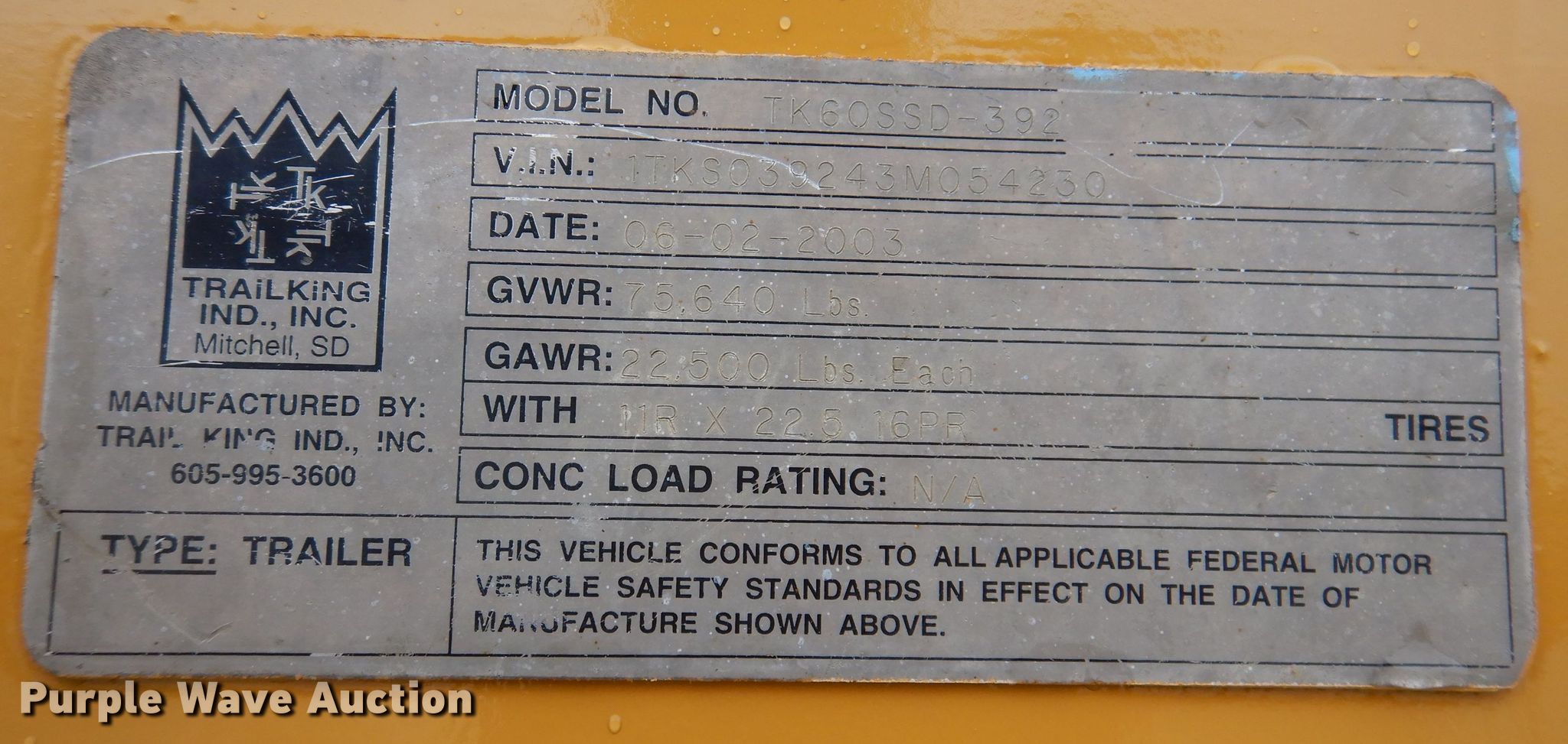 2003 Trail King TK60SSD-392 side dump trailer. VIN: 1TKS039243M054230. Dimensions Overall: 42' L x 102" W, Body: 34' L x 102" W, Side height: 3'. Features Body type: Steel, Ram: Dual, Rear push block. Chassis Landing gear: Dual, Two speed, Suspension: Spring over walking beam, Brakes: Air, Axles: Tandem, GVWR: 75,640 lbs, GAWR: 22,500 lbs. Tires Steel wheels, Size: 11R22.5. Iowa title. Title distribution may be delayed up to 14 days from verification of funds. Corell Contractors Inc.. 1300 Lincoln Street. West Des Moines, IA 50265