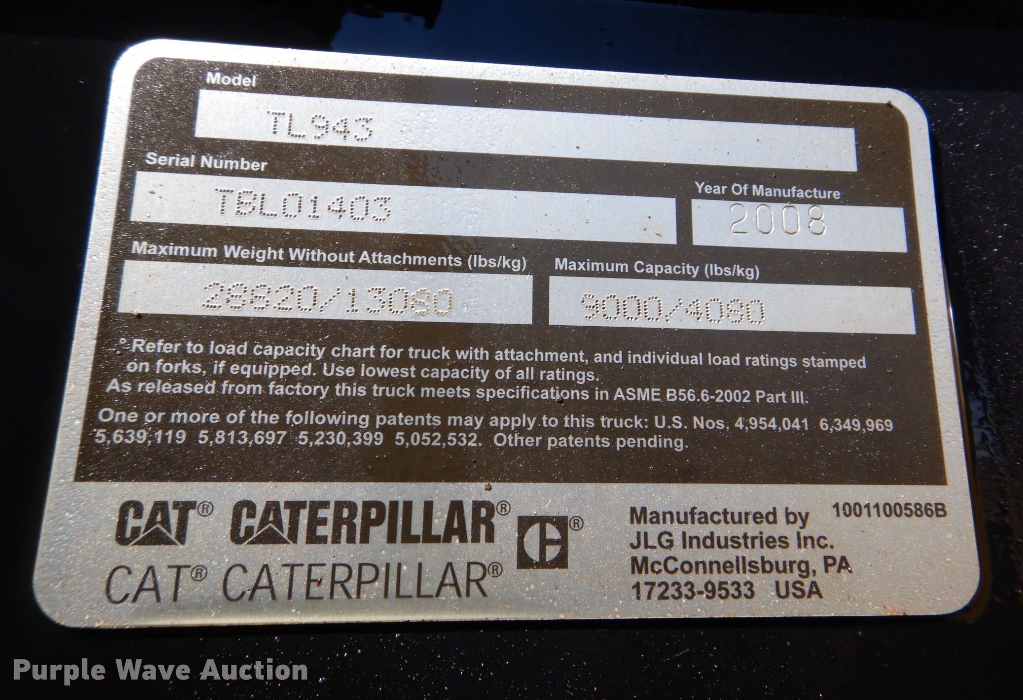 Purple Wave is selling a used Telehandler in Iowa. This item is a 2008 Caterpillar TL943 telehandler with the following: Hours: 756 on meter, Serial: TBL01403