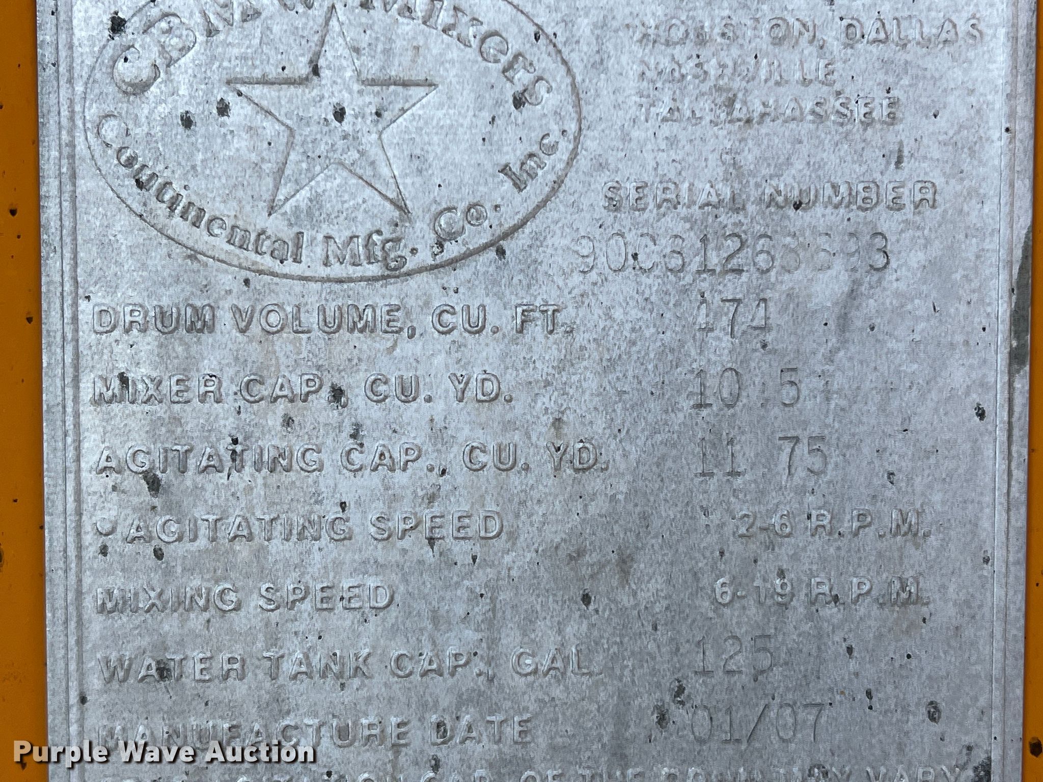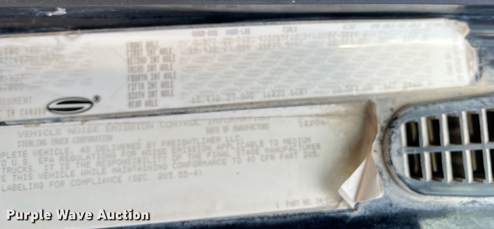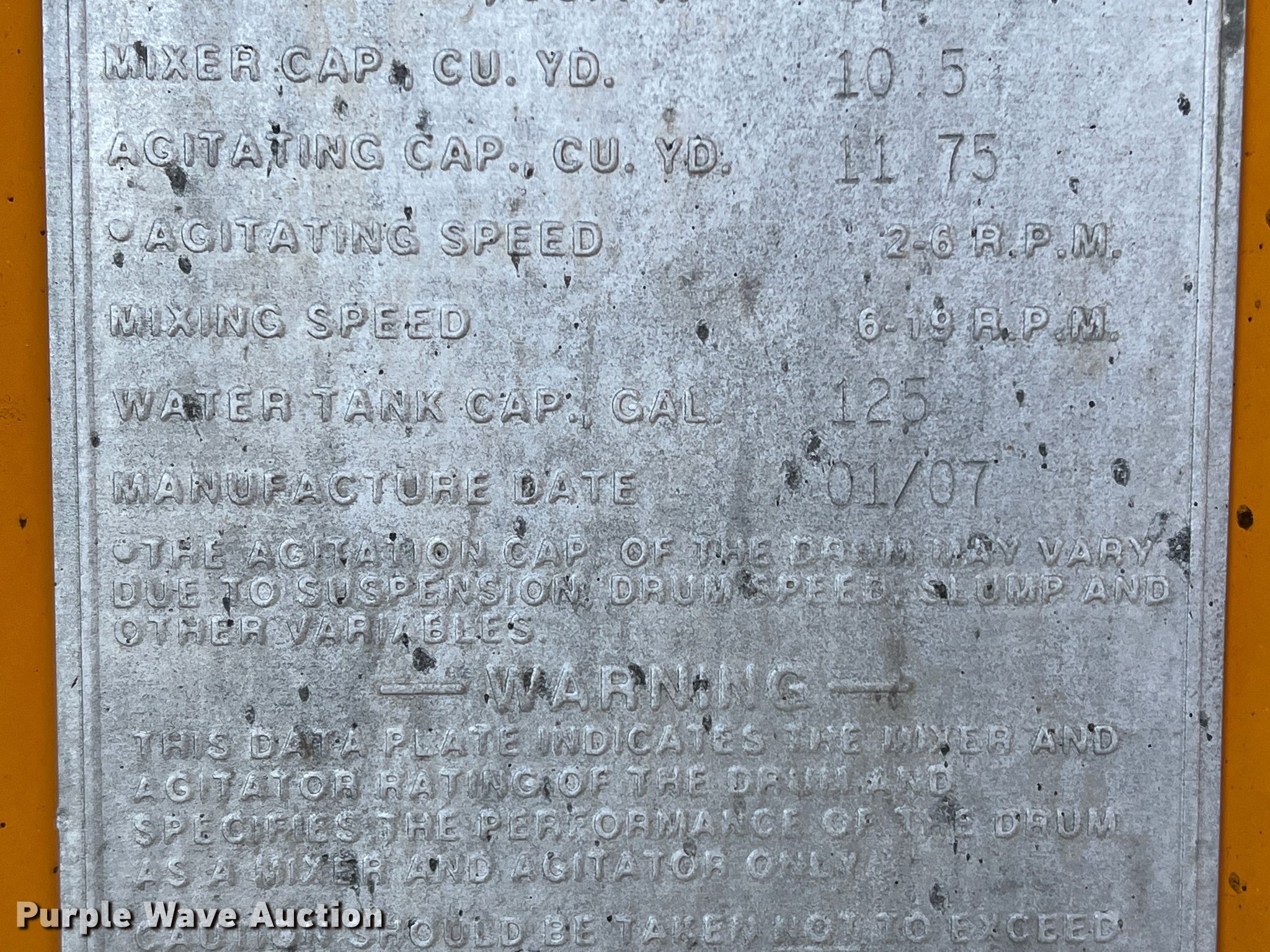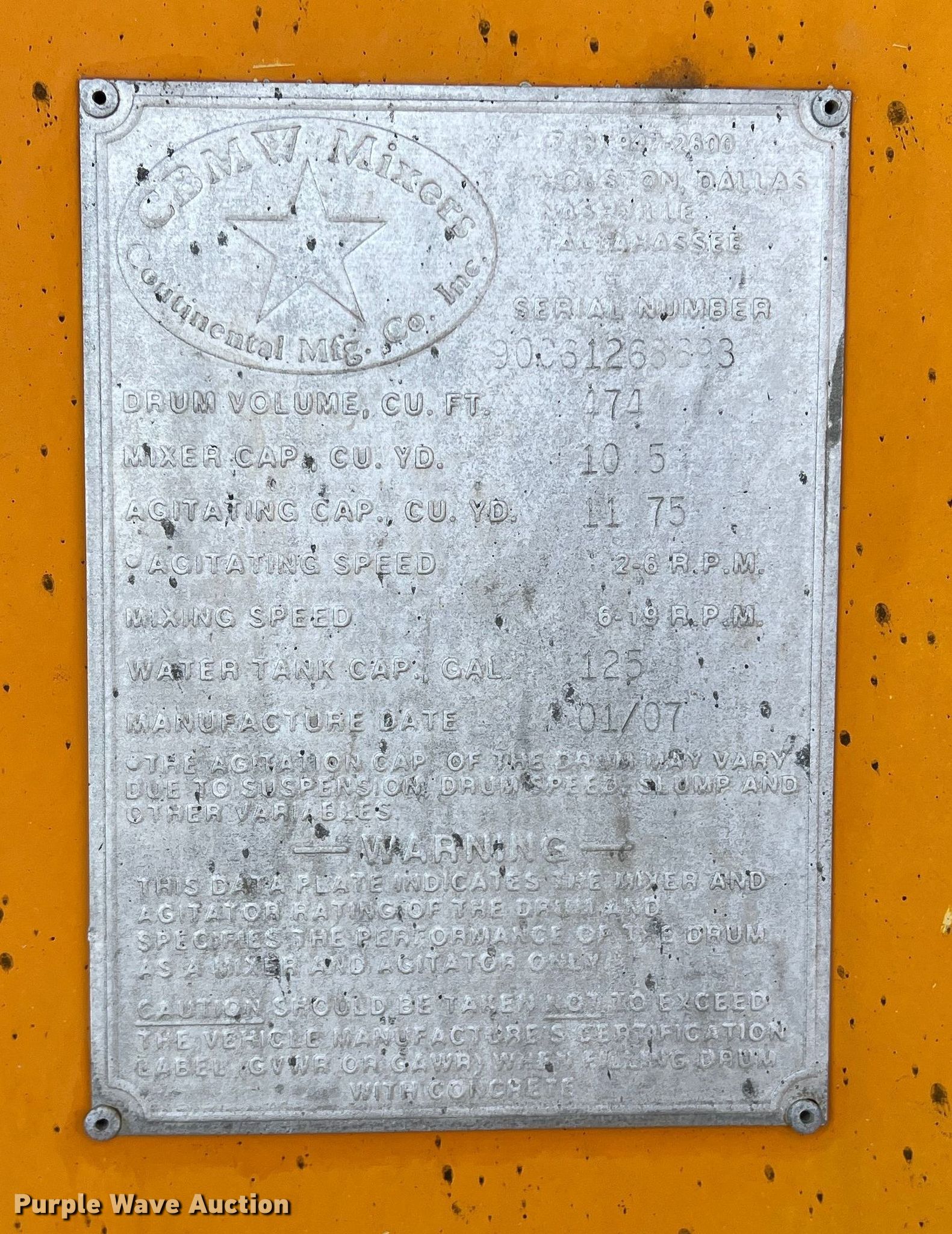 2007 Sterling L9500 ready mix truck. Miles: 319,134 on odometer, Hours: 32,964 on meter, VIN: 2FZHAZCV17AX38709. Engine Mercedes Benz OM 460 LA , Displacement: 12.0L, Cylinders: 6, Fuel type: Diesel. Transmission Automatic. Chassis Double frame, Axles: Tandem, Differential lock: Full, Suspension: Spring over walking beam, Brakes: Air, Front mount PTO, FAWR: 20,000 lbs, IAWR: 23,000 lbs, RAWR: 23,000 lbs. Interior AC, Heat, Cruise control. Features Mixer 2007 CBMW, Serial: 90C6126S693, Capacity: 10.5 cu.yd., Discharge: Rear, Bins: Aggregate, In-cab controls, Rear drum controls, Water tank capacity: 90 gallons, Chute Extensions: 3, Chute type: Steel.. Tires Front: 425/65R22.5, Rear: 11FR22.5. Notes Dash warning indicator: Check engine, Low coolant, Windshield chipped or cracked. Texas title. Title distribution may be delayed up to 30 days from verification of funds. R&L CONCRETE LLC. 1646 South Interstate 45 Service Road. Hutchins, TX 75141