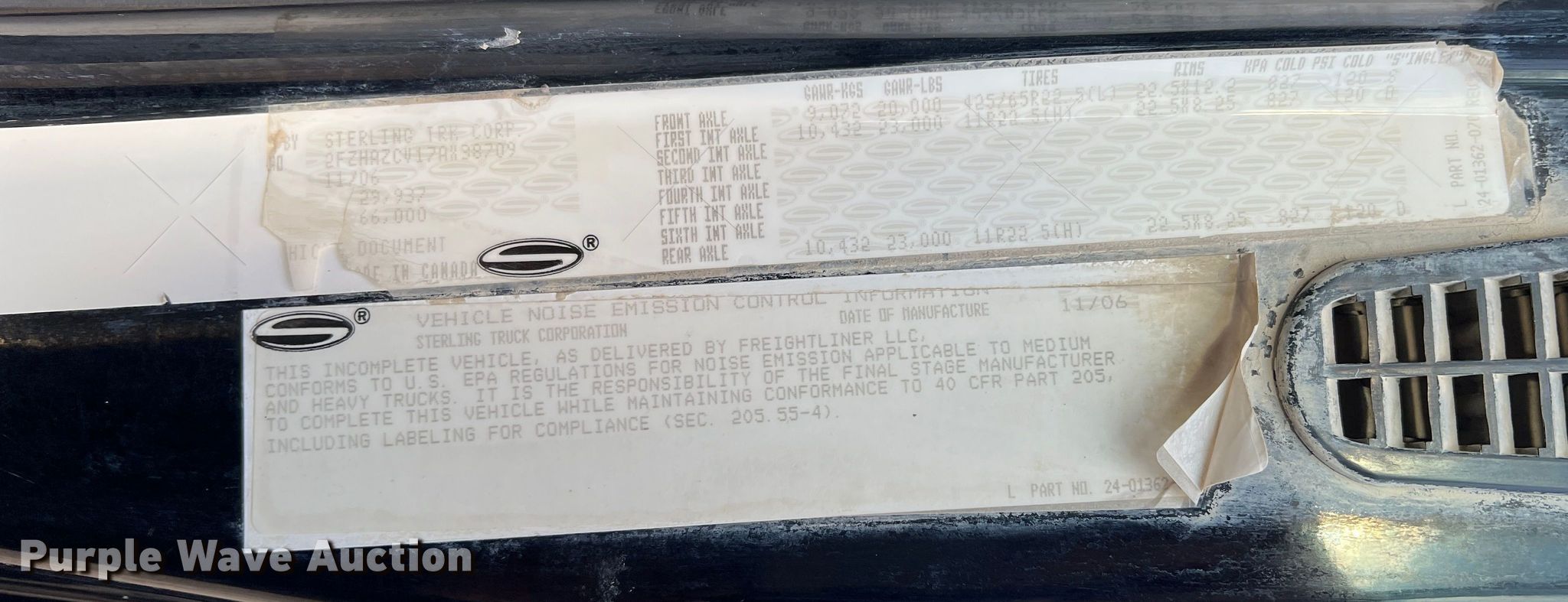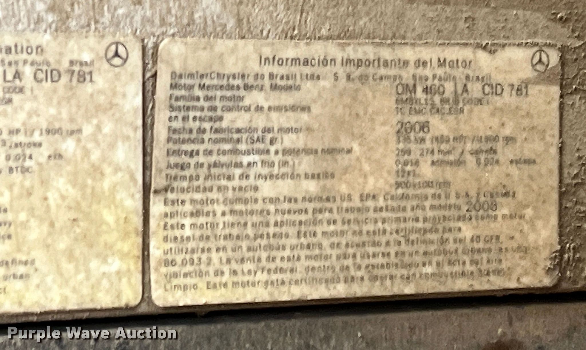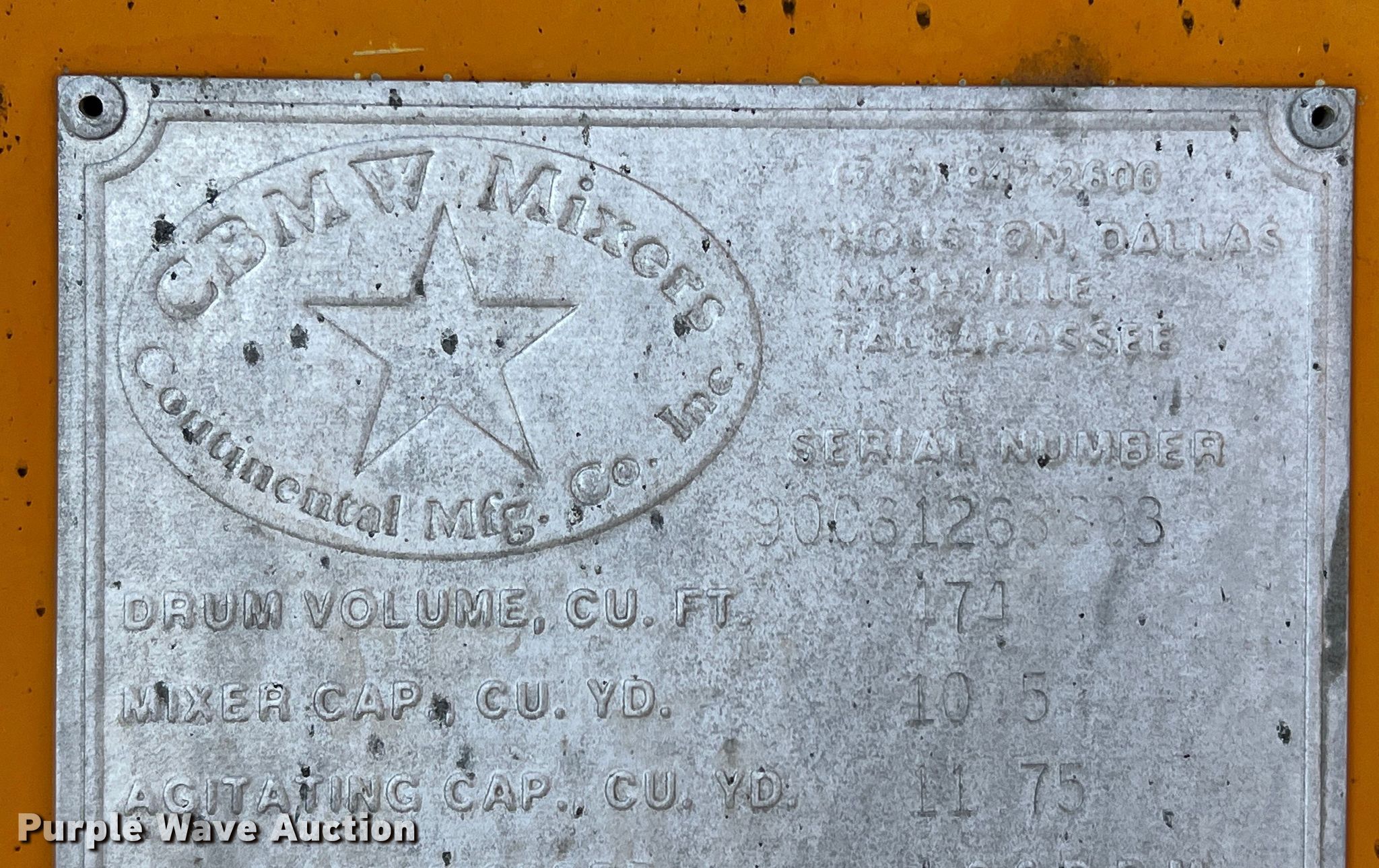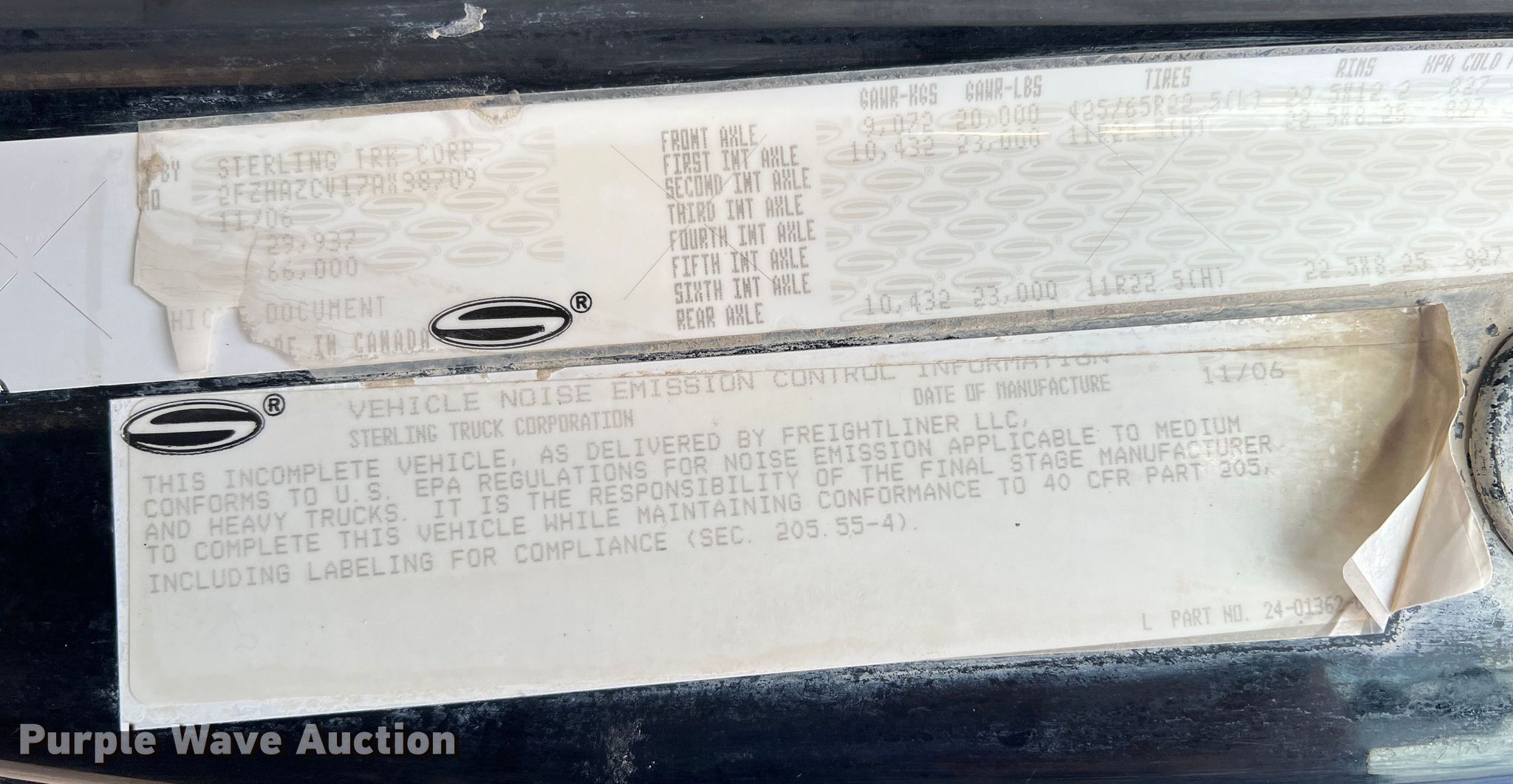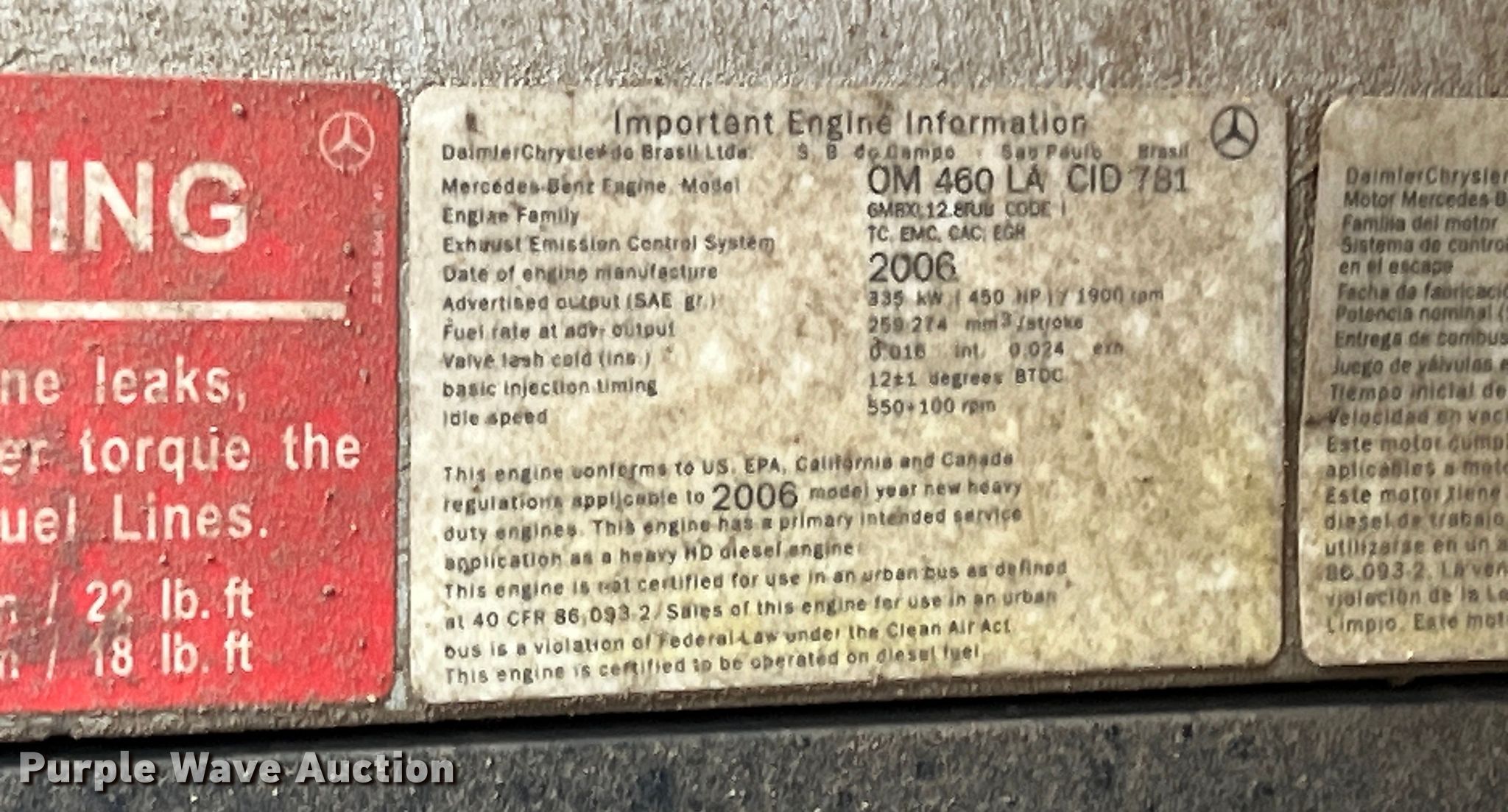 2007 Sterling L9500 ready mix truck. Miles: 319,134 on odometer, Hours: 32,964 on meter, VIN: 2FZHAZCV17AX38709. Engine Mercedes Benz OM 460 LA , Displacement: 12.0L, Cylinders: 6, Fuel type: Diesel. Transmission Automatic. Chassis Double frame, Axles: Tandem, Differential lock: Full, Suspension: Spring over walking beam, Brakes: Air, Front mount PTO, FAWR: 20,000 lbs, IAWR: 23,000 lbs, RAWR: 23,000 lbs. Interior AC, Heat, Cruise control. Features Mixer 2007 CBMW, Serial: 90C6126S693, Capacity: 10.5 cu.yd., Discharge: Rear, Bins: Aggregate, In-cab controls, Rear drum controls, Water tank capacity: 90 gallons, Chute Extensions: 3, Chute type: Steel.. Tires Front: 425/65R22.5, Rear: 11FR22.5. Notes Dash warning indicator: Check engine, Low coolant, Windshield chipped or cracked. Texas title. Title distribution may be delayed up to 30 days from verification of funds. R&L CONCRETE LLC. 1646 South Interstate 45 Service Road. Hutchins, TX 75141