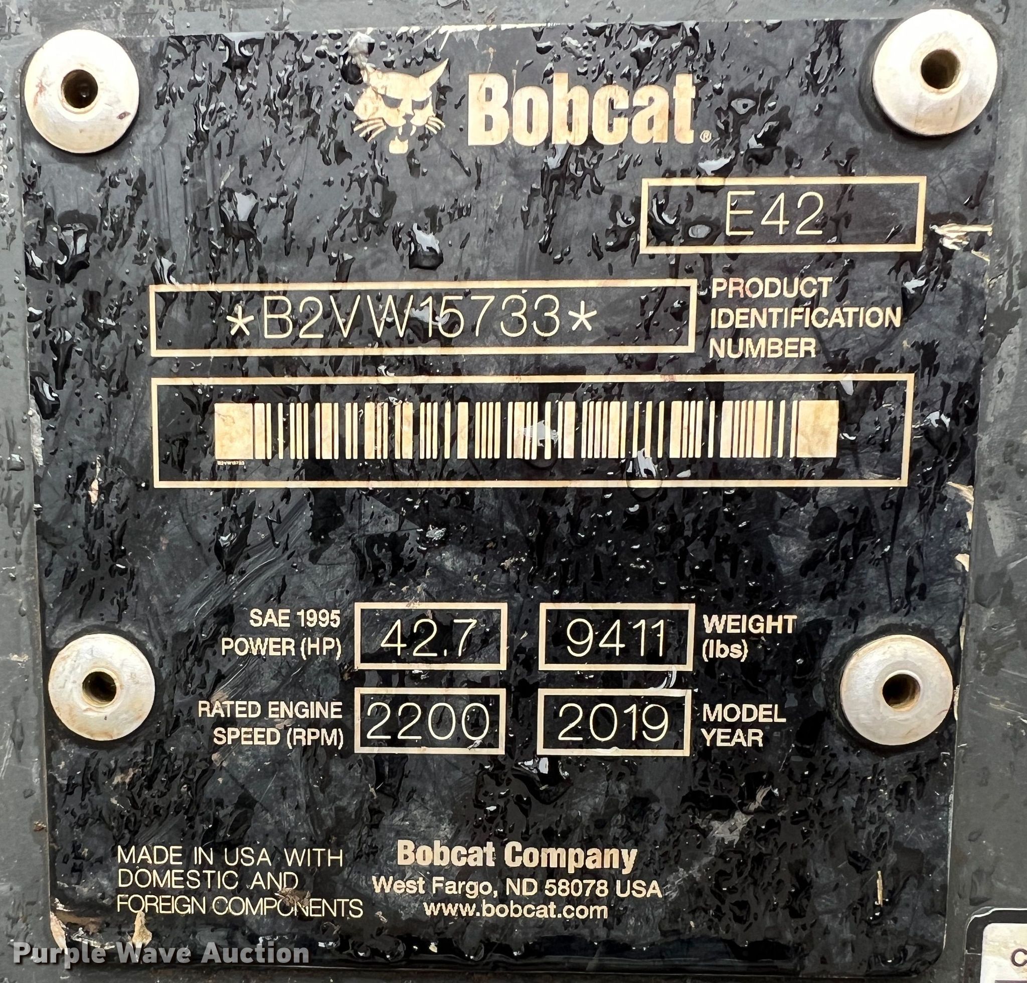 Purple Wave is selling a used Mini Excavator in Oklahoma. This item is a 2019 Bobcat E42 mini excavator with the following: Hours: 1,675 on meter, Serial: B2VW15733